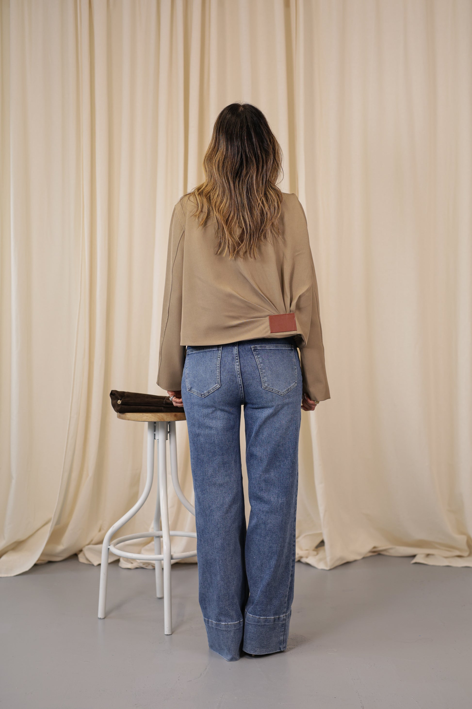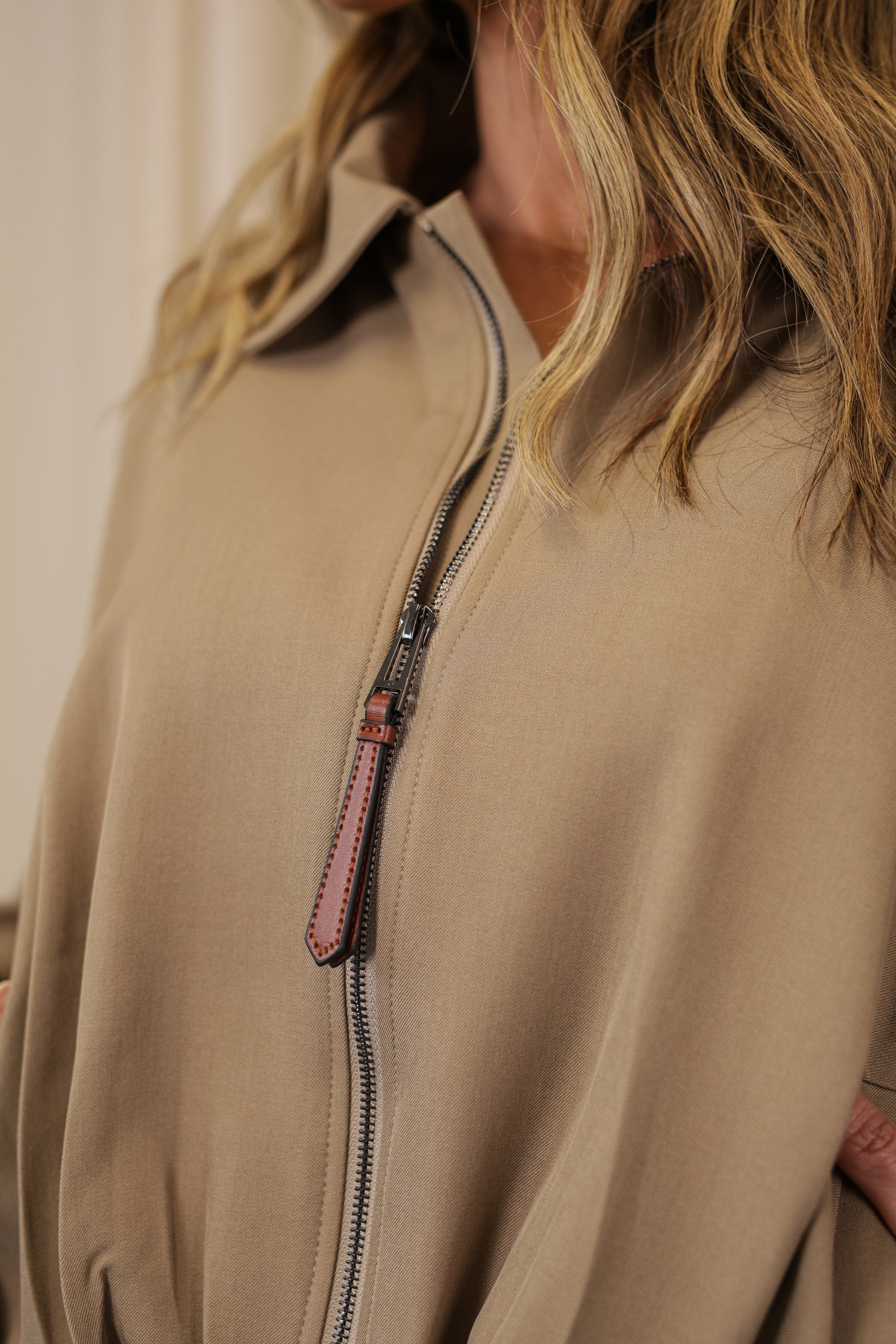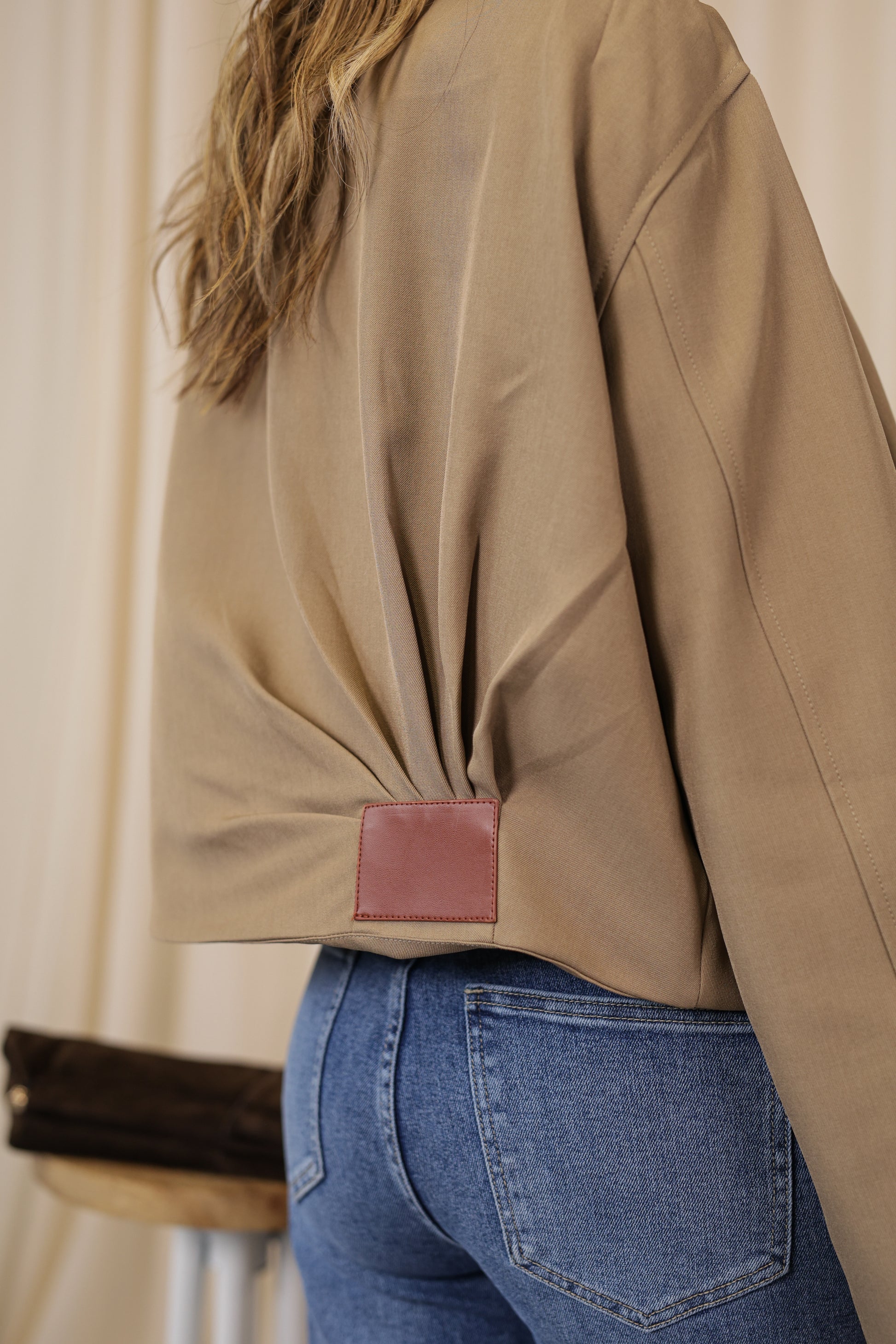 Casaco elegante e contemporâneo em tecido estruturado de toque suave, ideal para completar looks sofisticados do dia a dia. Apresenta corte ligeiramente curto e solto, com fecho frontal de correr e gola discreta que confere um visual moderno e versátil. As mangas compridas com volume subtil acrescentam conforto e estilo, enquanto os bolsos laterais embutidos garantem funcionalidade. Destaca-se ainda pelo detalhe nas costas com aplicação, que adiciona um toque diferenciador e atual.