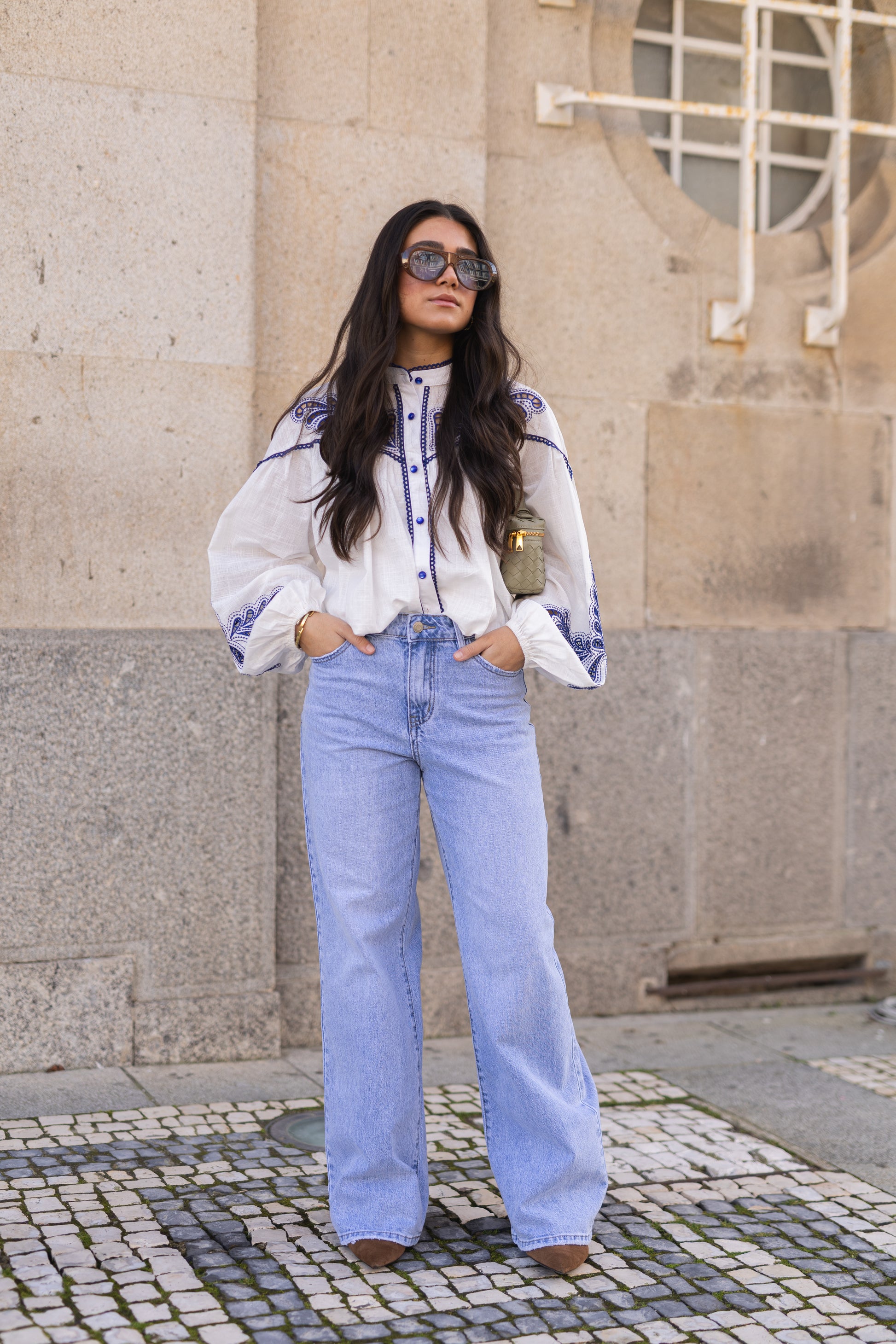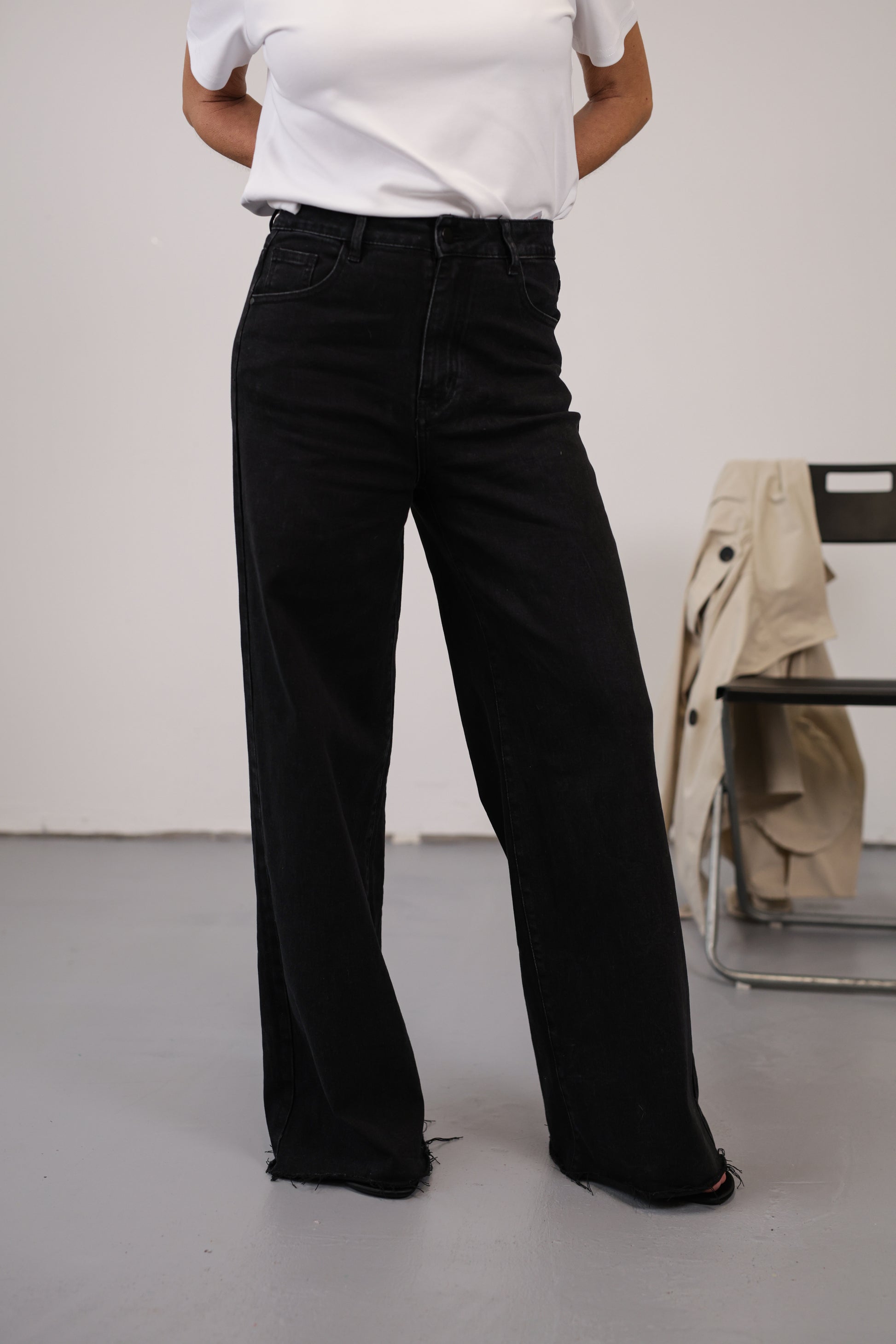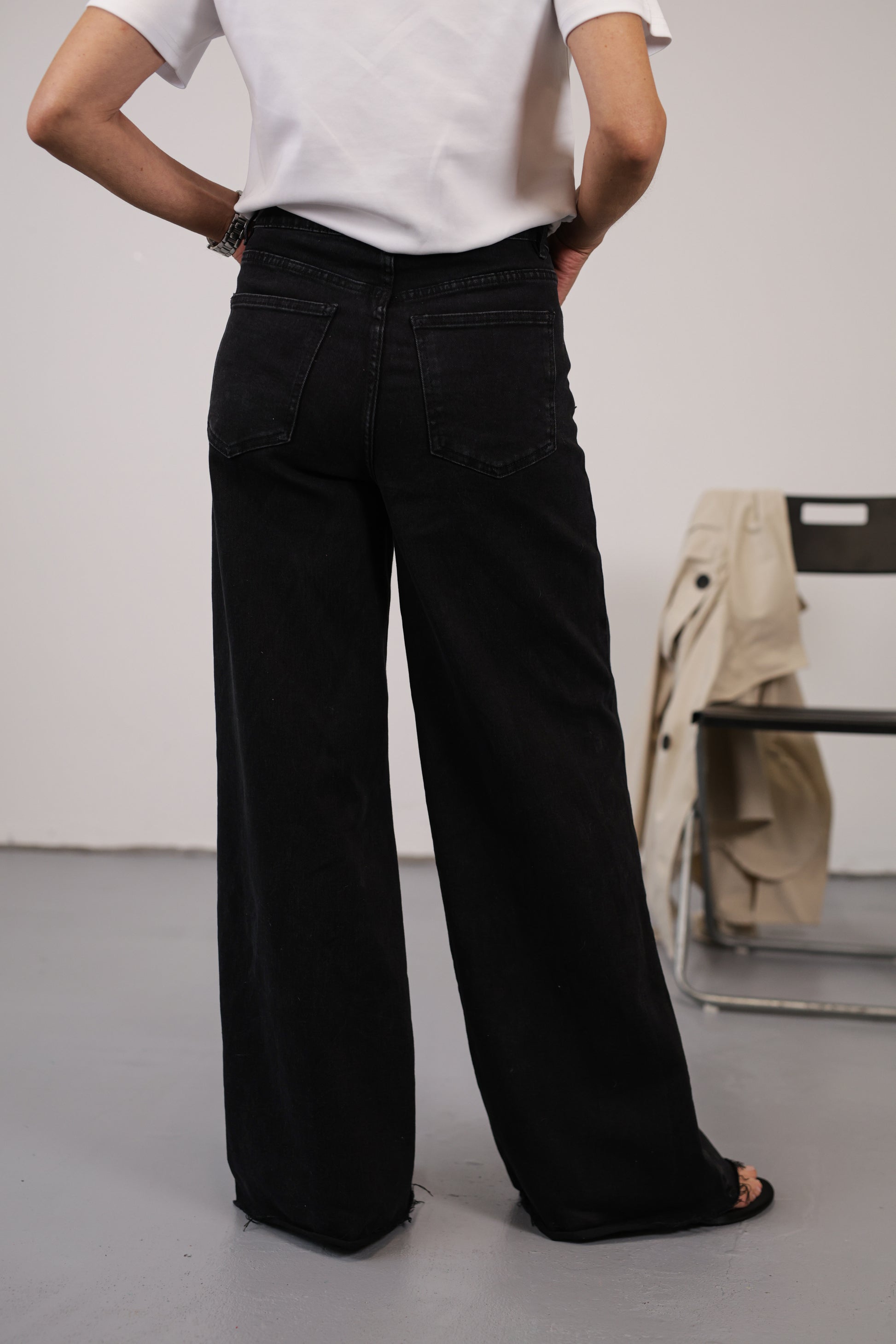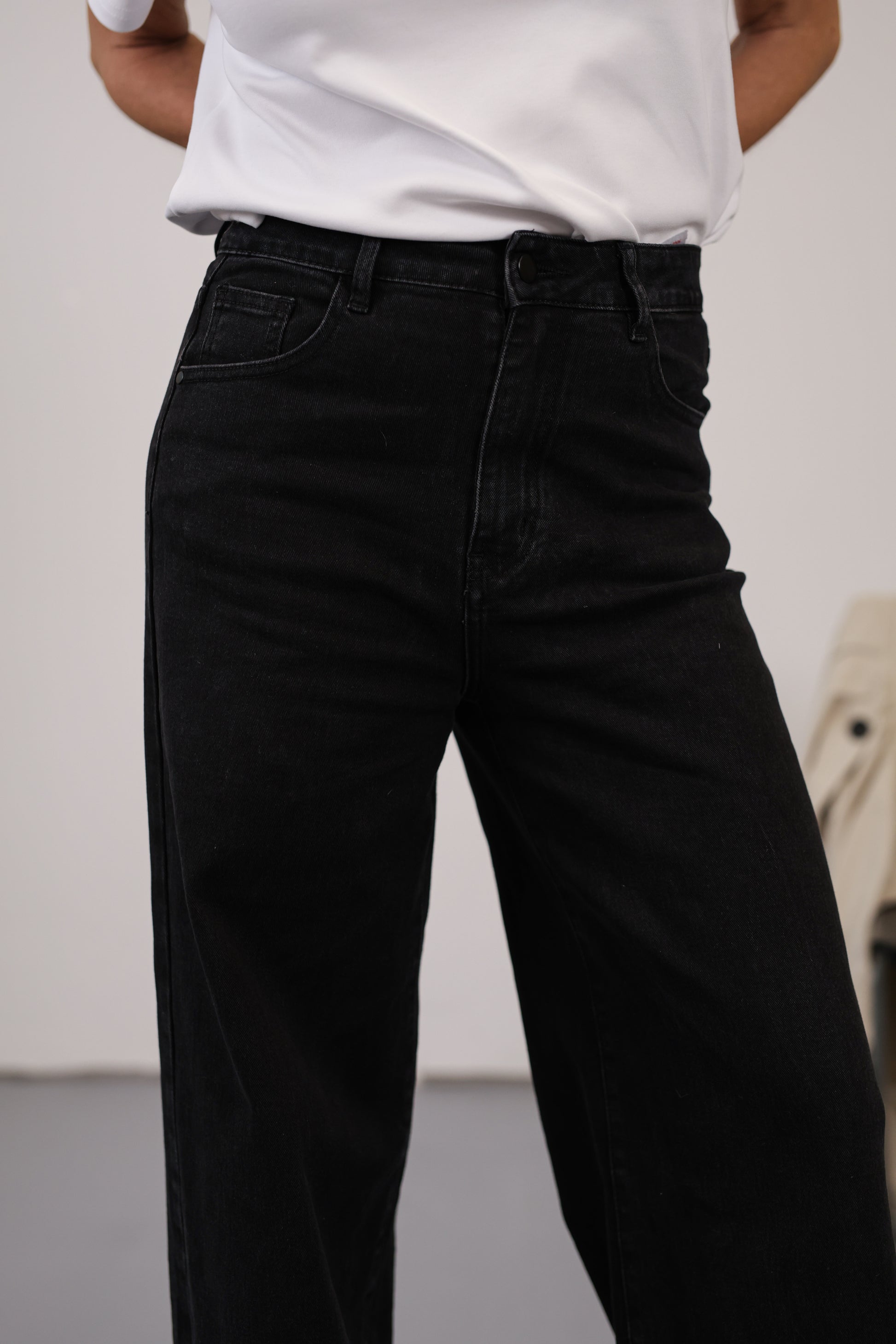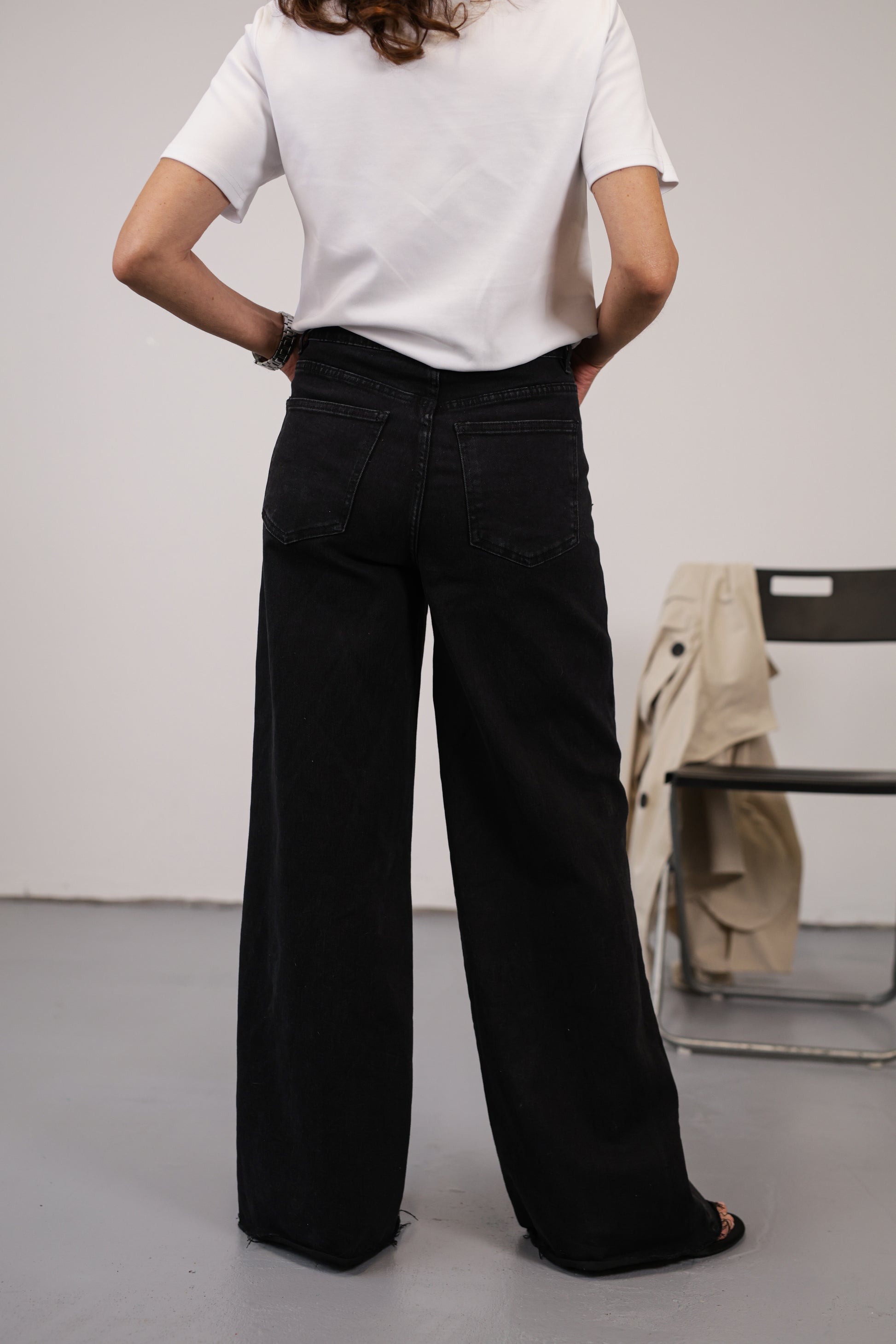 Jeans wide leg em denim. Cintura subida com presilhas e design de cinco bolsos. Fecho frontal com botão e fecho de correr. Corte solto e perna ampla.