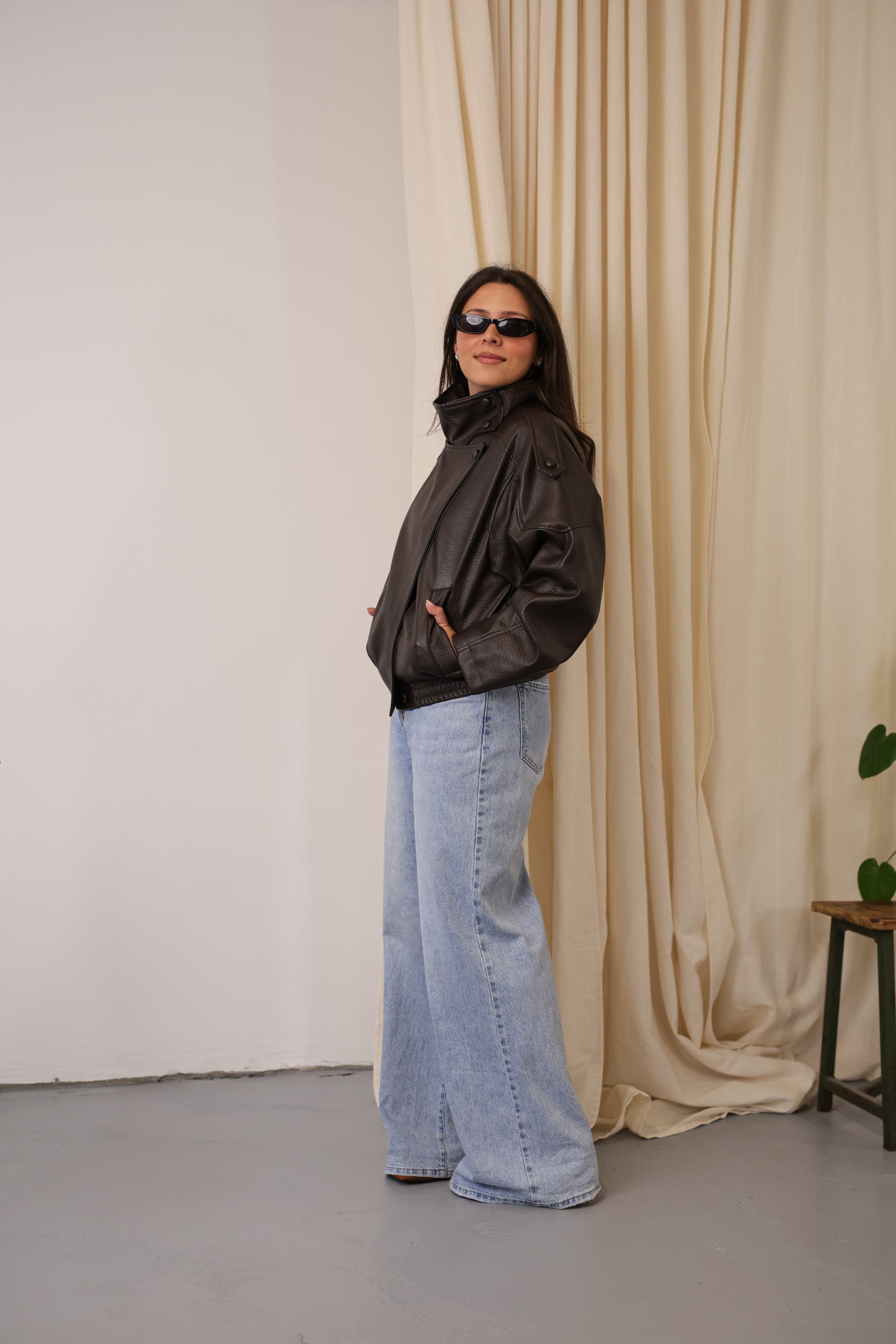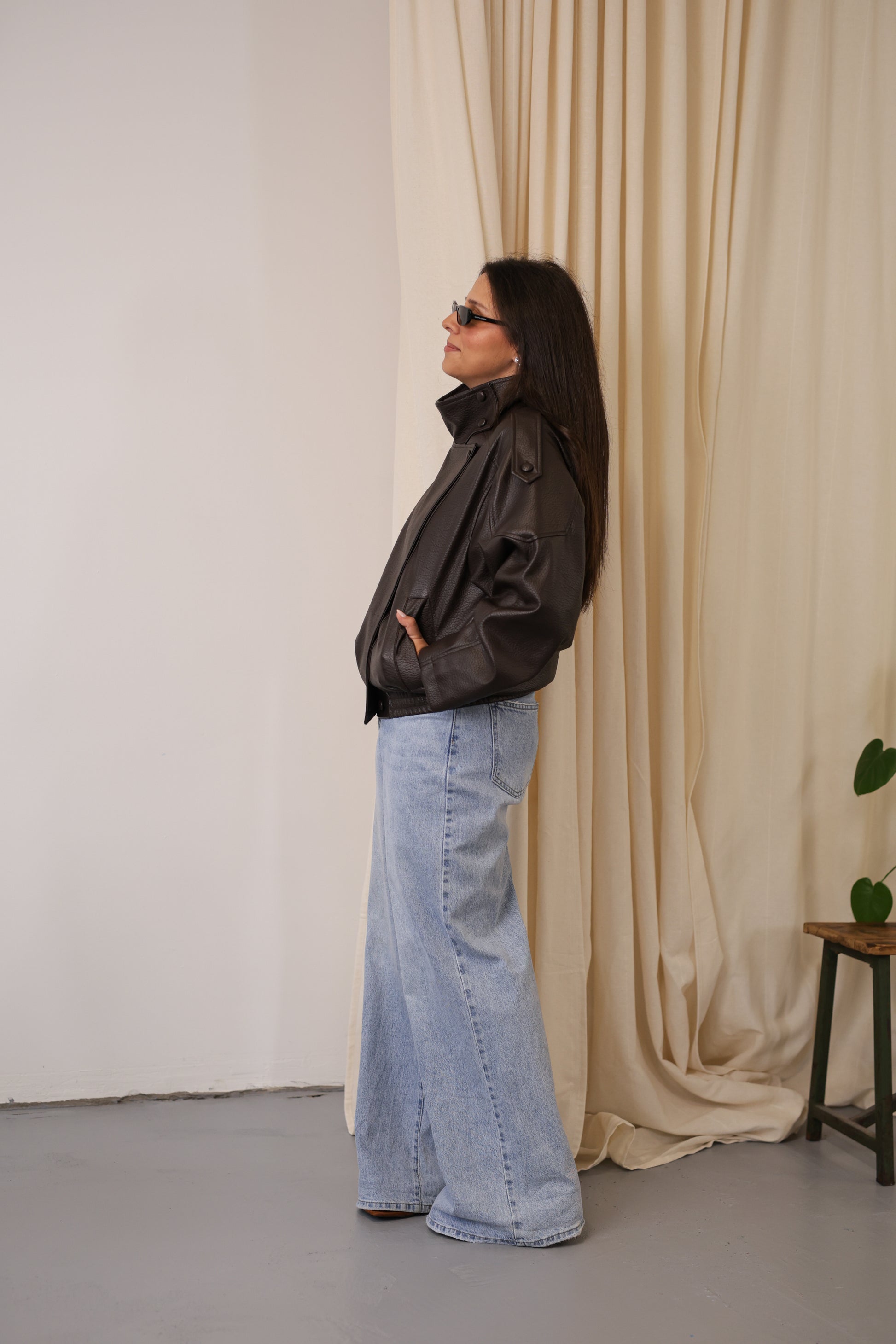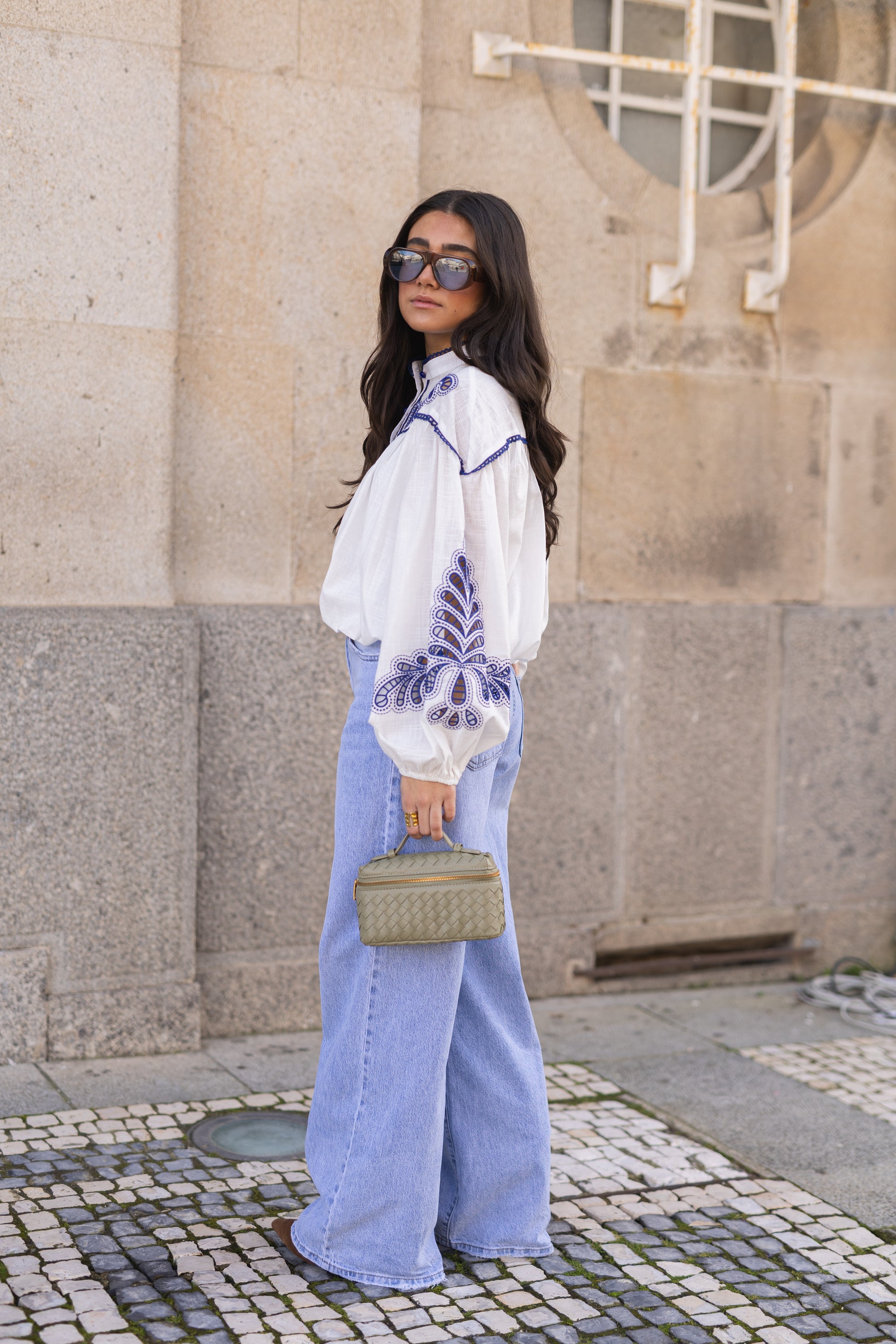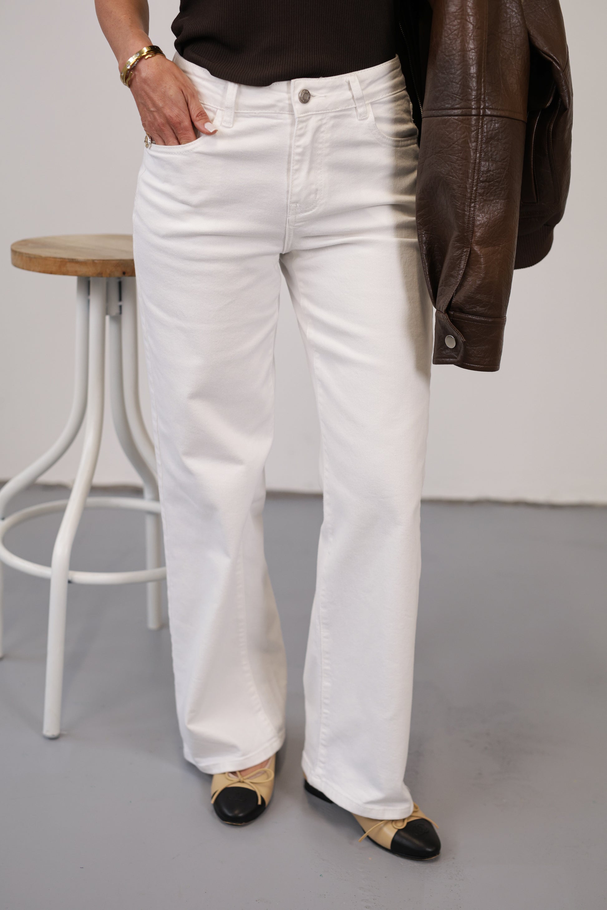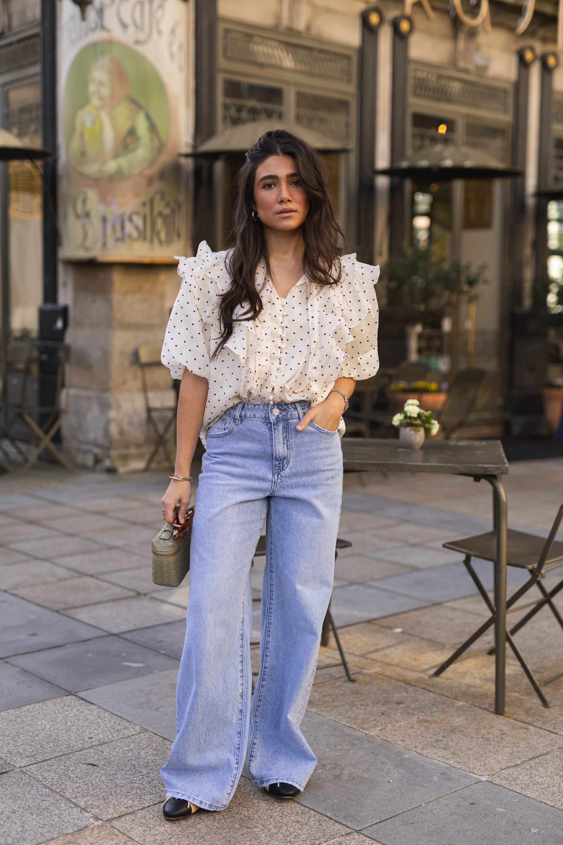 Jeans wide leg em denim. Cintura subida com presilhas e design de cinco bolsos. Fecho frontal com botão e fecho de correr. Corte solto e perna ampla.