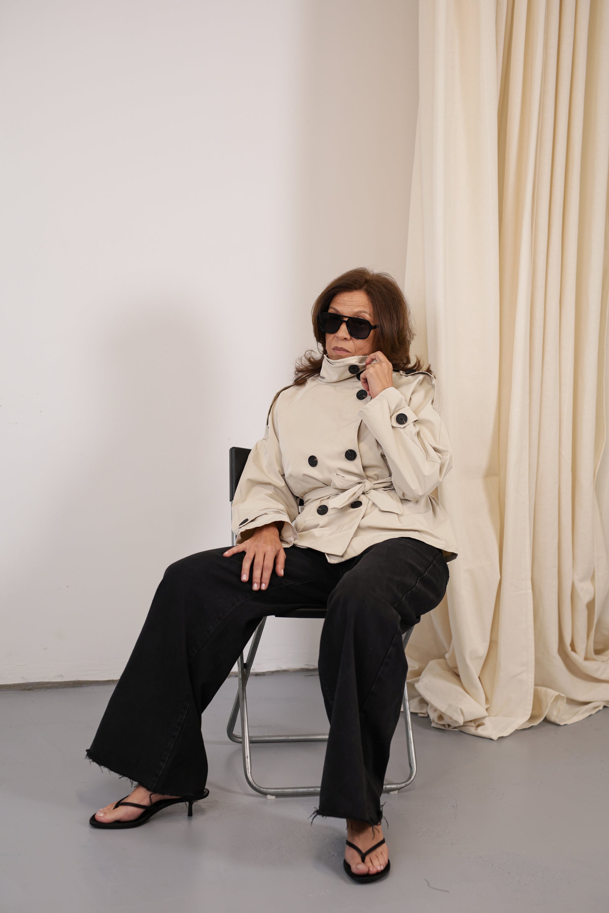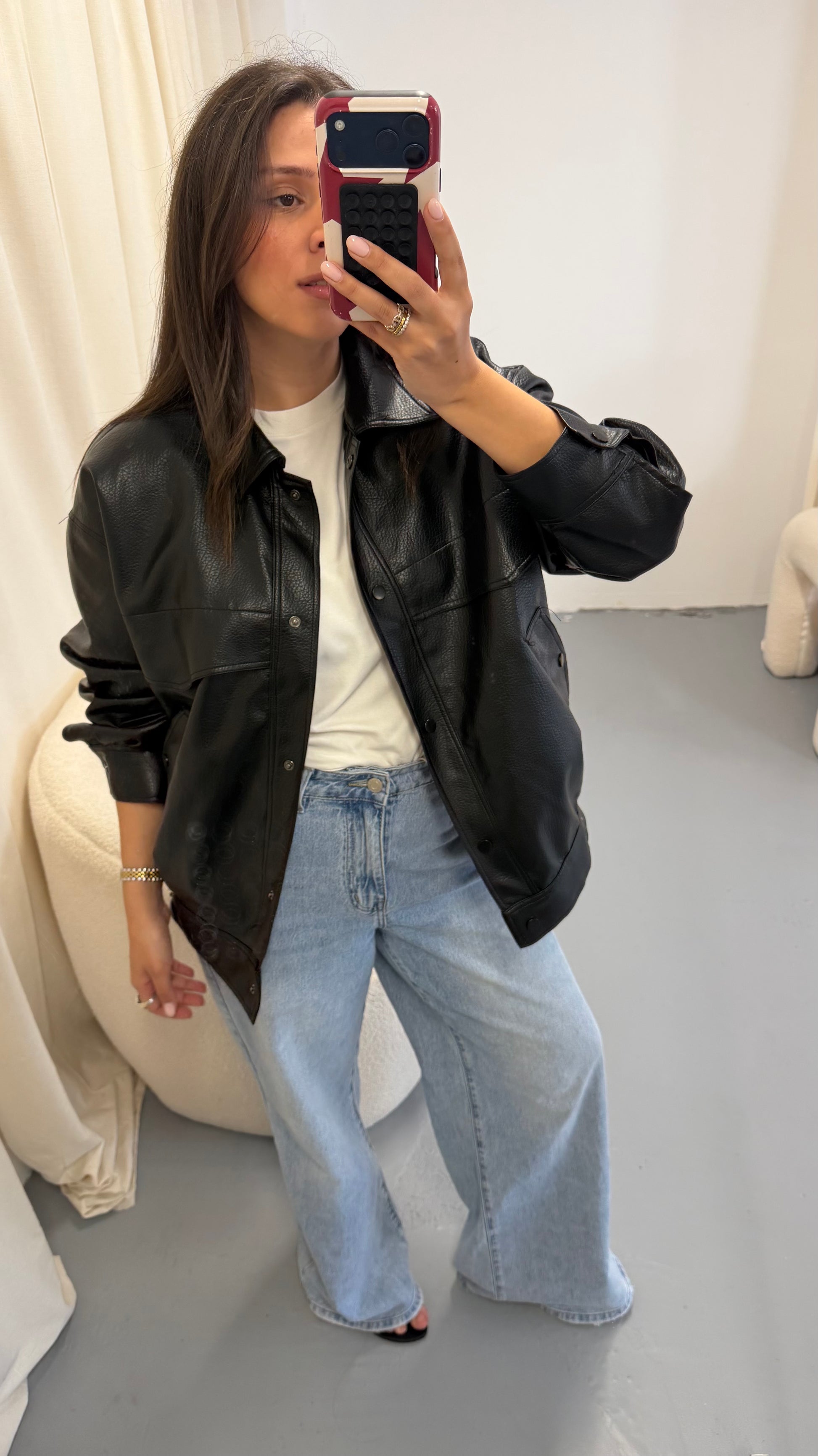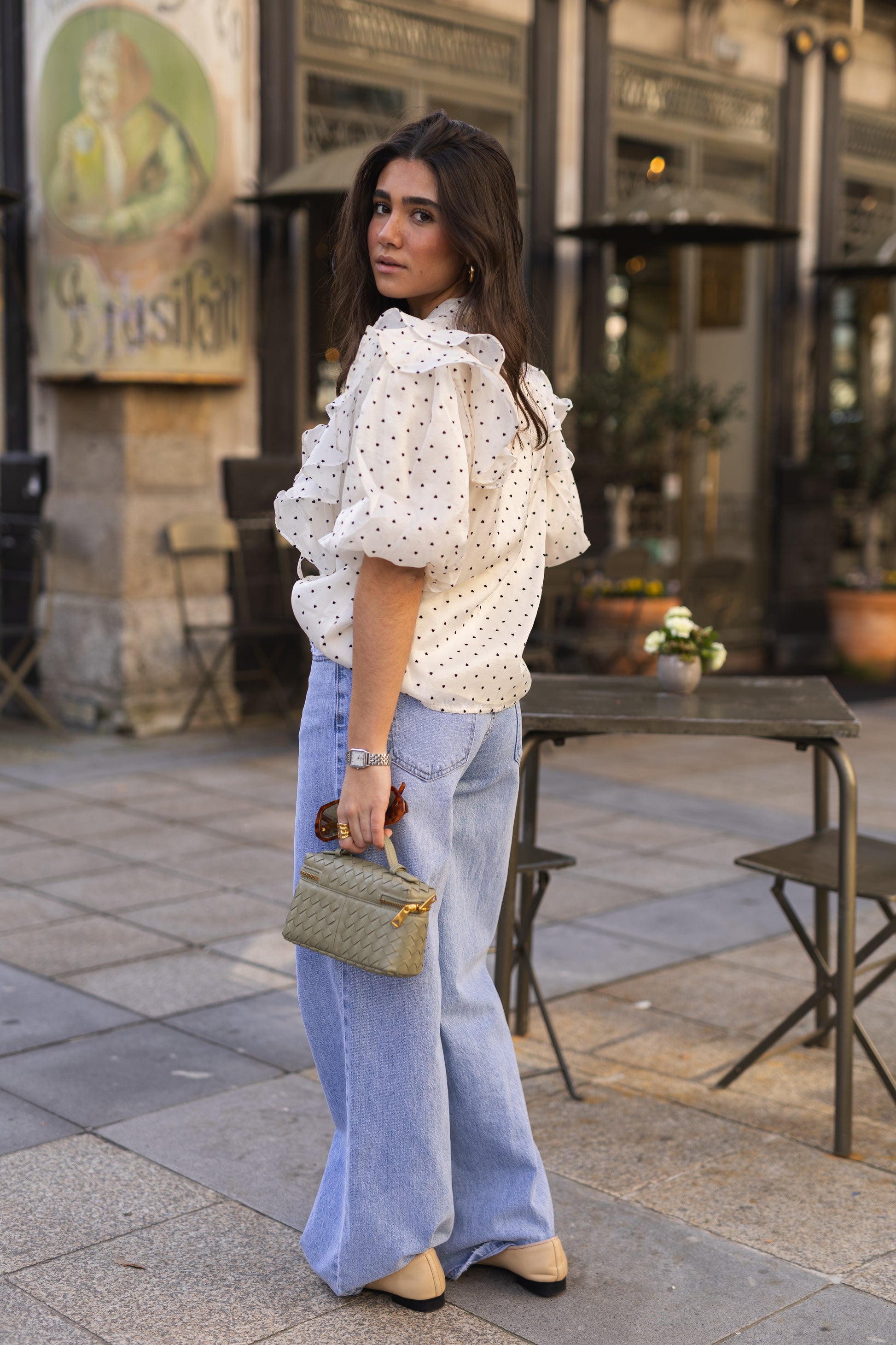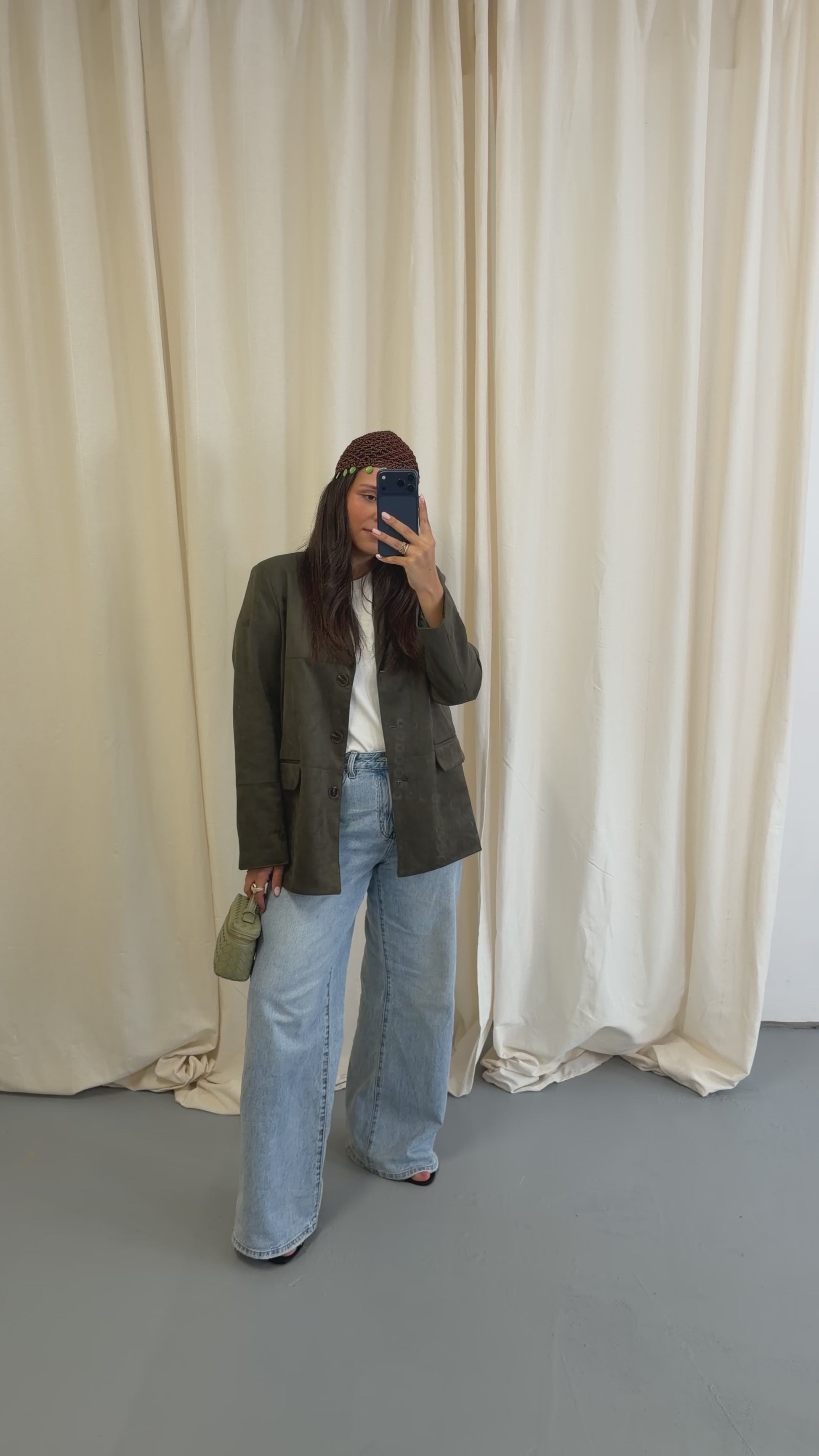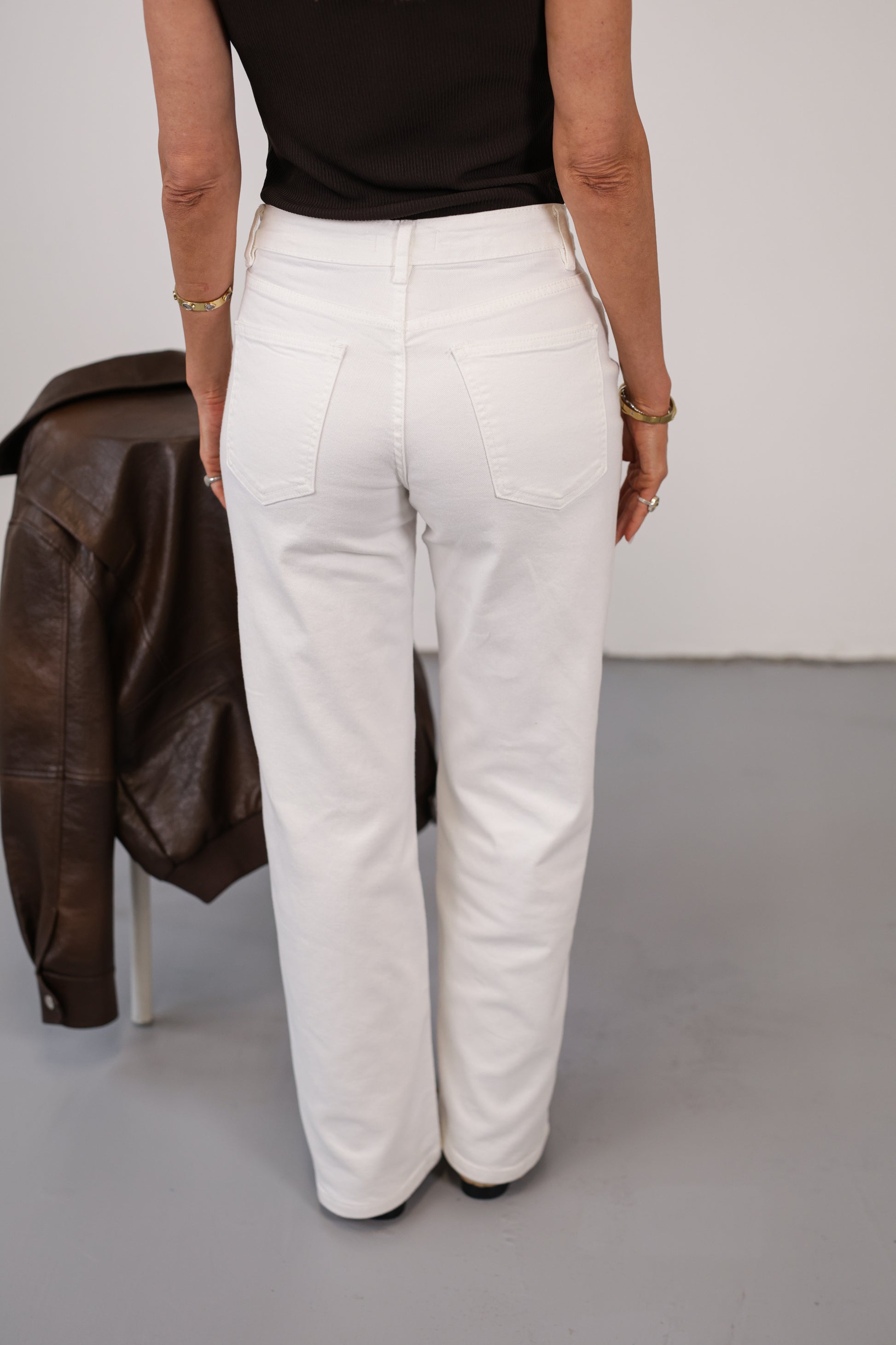 Jeans wide leg em denim. Cintura subida com presilhas e design de cinco bolsos. Fecho frontal com botão e fecho de correr. Corte solto e perna ampla.