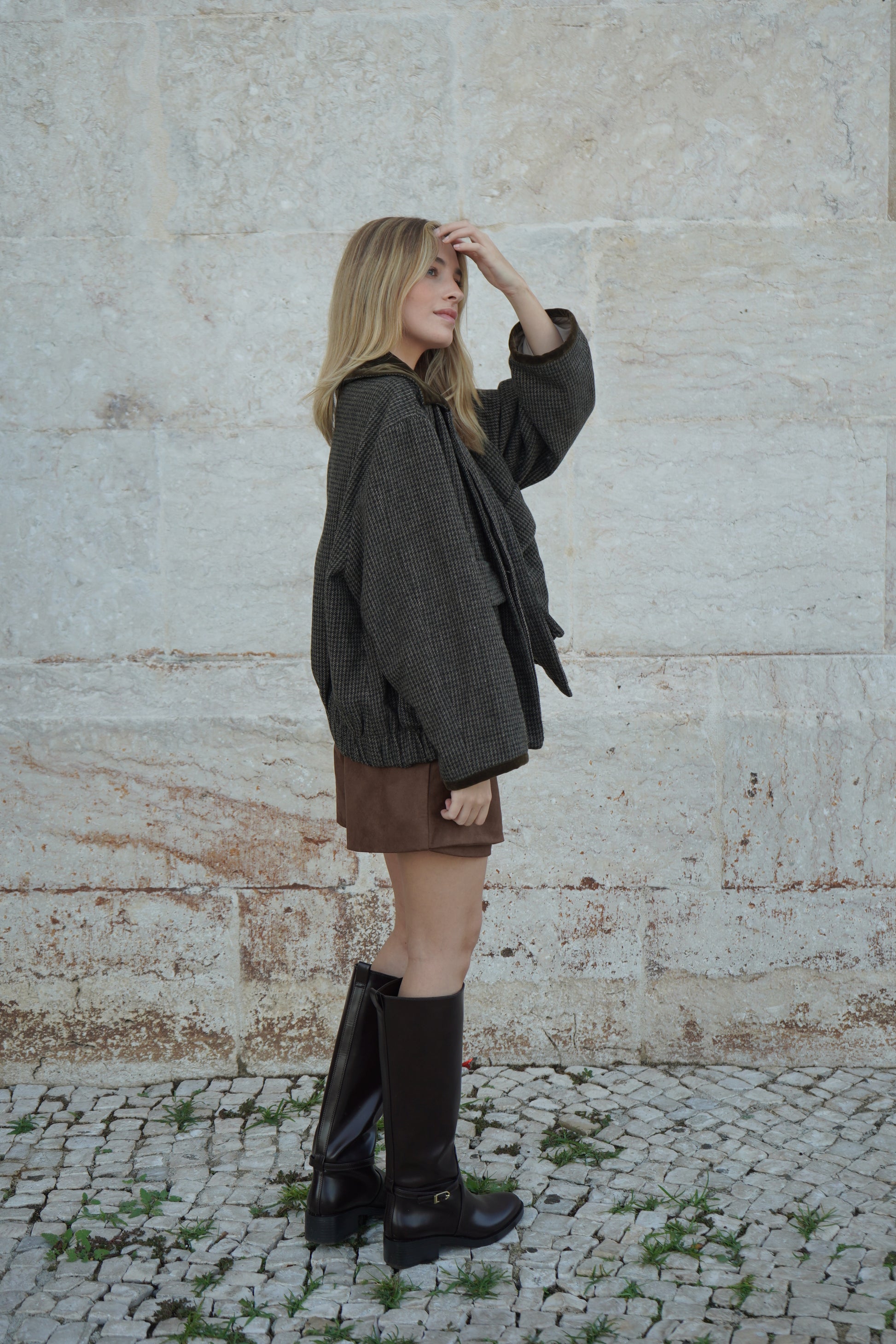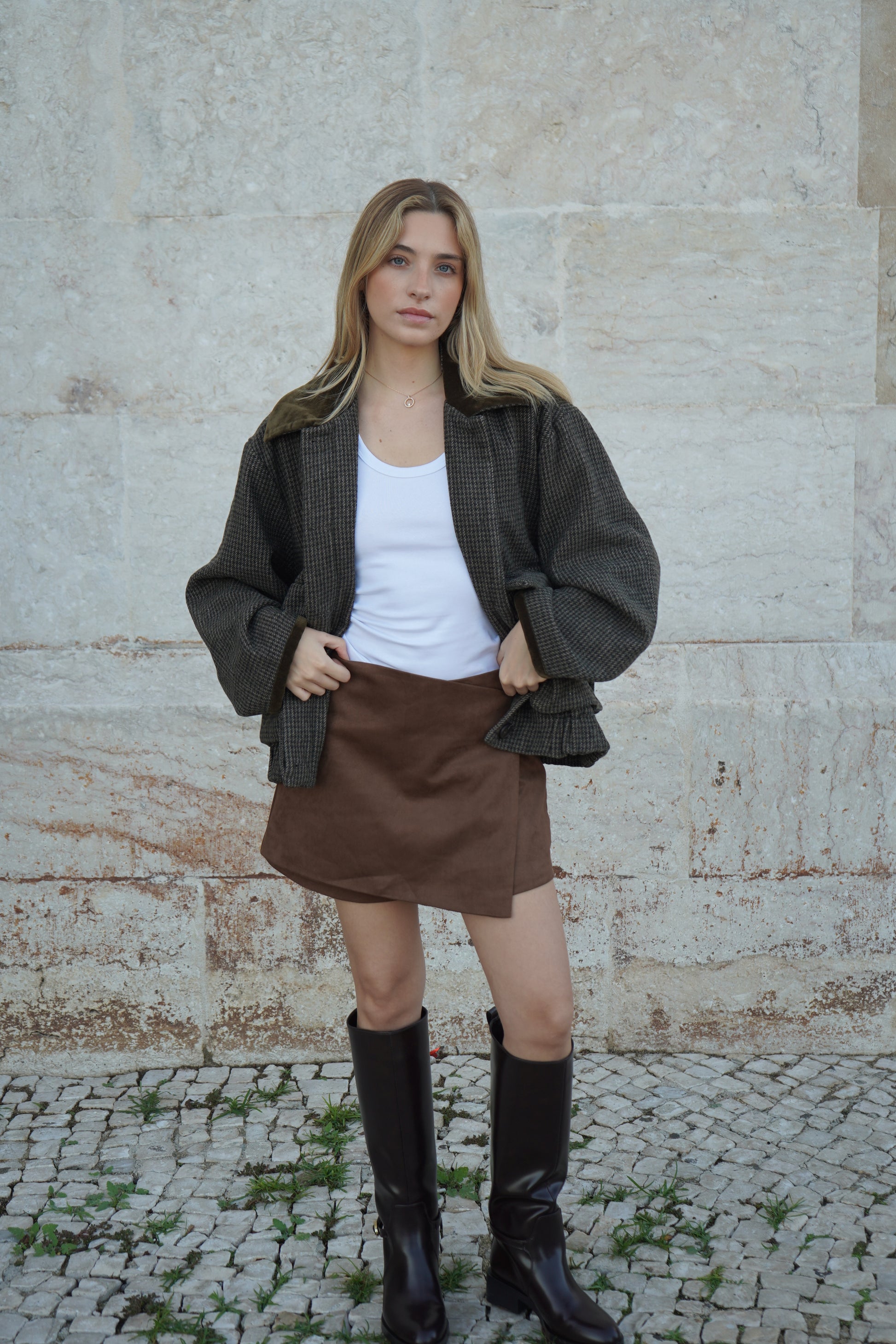 Casaco em tecido texturado e aspeto rústico. Modelo de corte amplo, com gola contrastante em veludo e mangas largas para um efeito descontraído e elegante. Apresenta acabamento franzido na parte inferior e bolsos frontais.