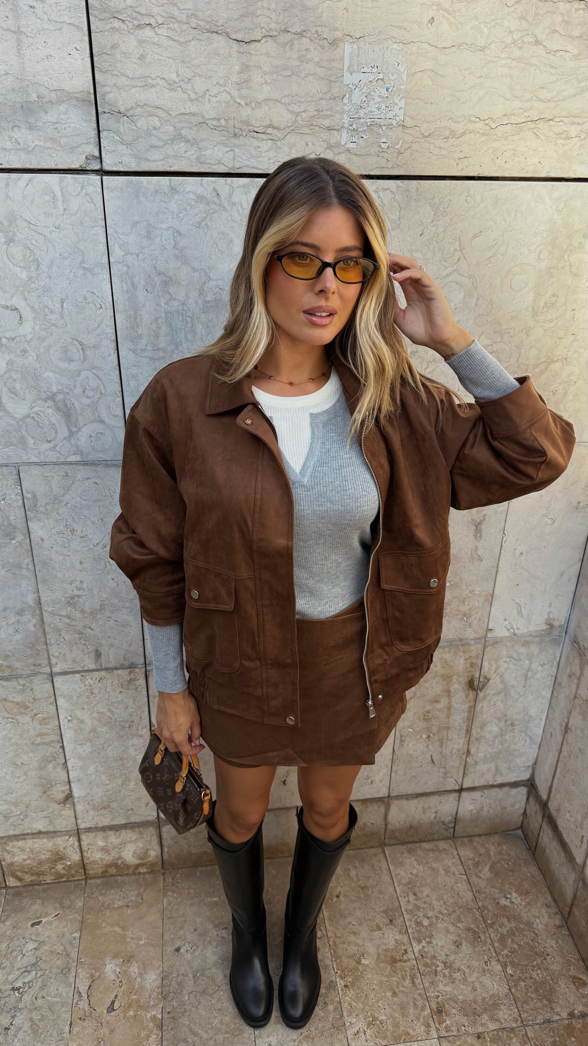 Casaco em camurça sintética de toque suave. Modelo de corte reto com fecho de correr frontal e bolsos com pala e botões metálicos. Detalhe elástico na barra.