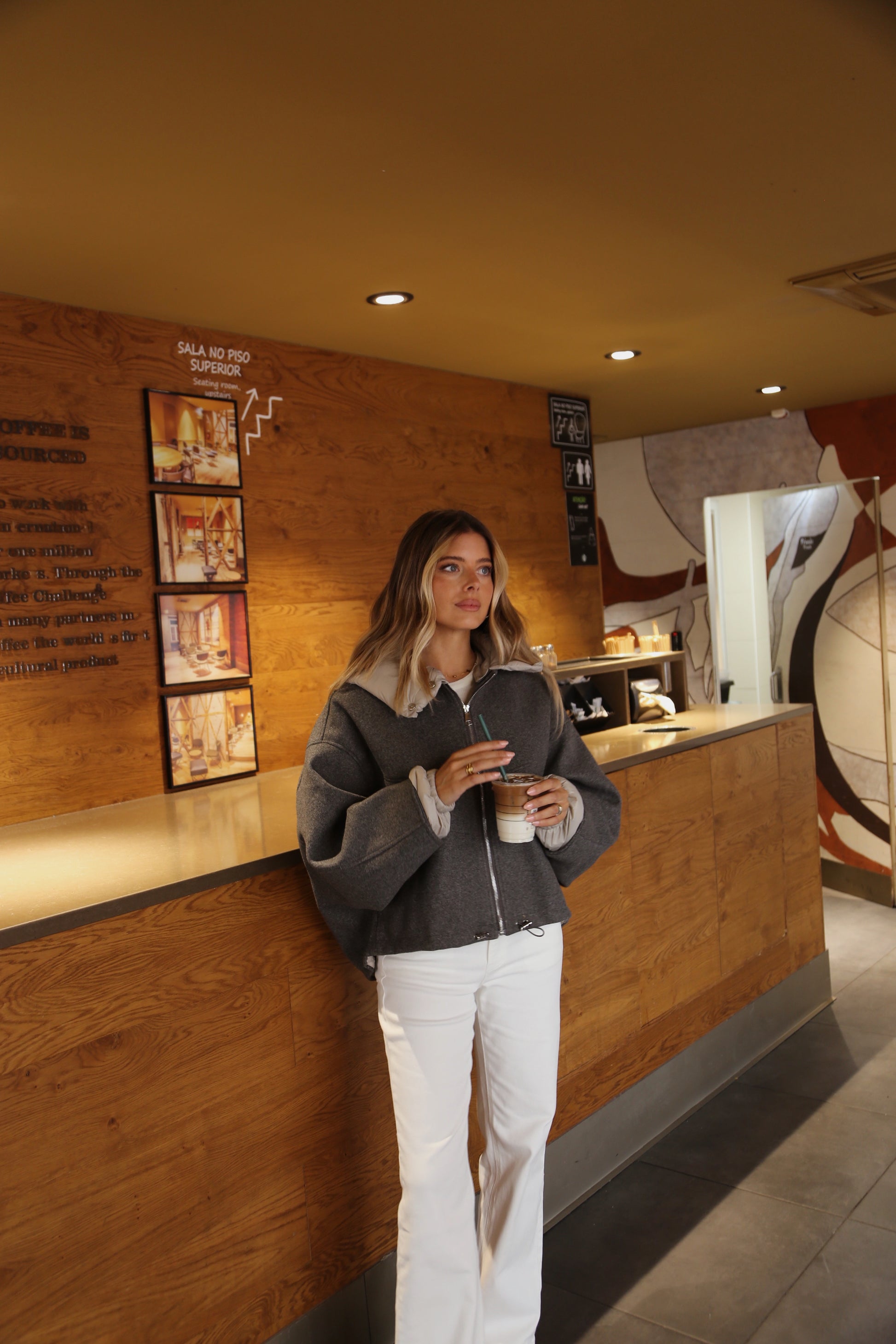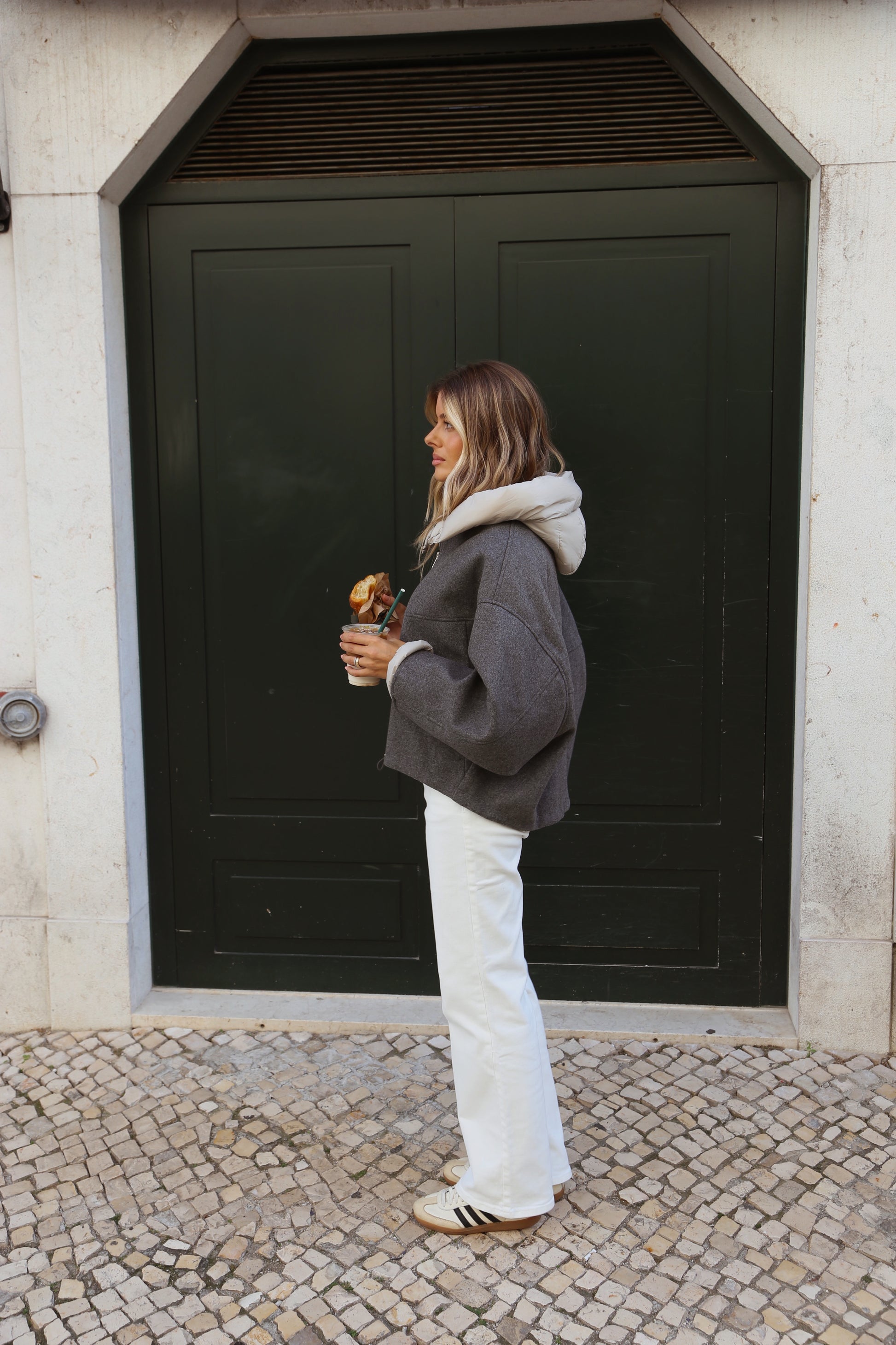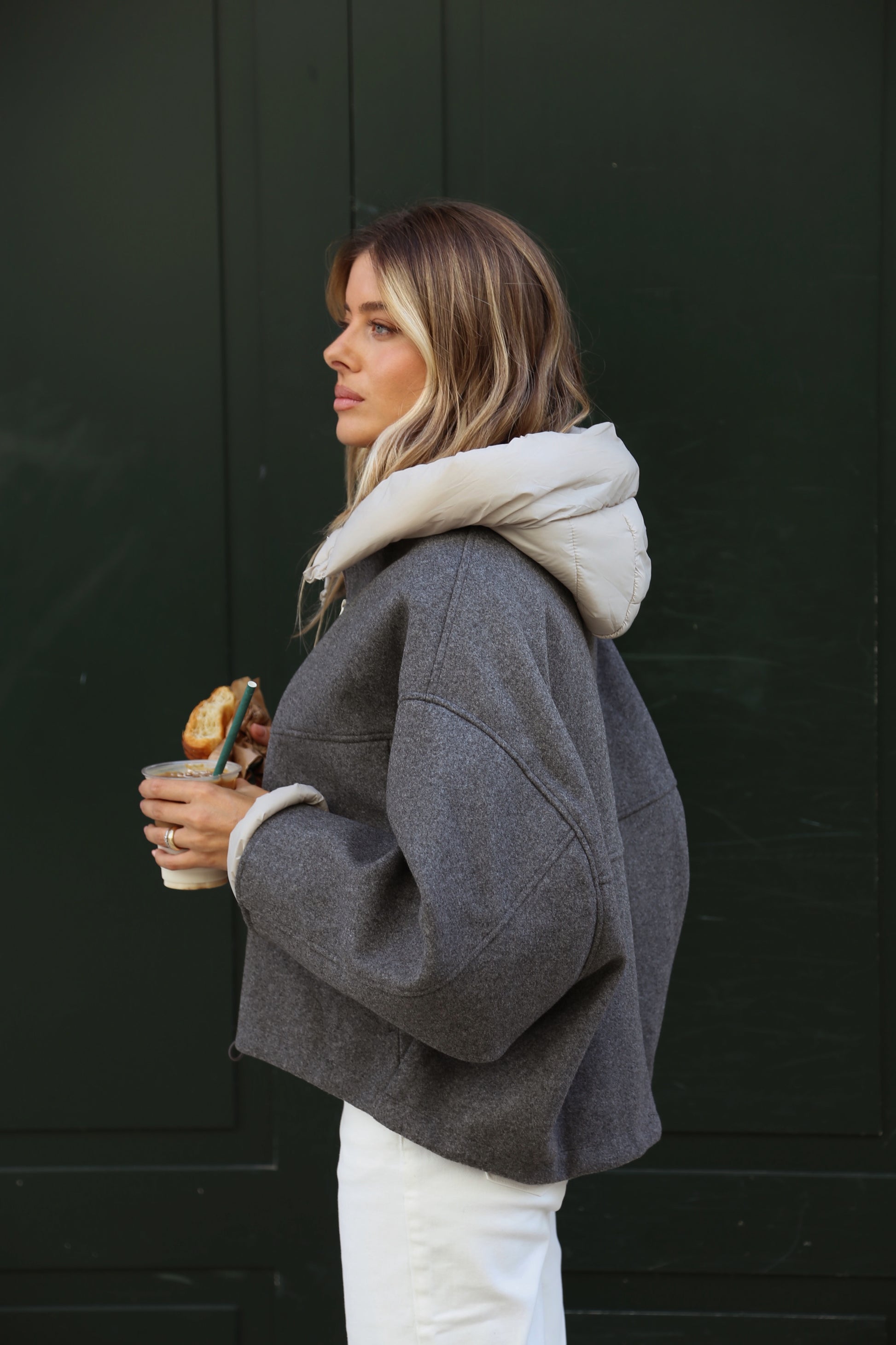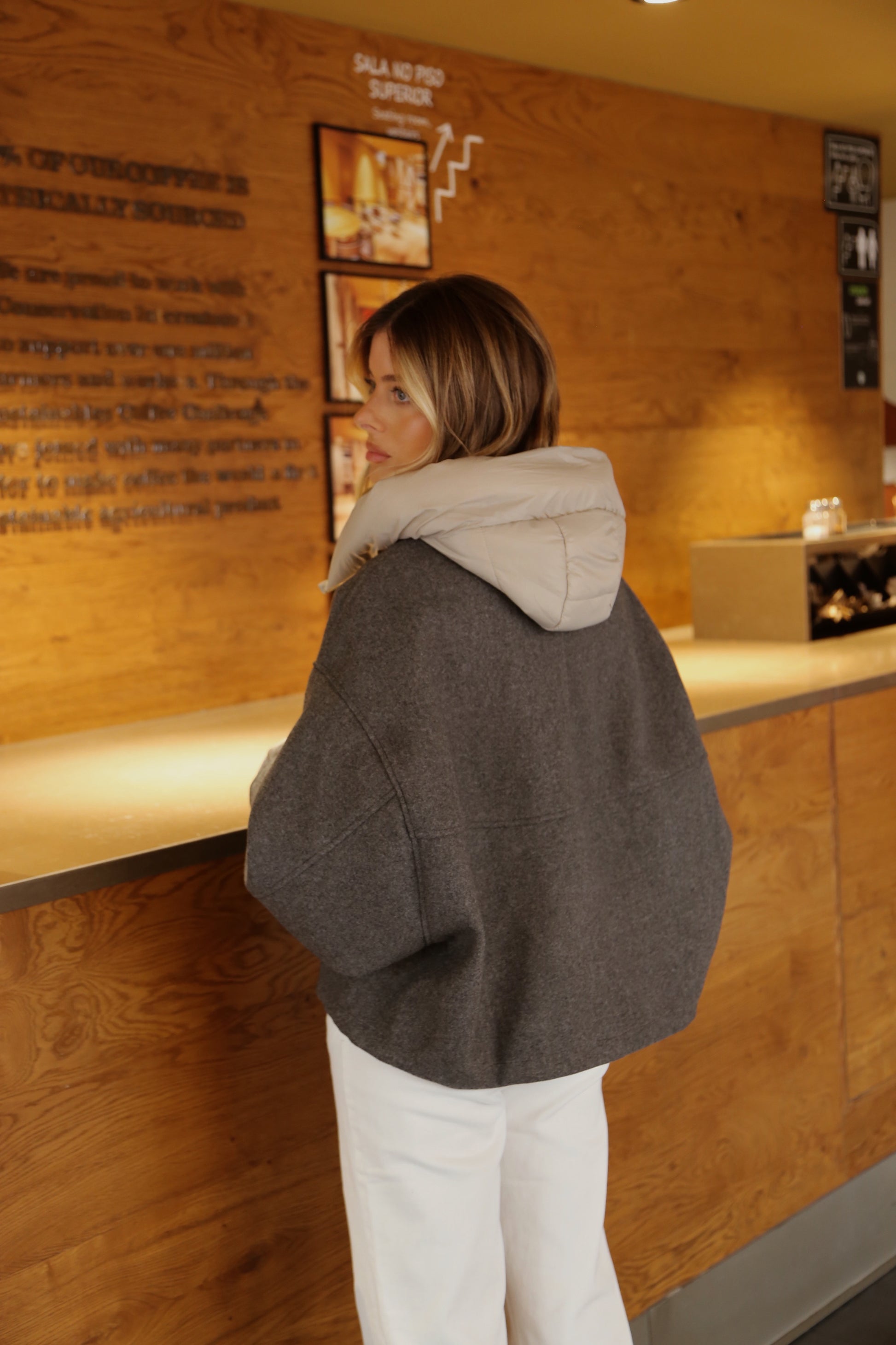 Casaco efeito lã com capuz acolchoado. Modelo de corte amplo e caimento descontraído, com fecho de correr frontal e bolsos laterais discretos. O contraste entre o corpo em lã e o capuz em nylon confere um toque moderno e sofisticado.