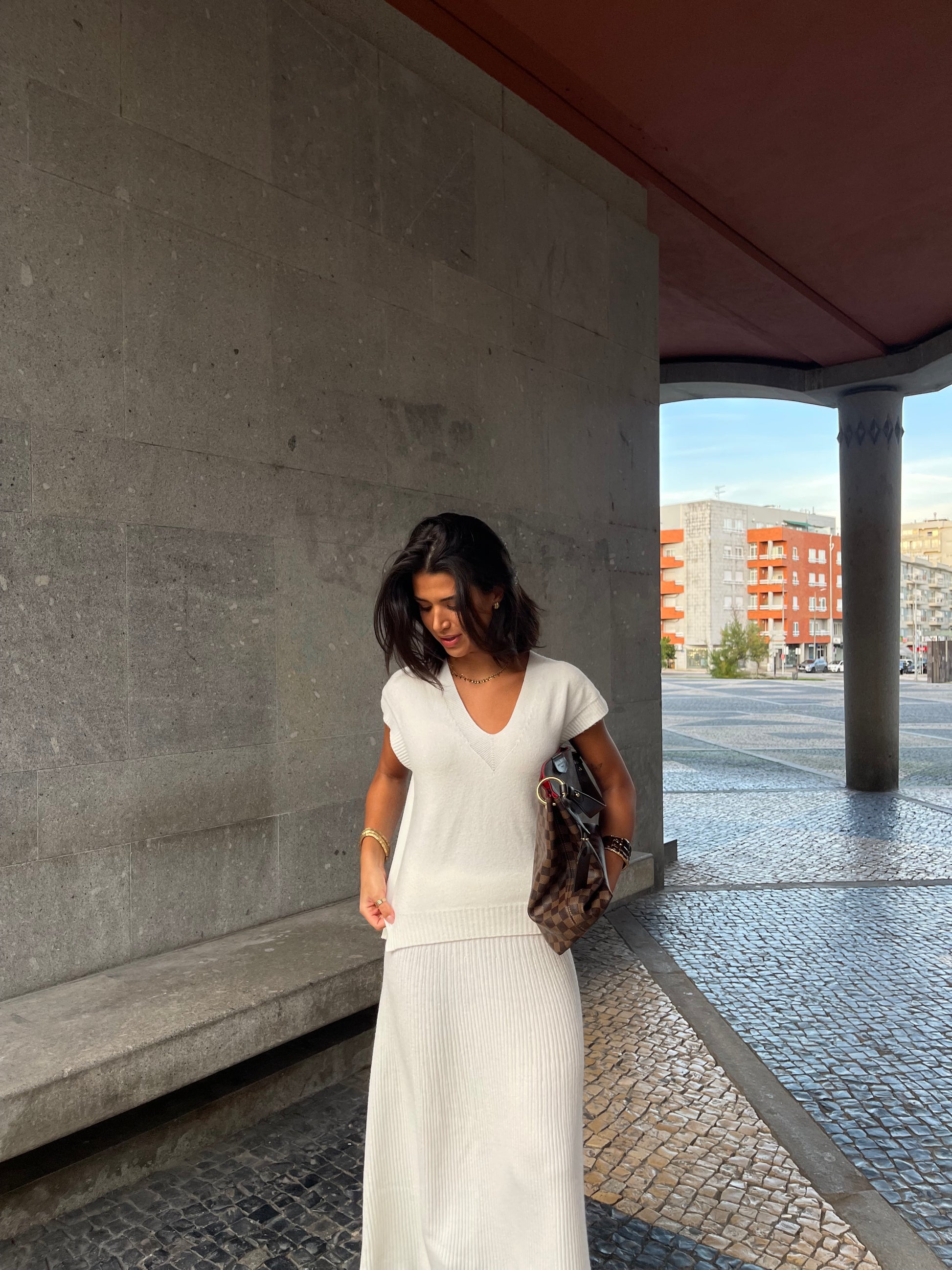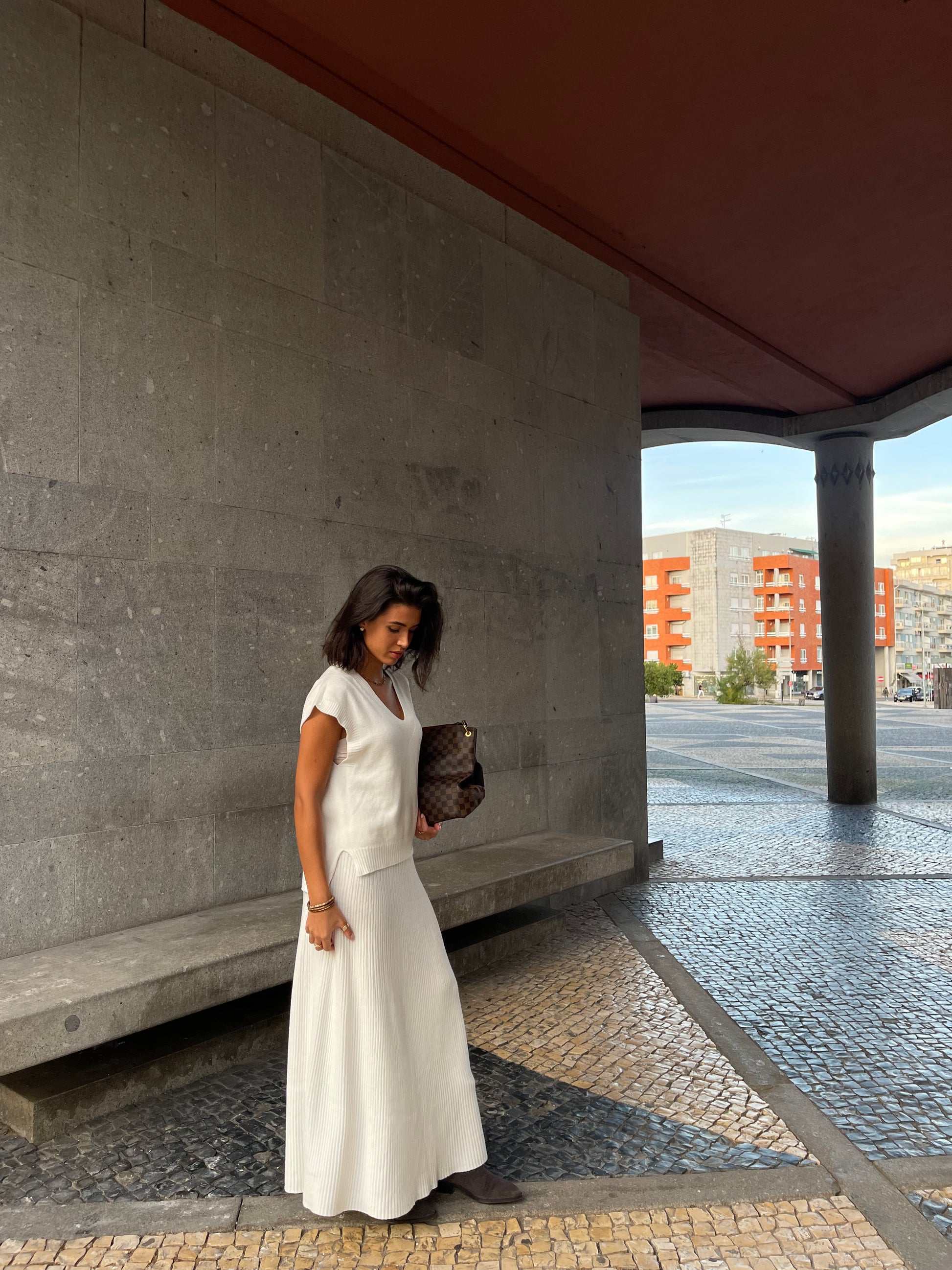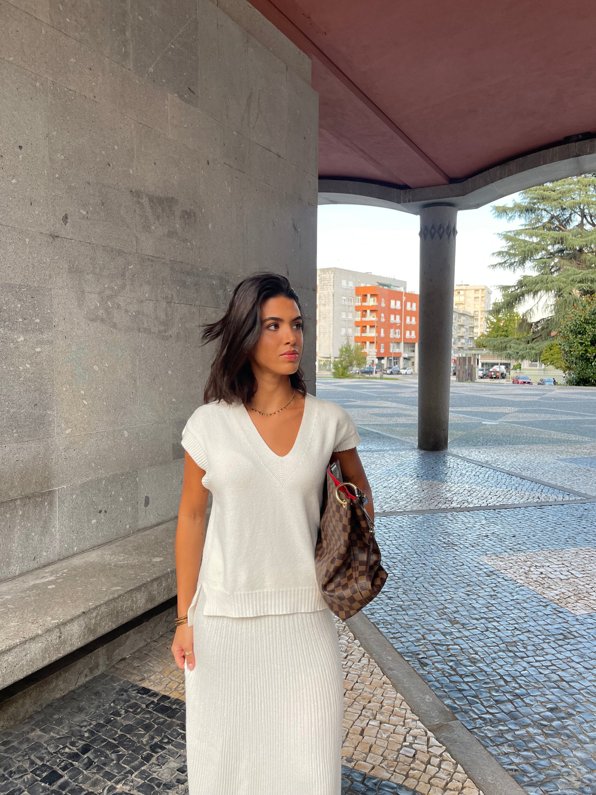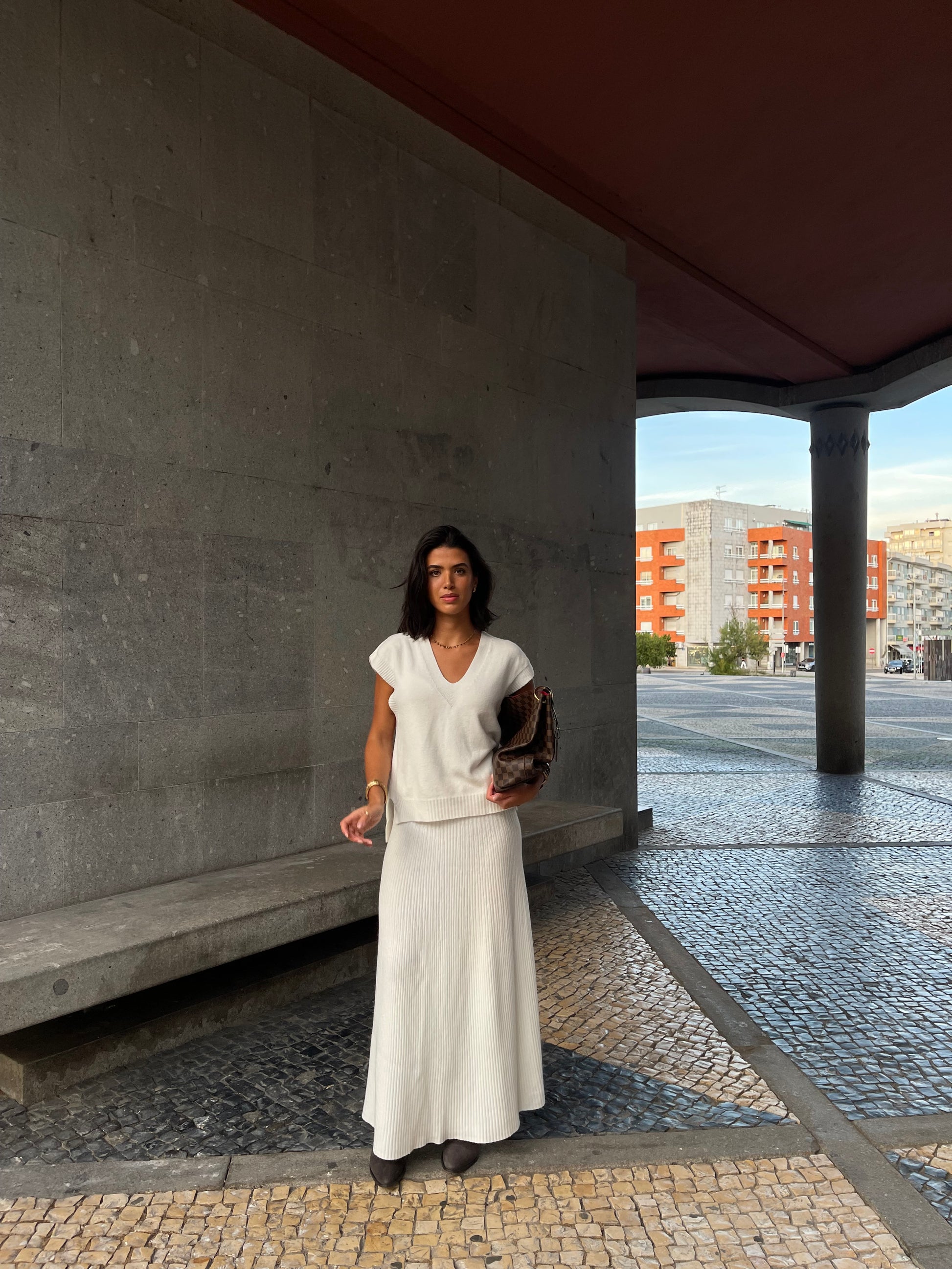 Coordenado em malha canelada de textura marcada. Top sem mangas de corte reto, decote em V profundo e pequenas aberturas laterais que conferem leveza à silhueta. Saia longa de cintura média, estrutura fluida e caimento elegante, destacando a verticalidade da malha.