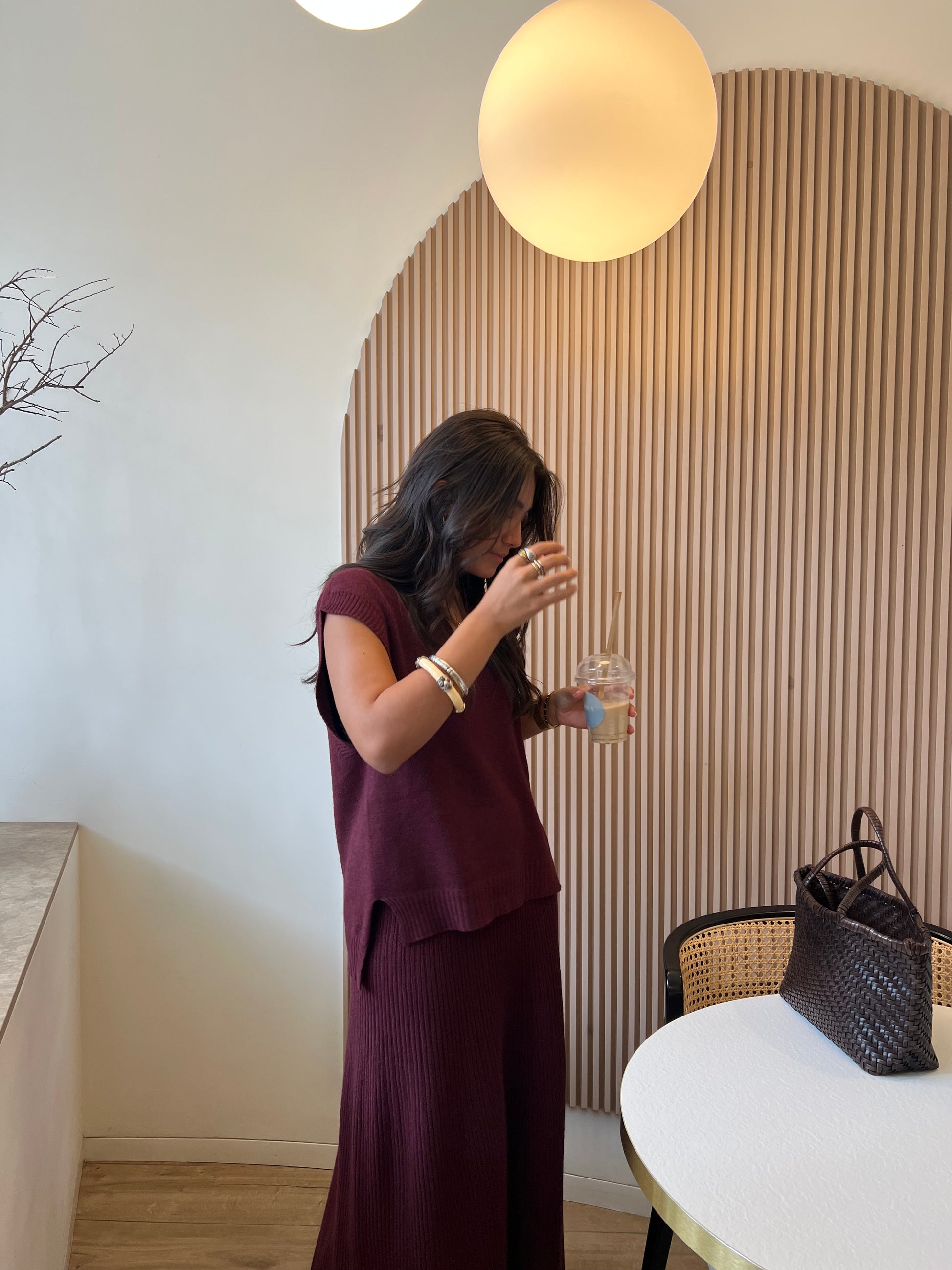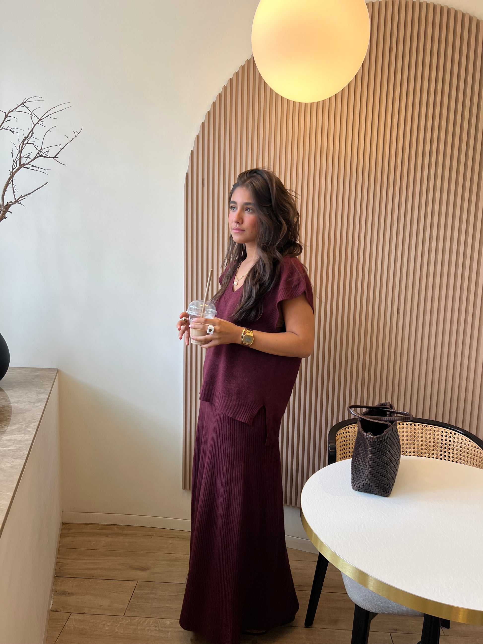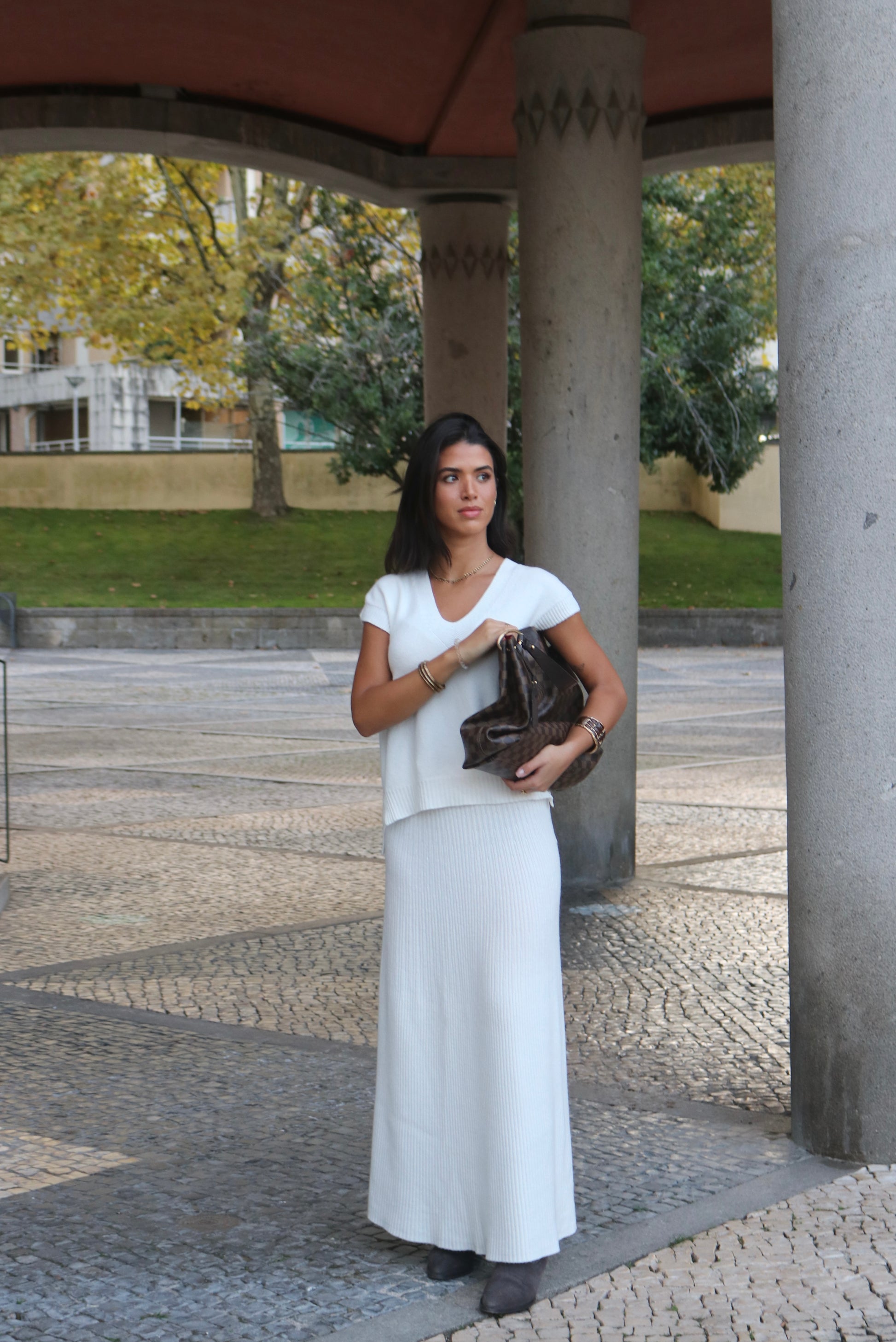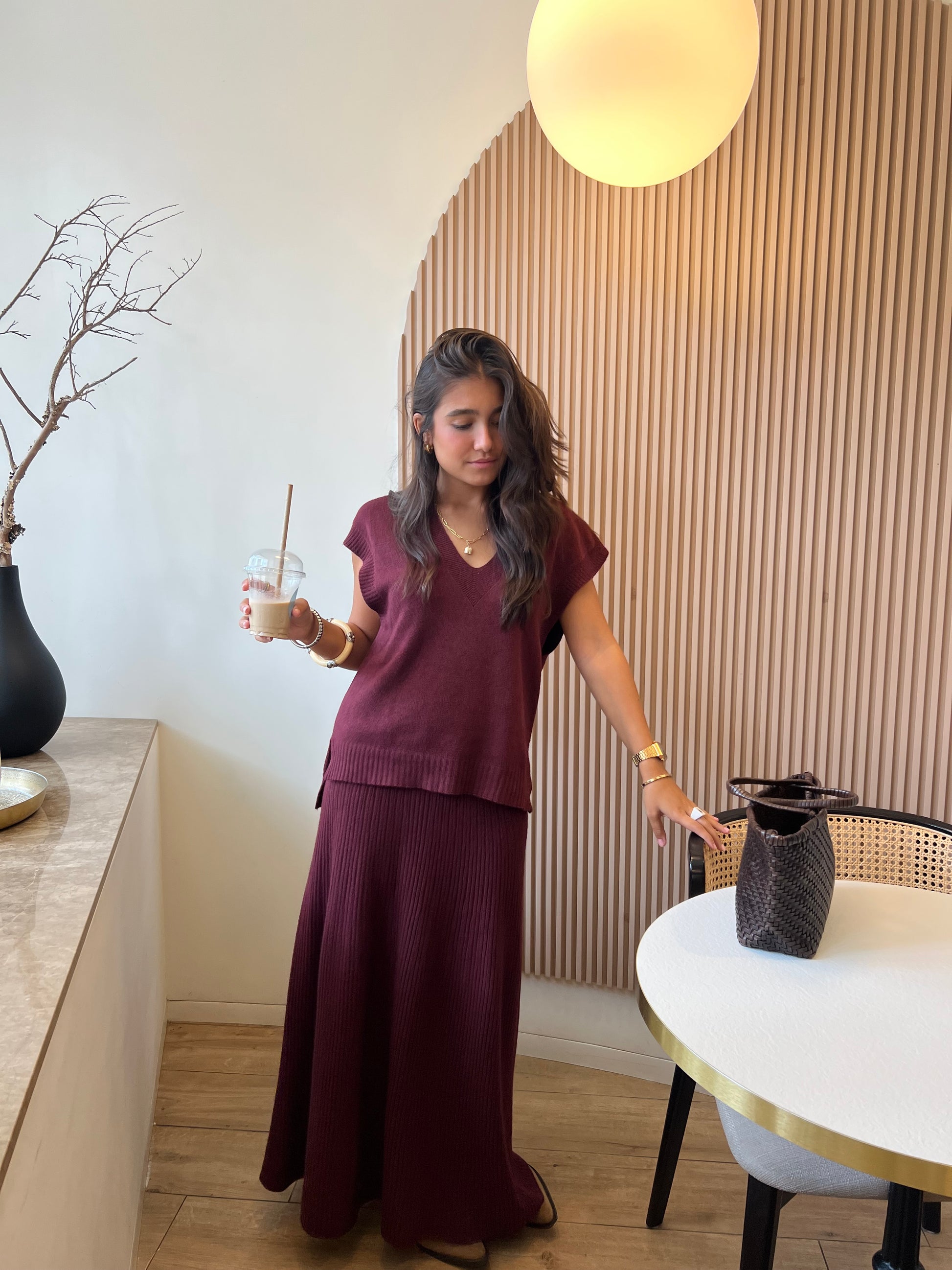 Coordenado em malha canelada de textura marcada. Top sem mangas de corte reto, decote em V profundo e pequenas aberturas laterais que conferem leveza à silhueta. Saia longa de cintura média, estrutura fluida e caimento elegante, destacando a verticalidade da malha.
