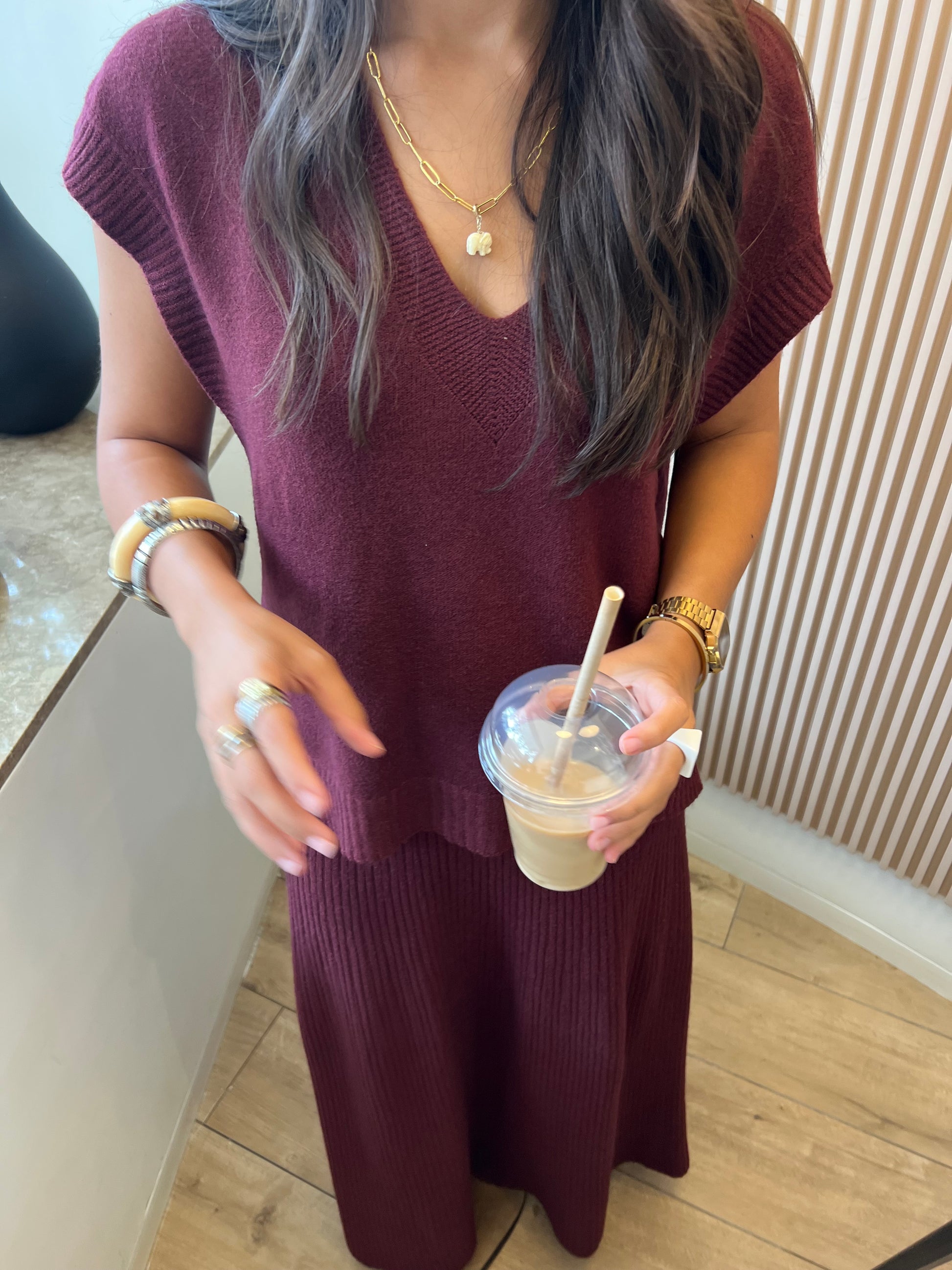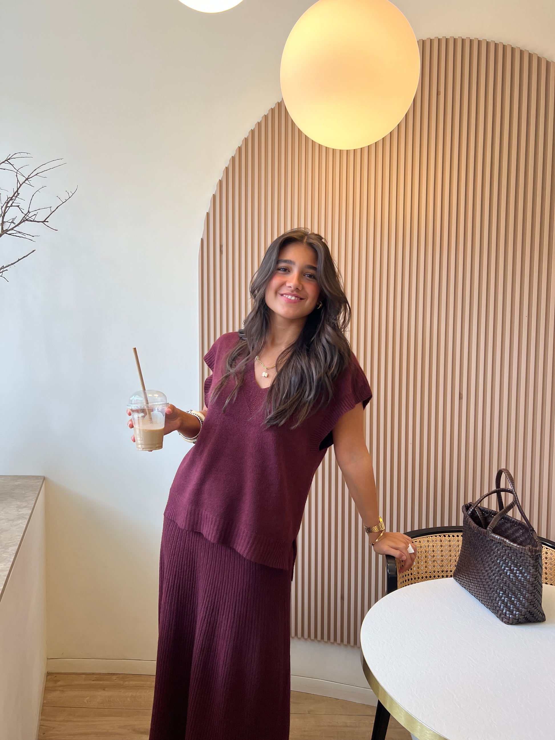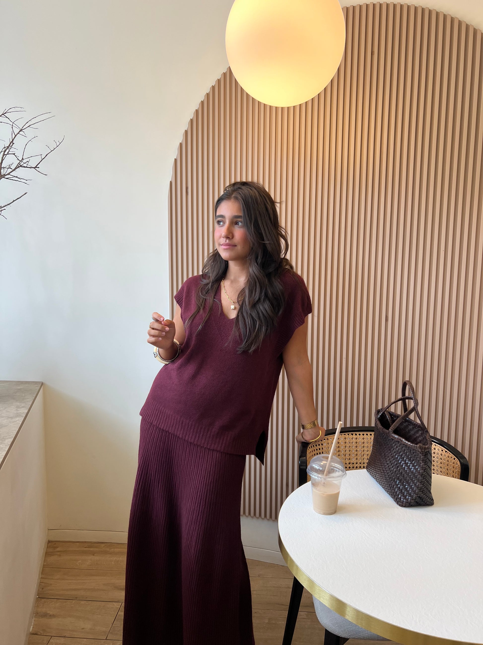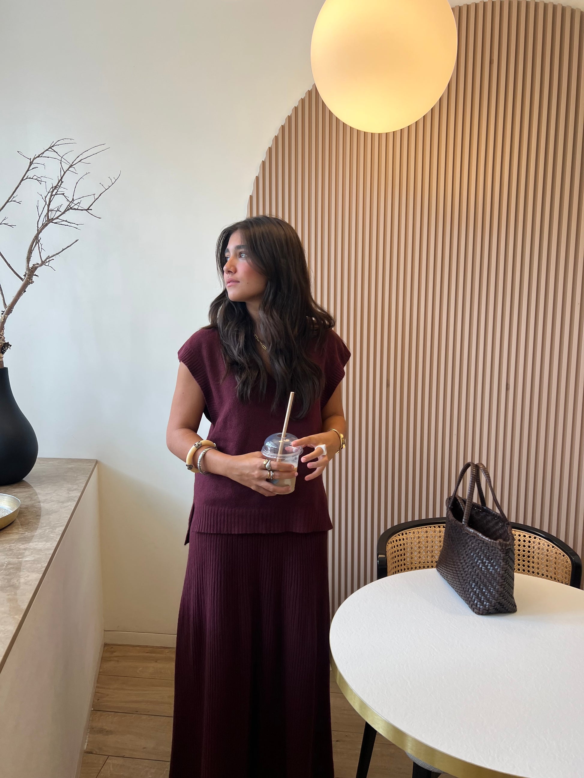 Coordenado em malha canelada de textura marcada. Top sem mangas de corte reto, decote em V profundo e pequenas aberturas laterais que conferem leveza à silhueta. Saia longa de cintura média, estrutura fluida e caimento elegante, destacando a verticalidade da malha.