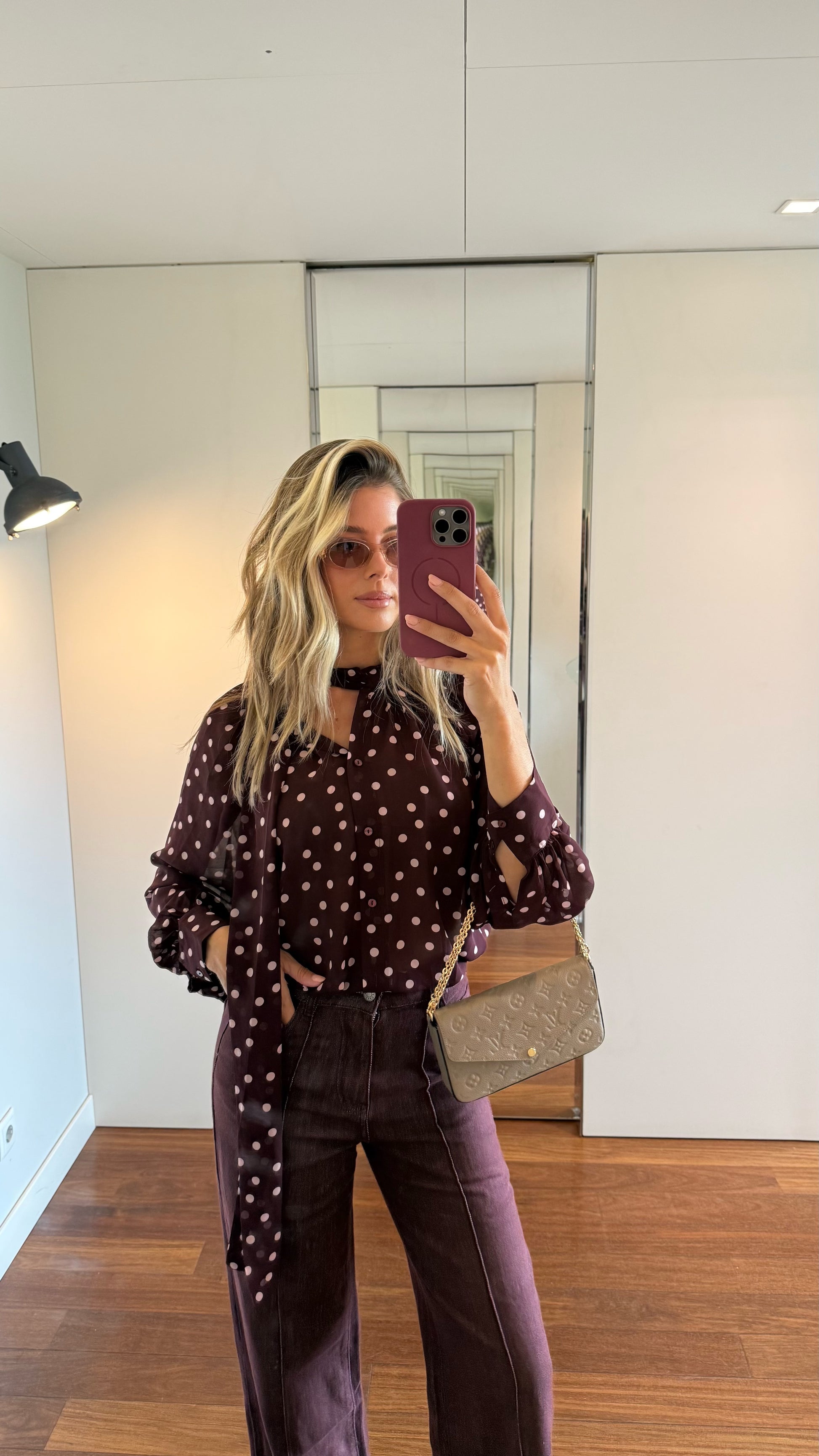 Jeans reto em denim burgundy. Modelo de cintura subida com bolsos e presilhas. Costuras em contraste que destacam a silhueta. Fecho de botão metálico e fecho de correr.