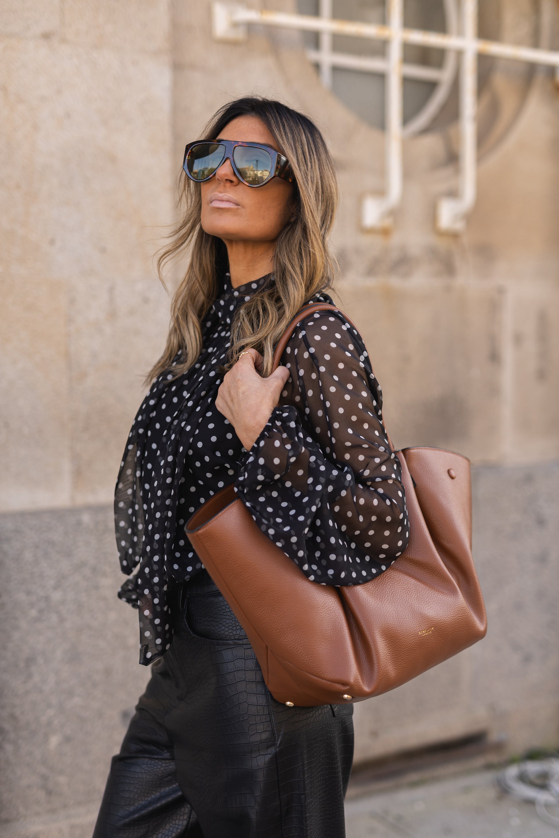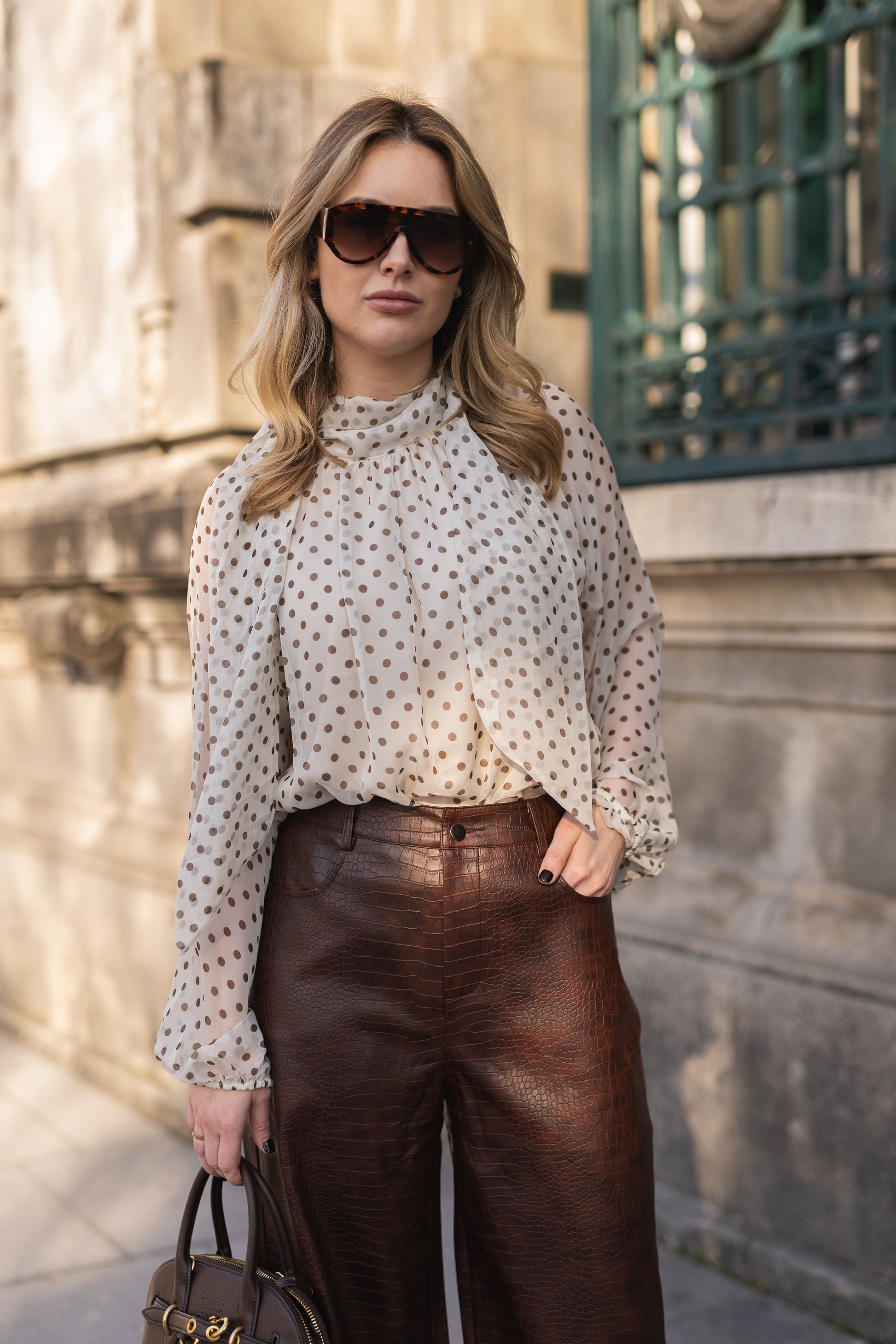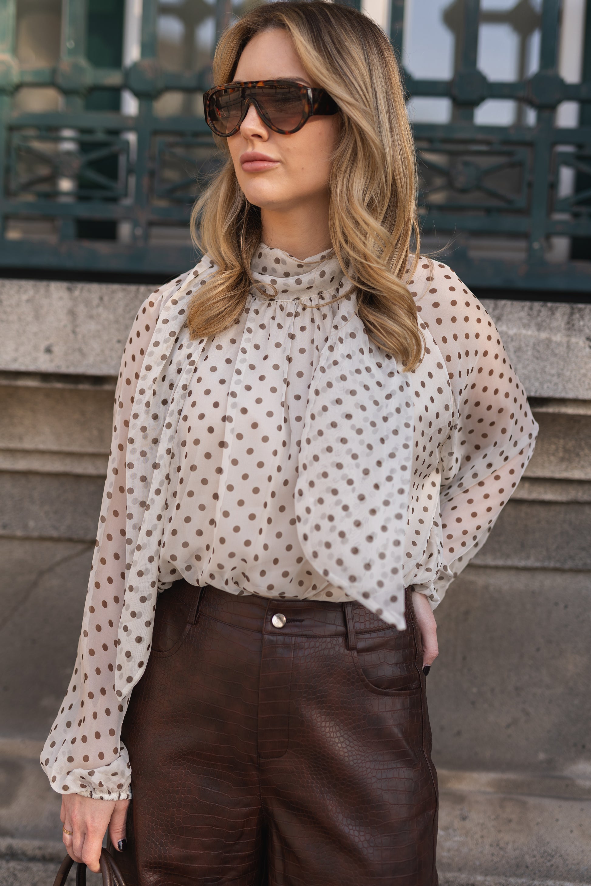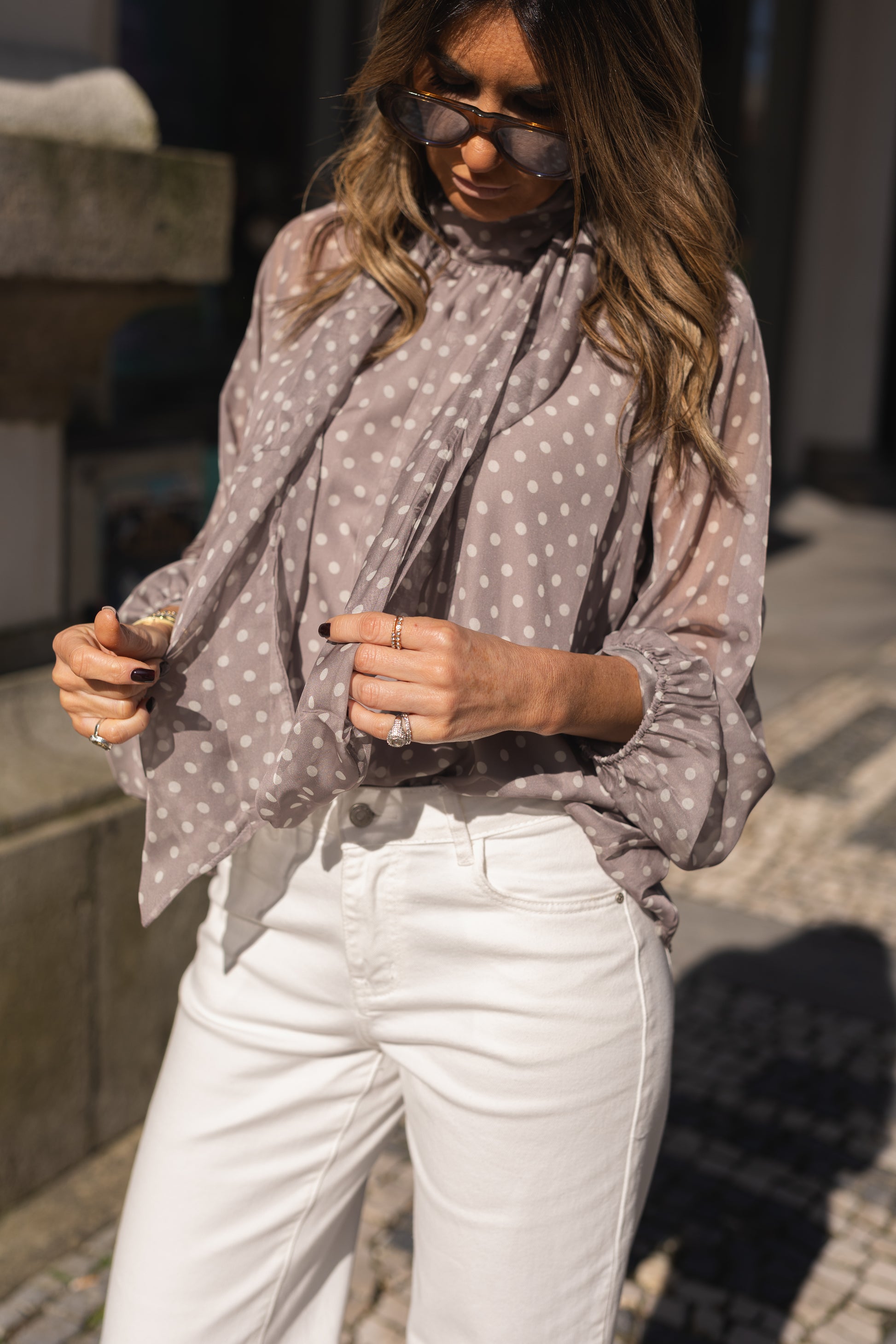 Blusa em tecido leve e fluido, com padrão de bolinhas e transparência subtil. Modelo de corte solto, com mangas amplas e gola com laço do mesmo tecido.