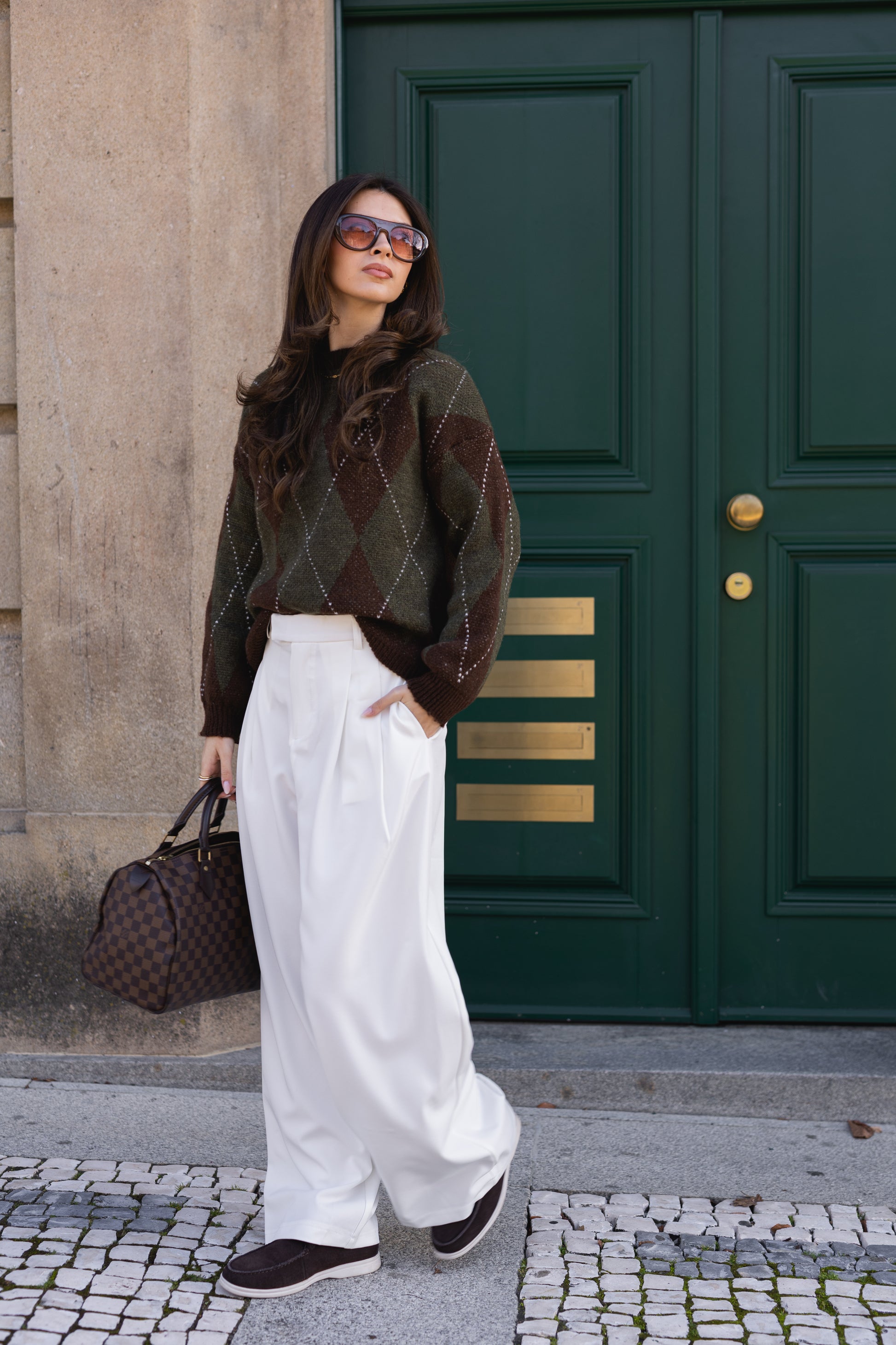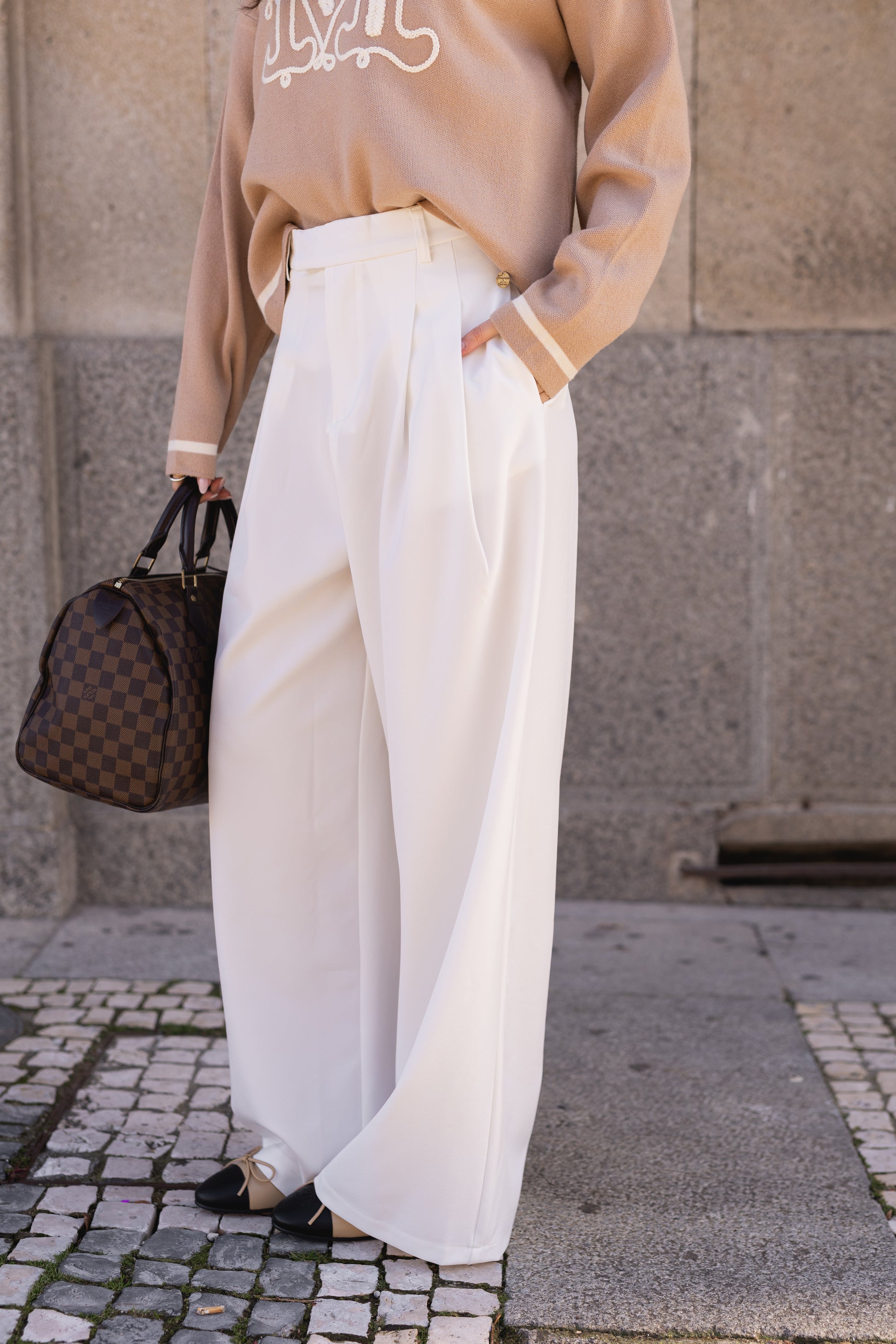 Calças de alfaiataria em tom branco-marfim, de cintura subida e corte reto. Modelo com pregas frontais discretas, bolsos laterais funcionais e fecho oculto.