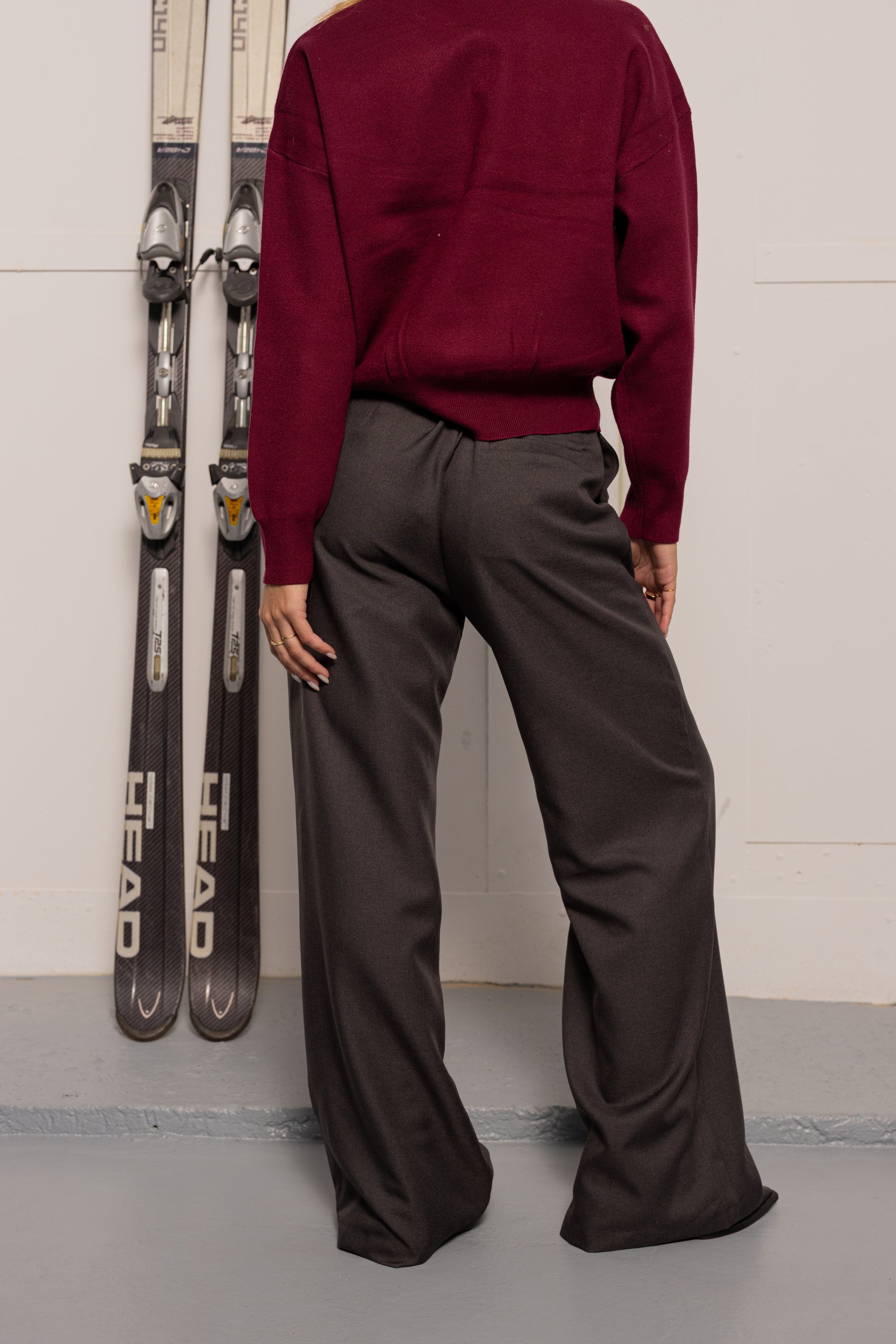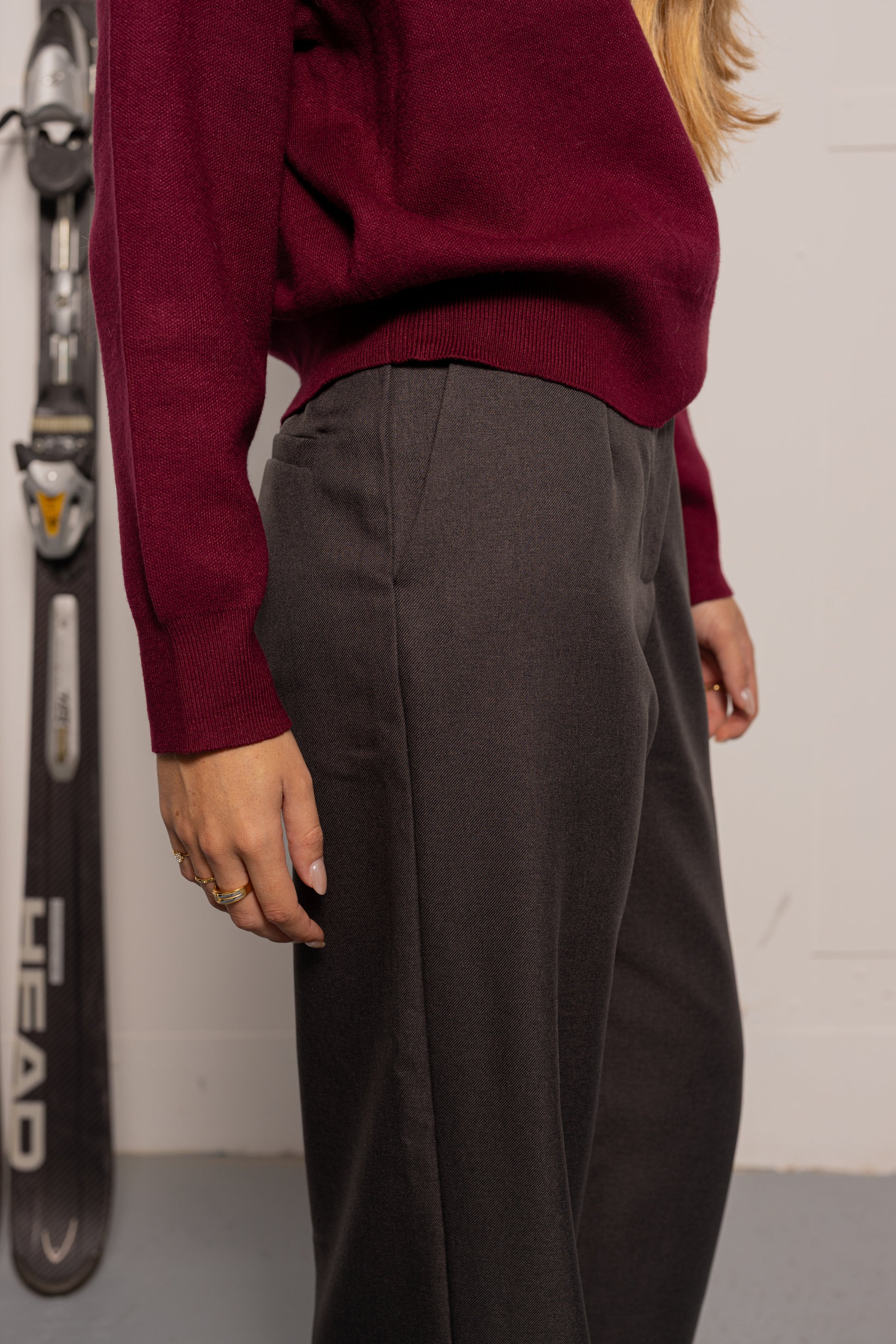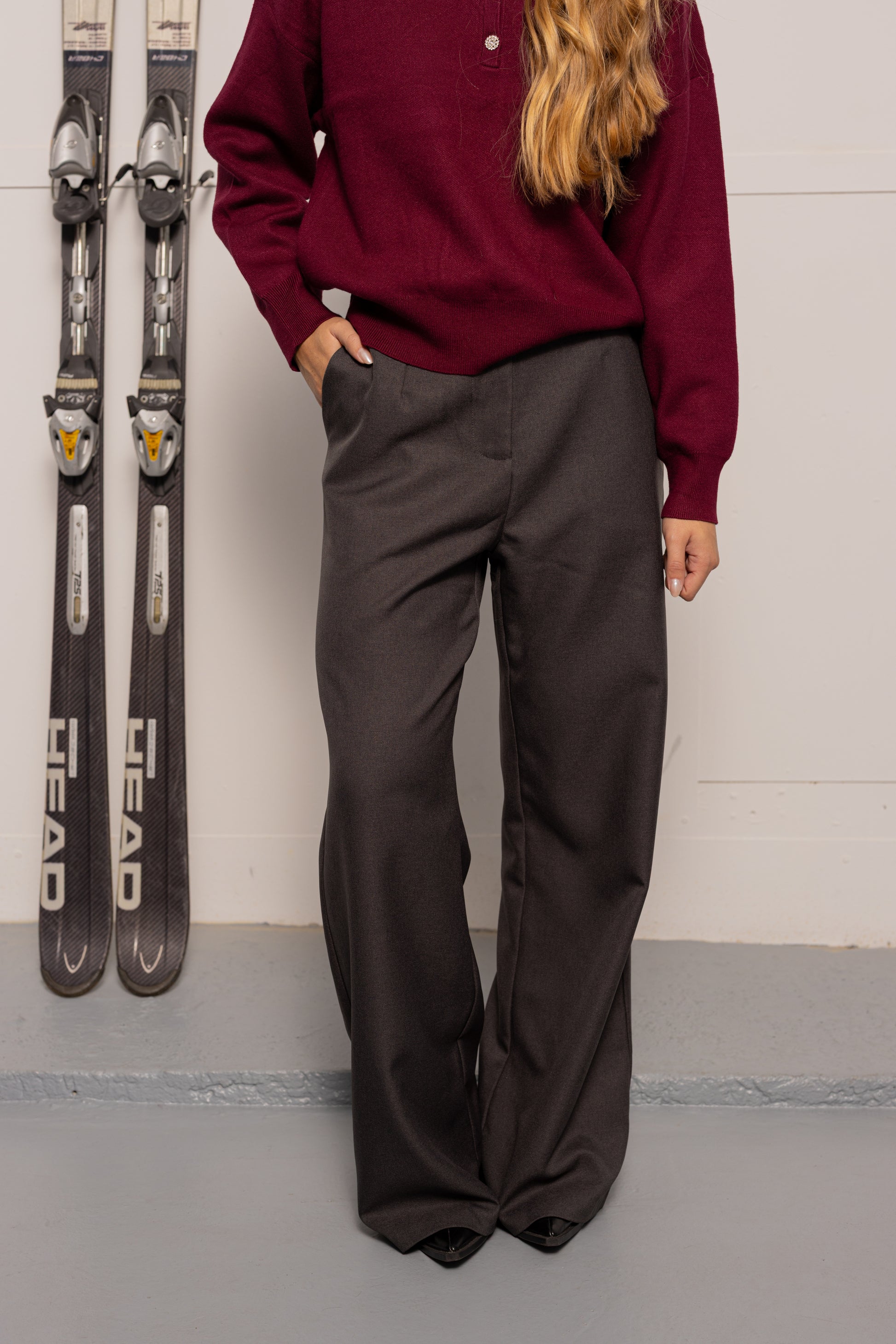Calças de corte reto e perna larga em tecido estruturado com textura suave. Modelo de cintura subida com bolsos laterais.