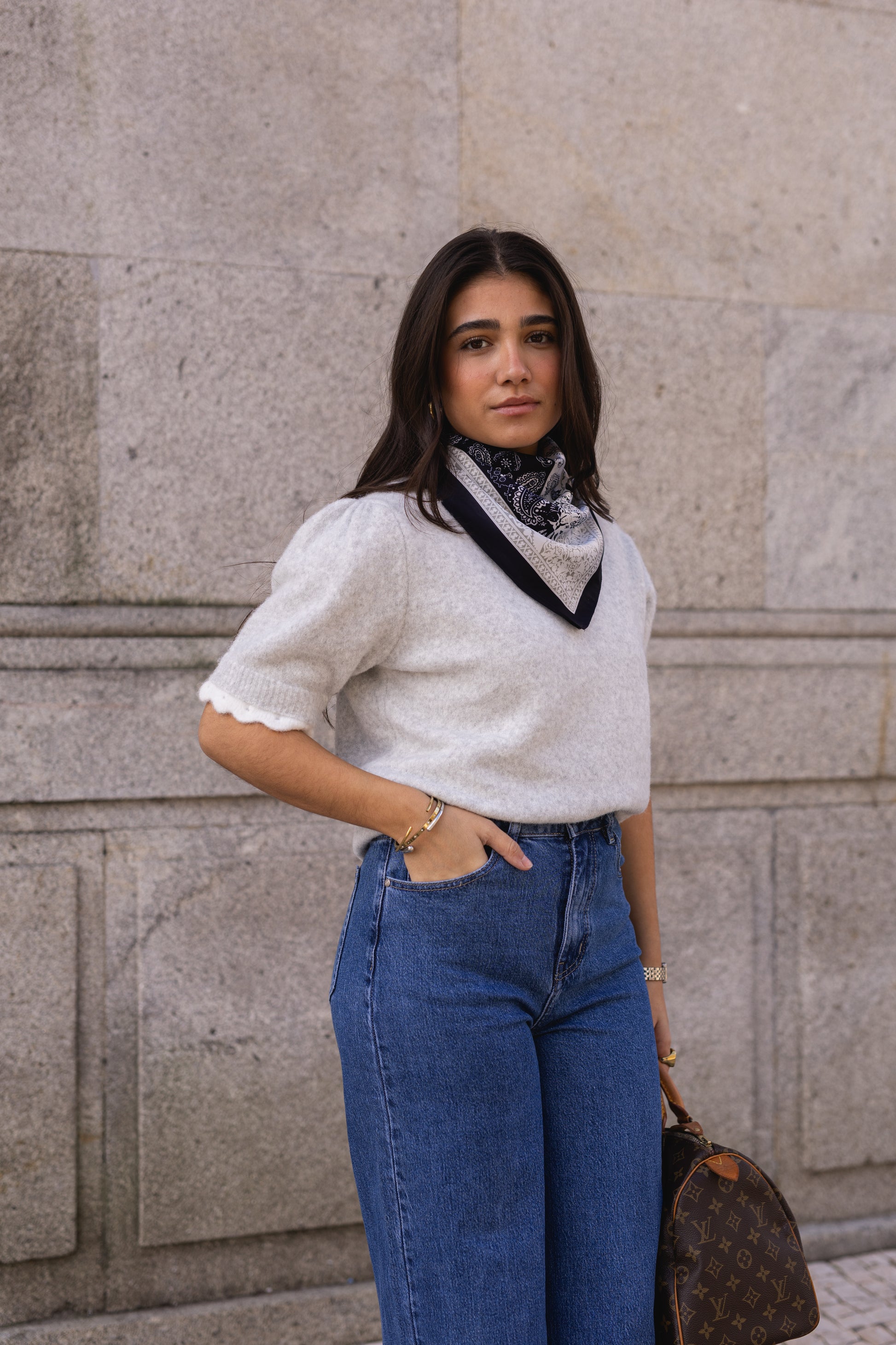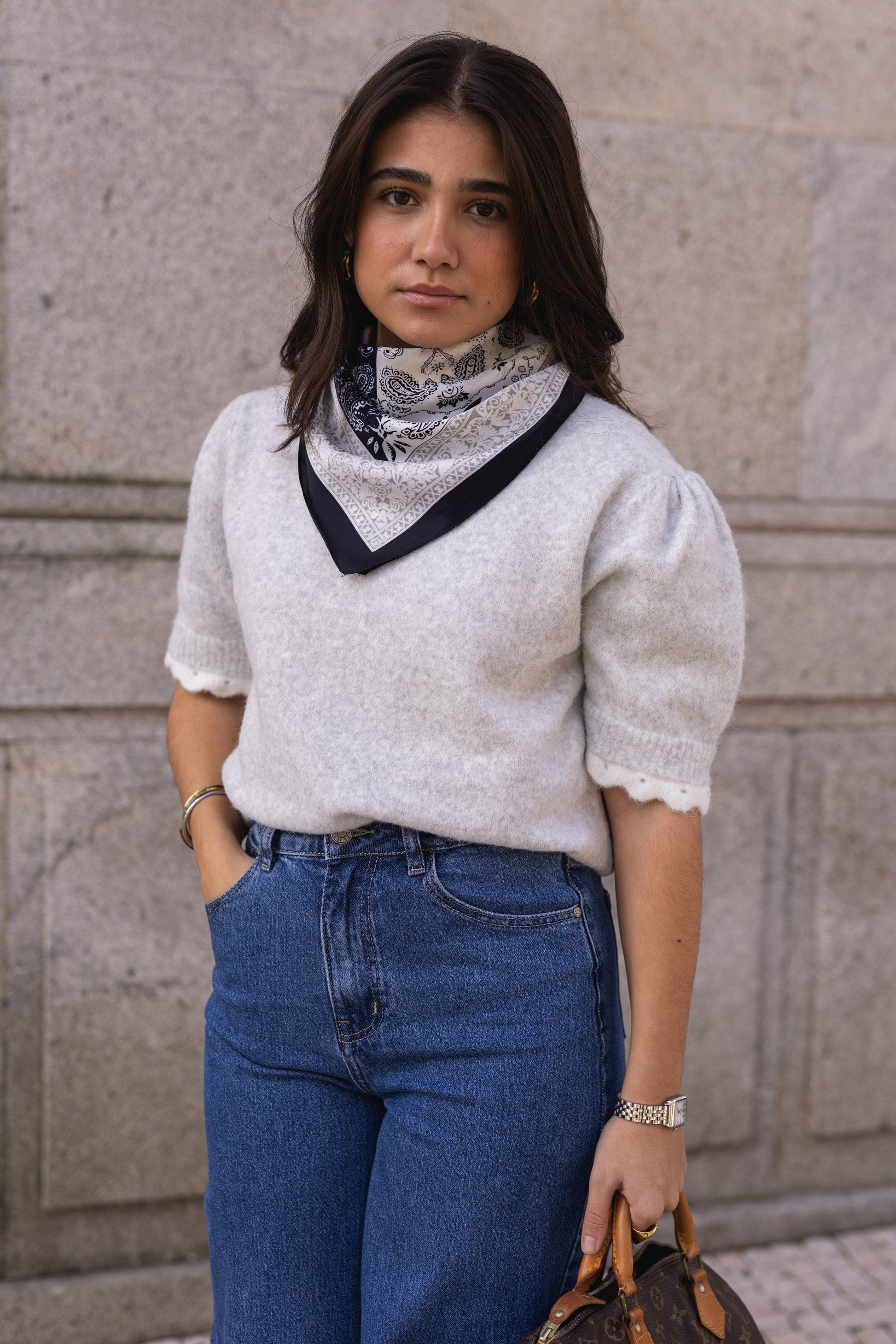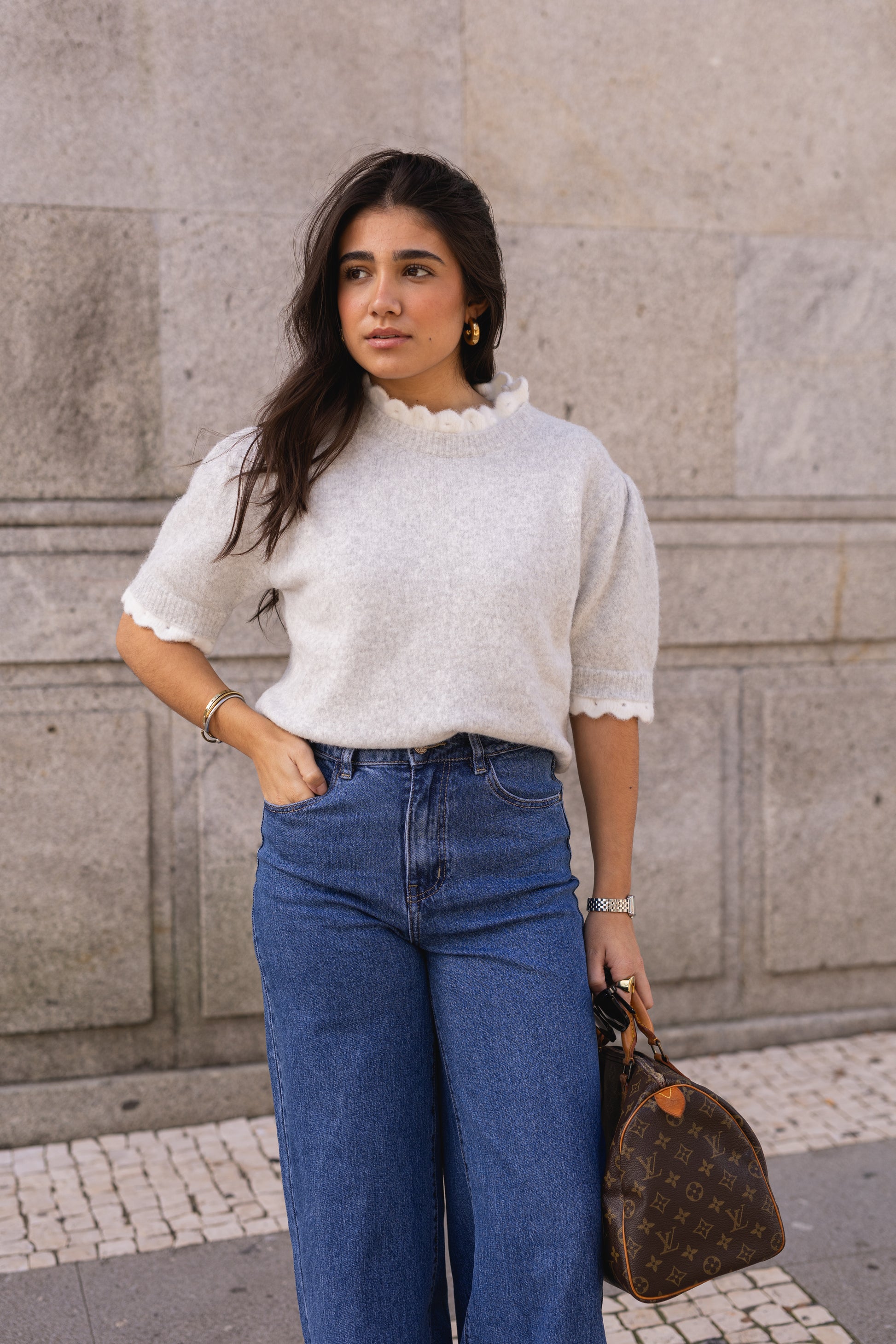 Camisola de malha em tom cinza-claro, com acabamento felpudo e toque aconchegante. Modelo de corte reto, manga curta e gola redonda com detalhe delicado em branco.