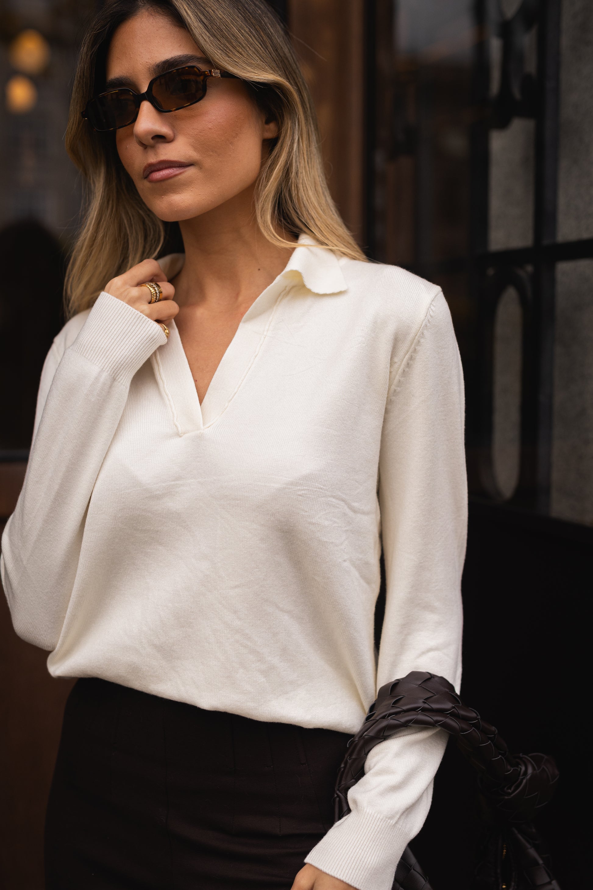 Camisola em malha fina, com gola polo ampla e decote em V profundo. Modelo de corte simples e elegante, com mangas compridas e acabamento suave.