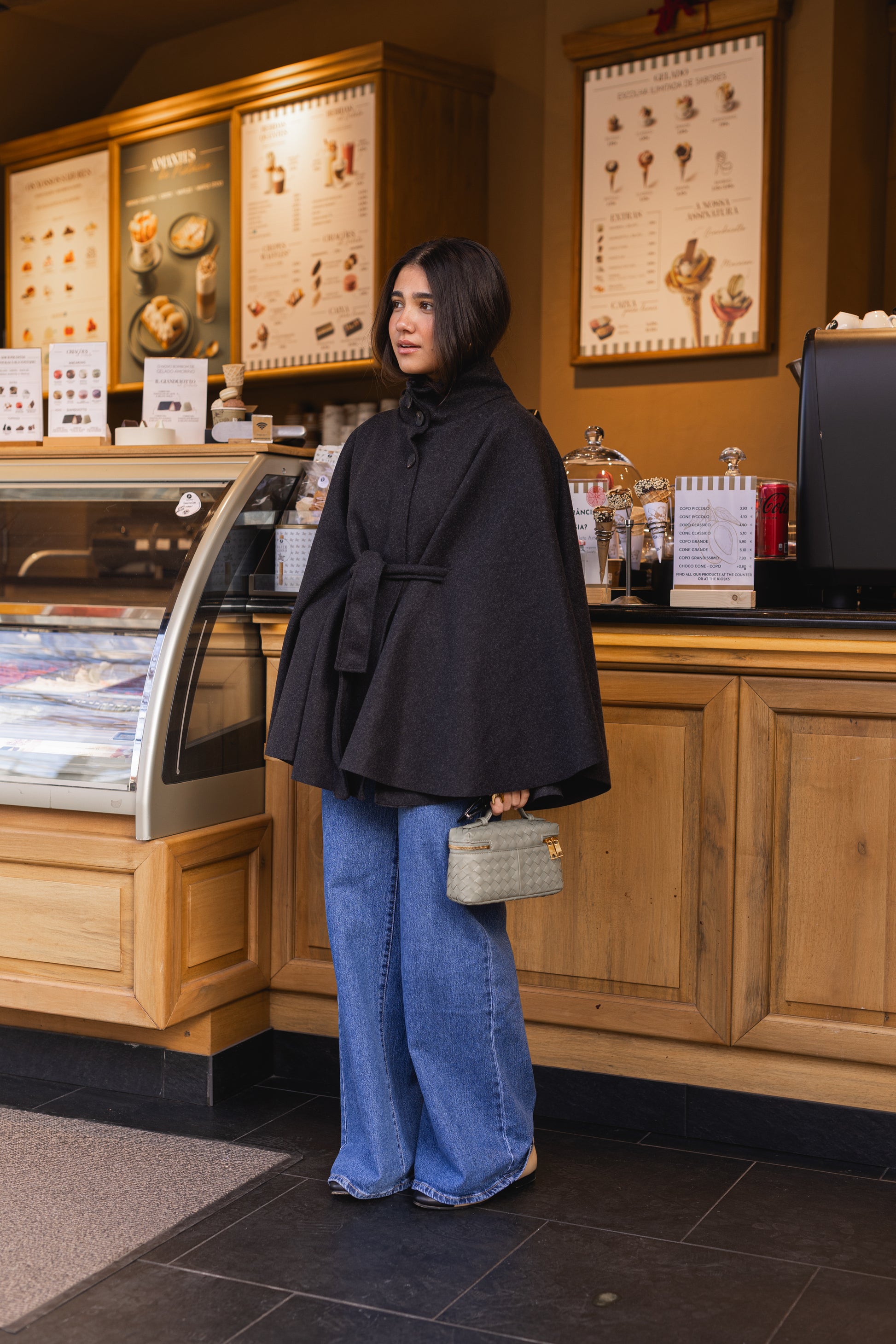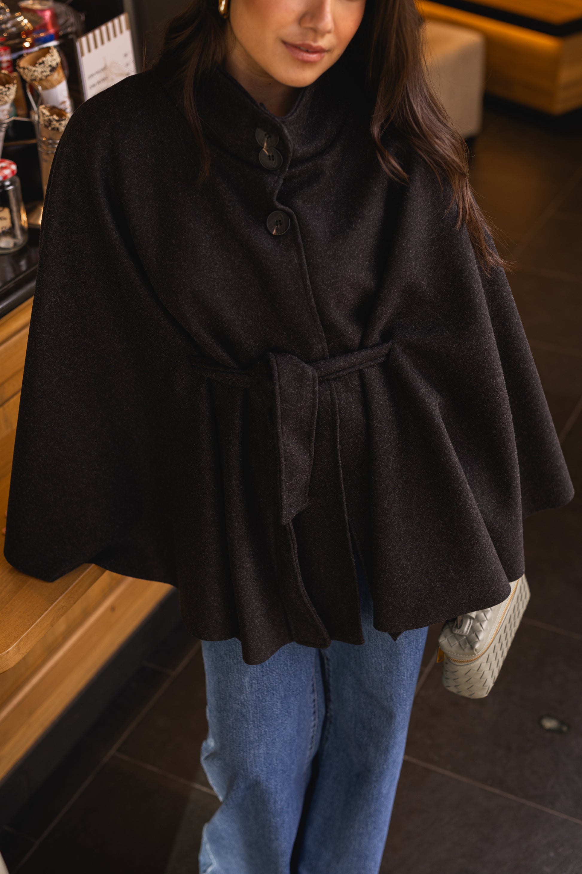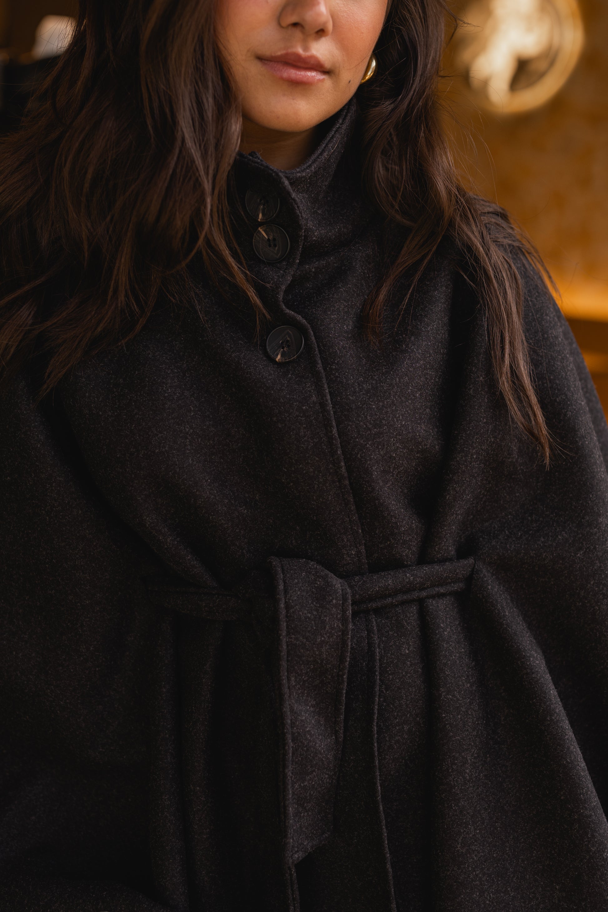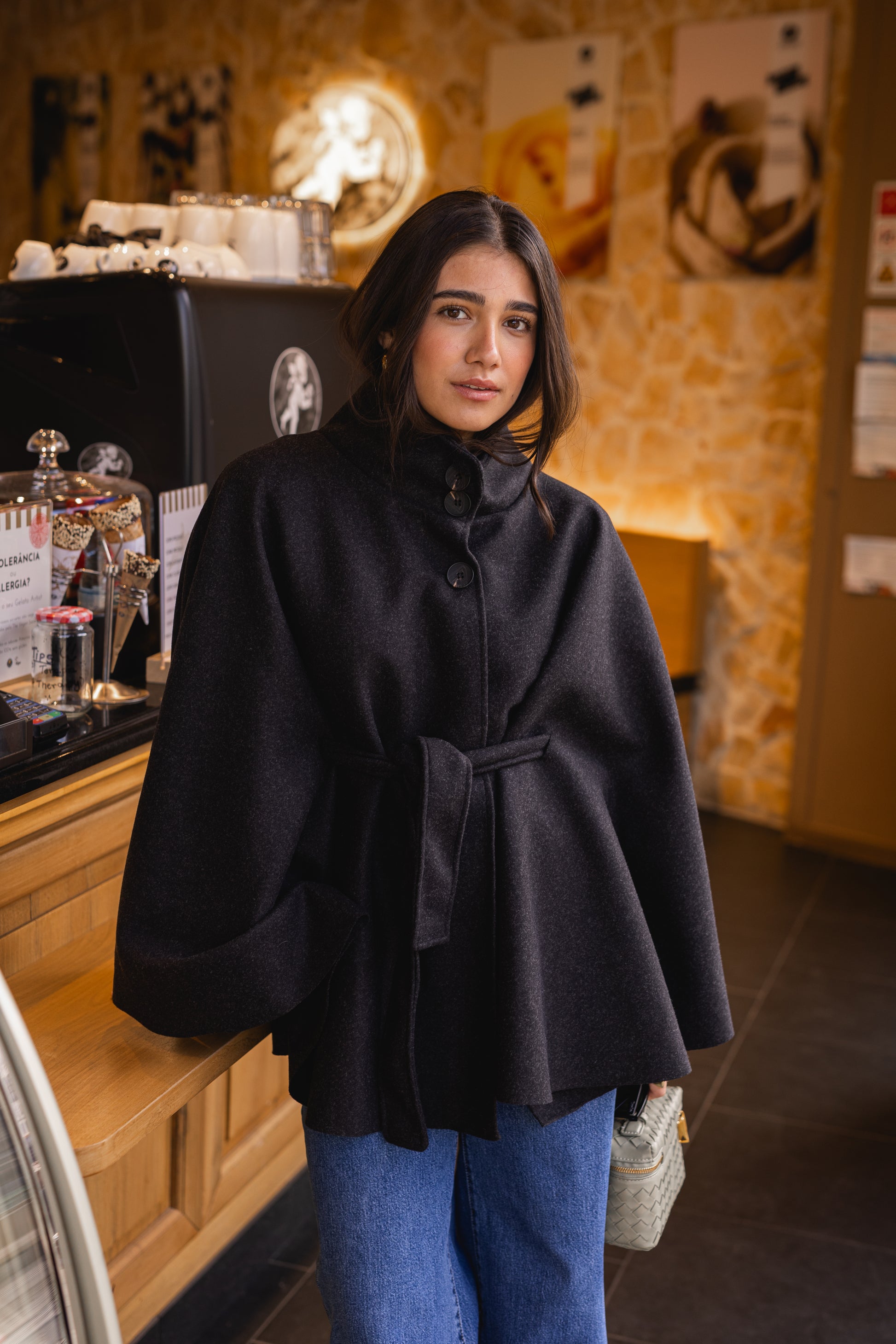 Capa com gola ampla e design minimalista. Modelo de linhas limpas, sem mangas definidas, com cinto do mesmo material para ajuste na cintura.