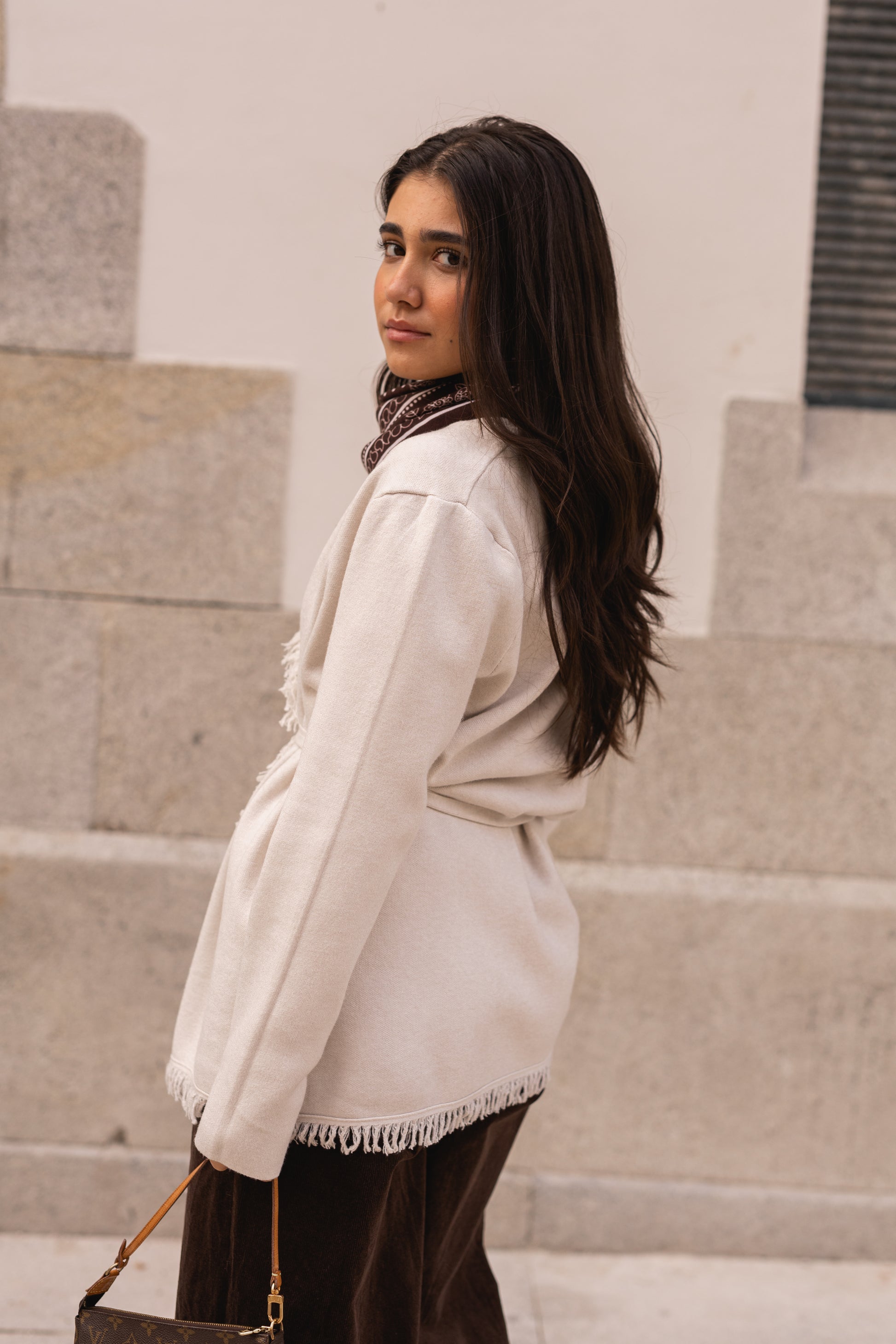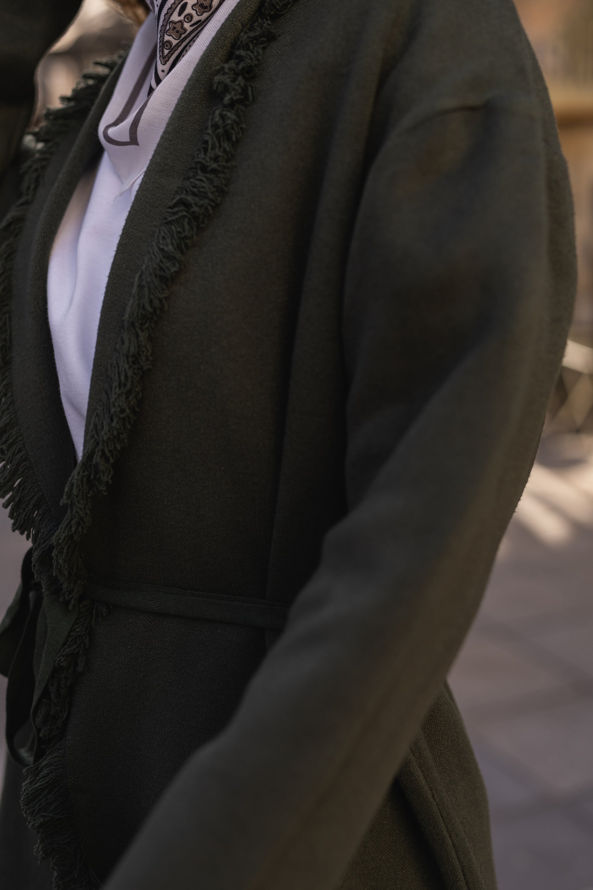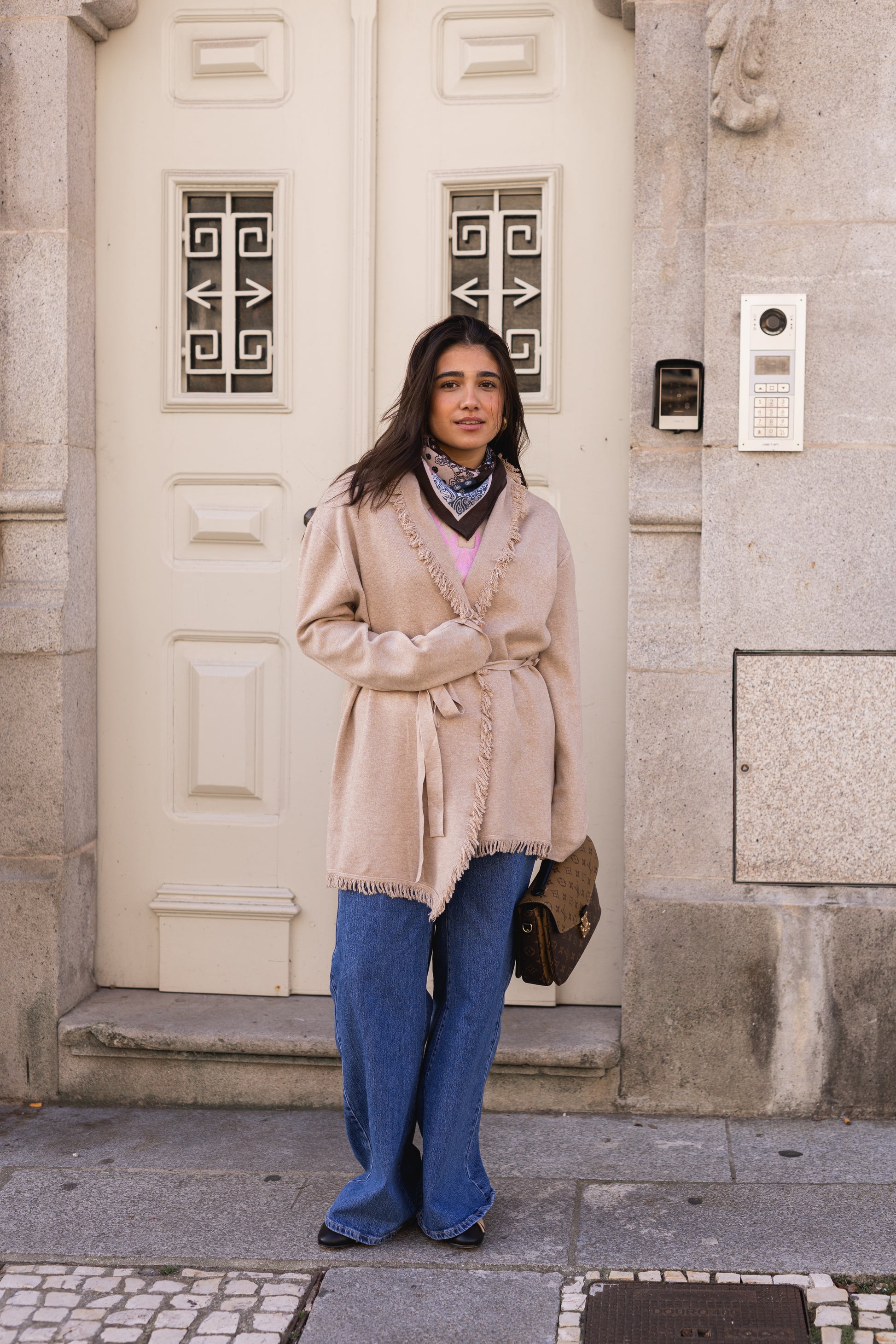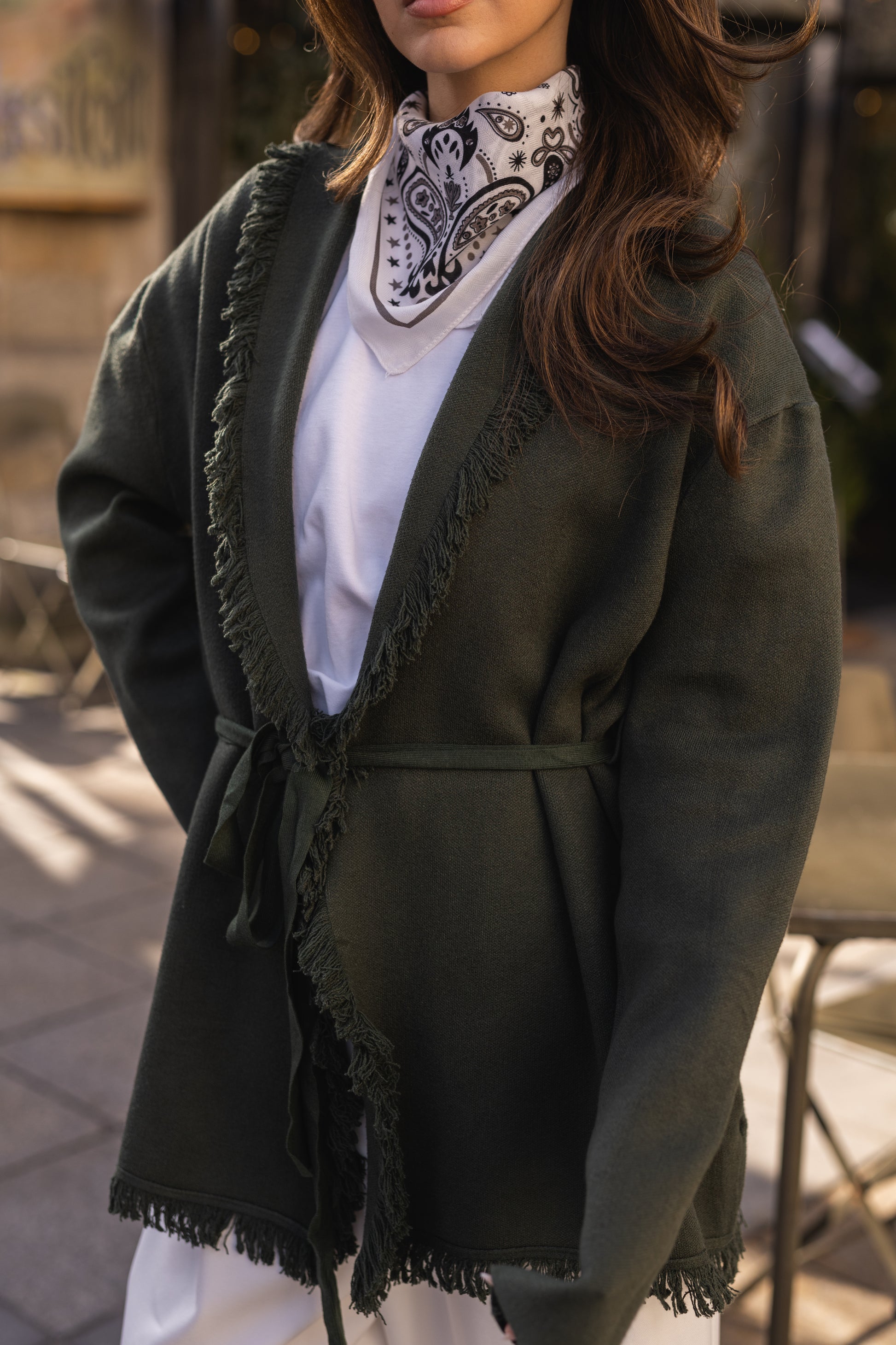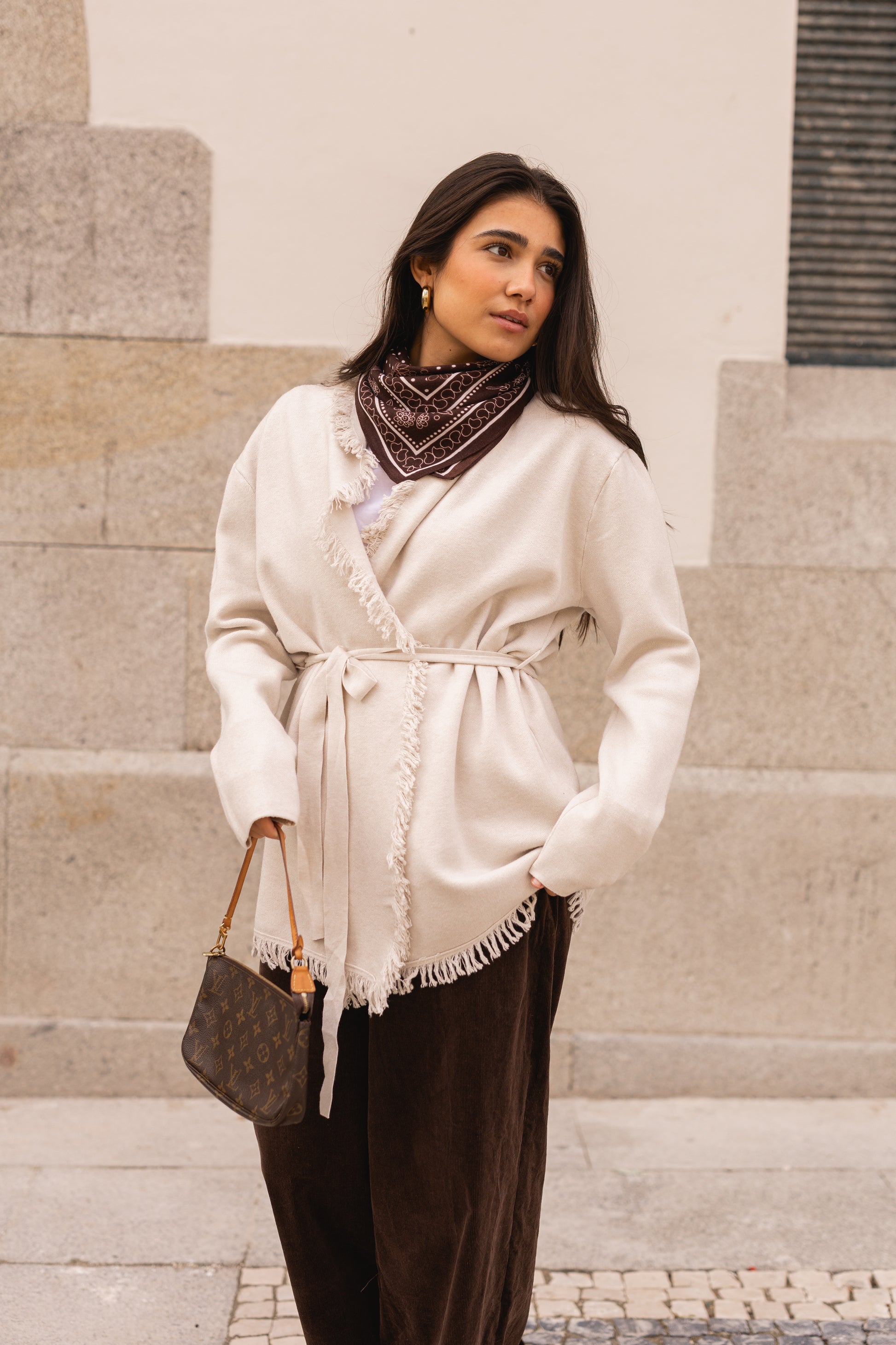 Casaco em malha de toque suave, com corte reto e comprimento médio. Modelo aberto com gola em V realçada por acabamento desfiado delicado, mangas compridas e cinto do mesmo material para ajuste na cintura.