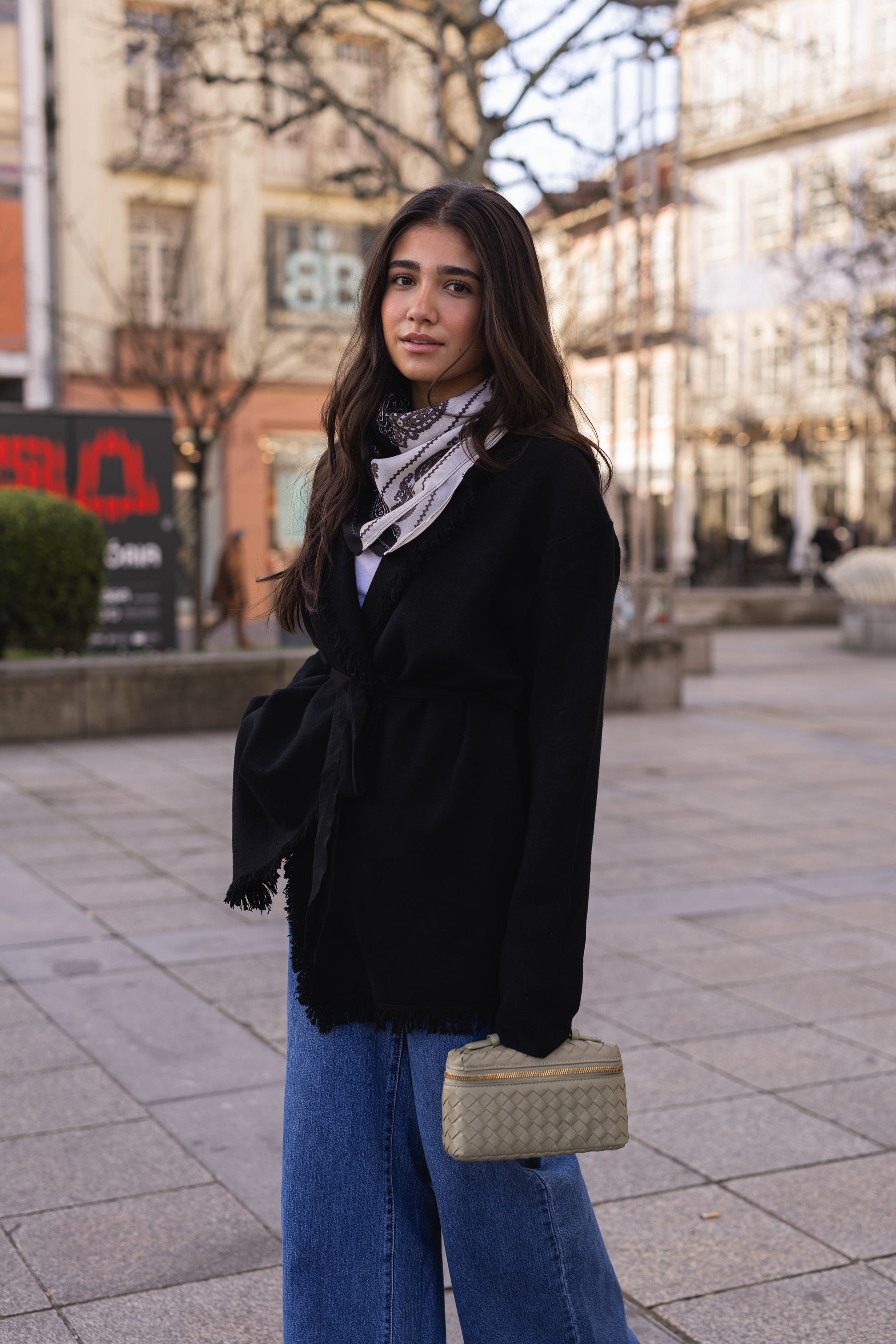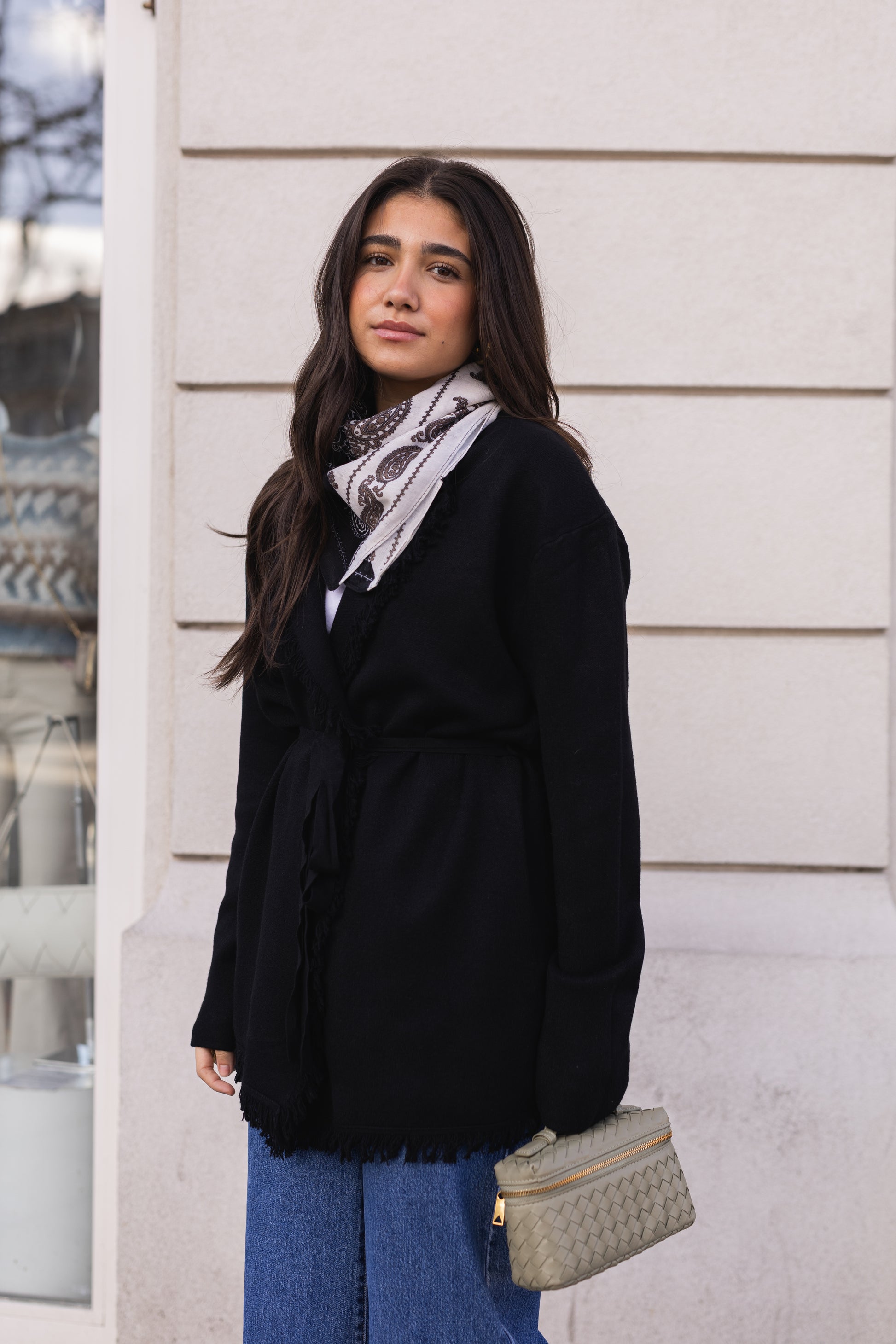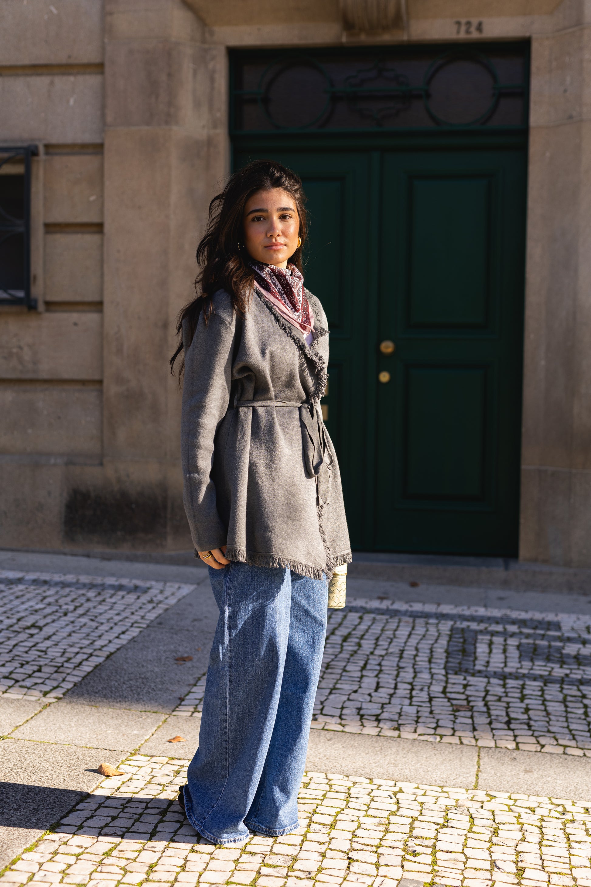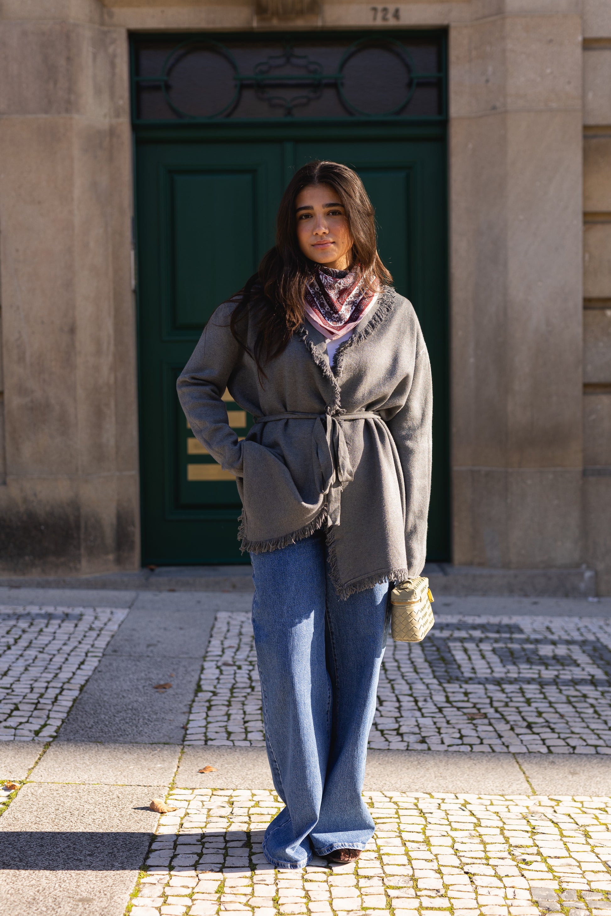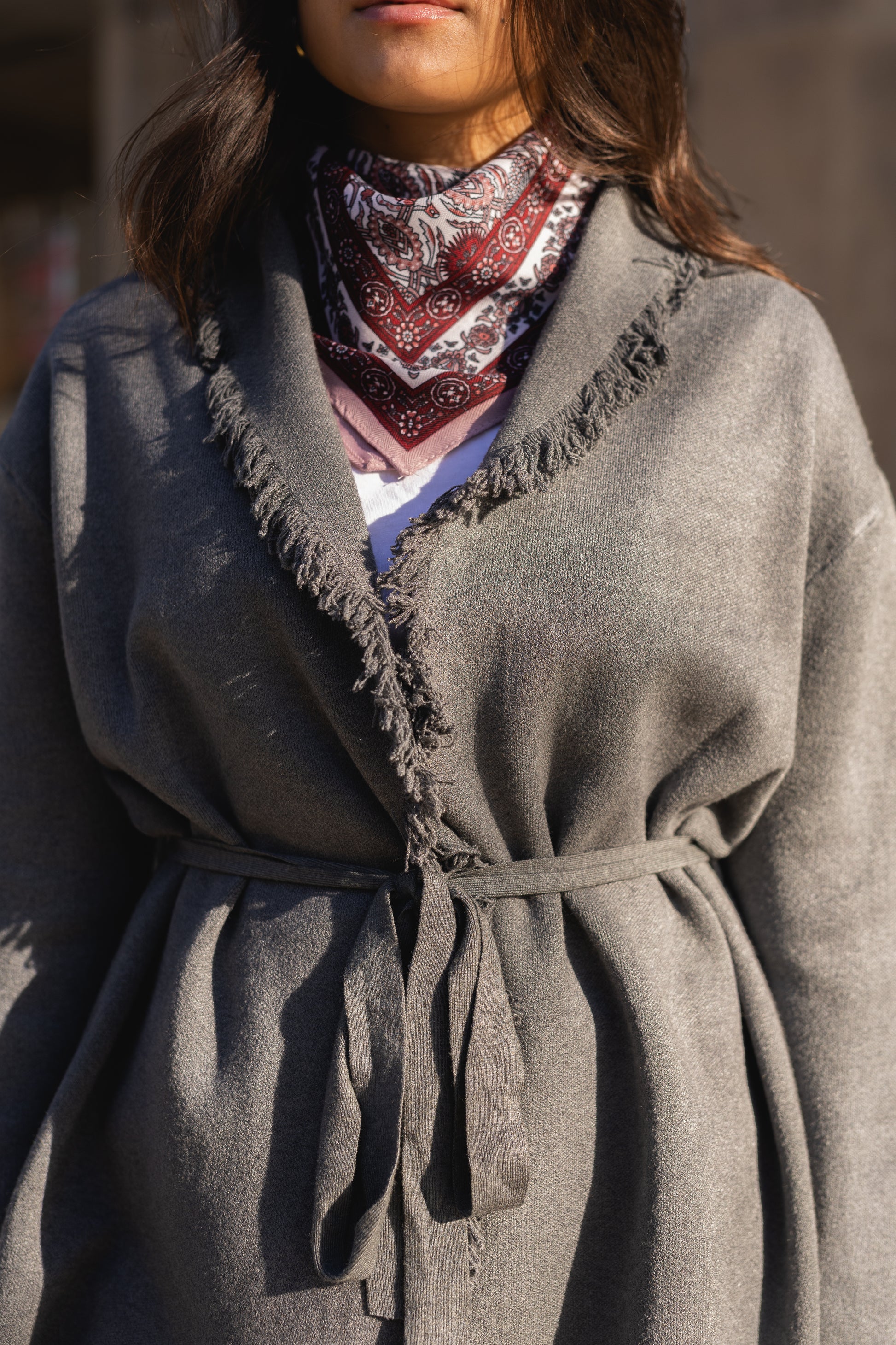 Casaco em malha de toque suave, com corte reto e comprimento médio. Modelo aberto com gola em V realçada por acabamento desfiado delicado, mangas compridas e cinto do mesmo material para ajuste na cintura.