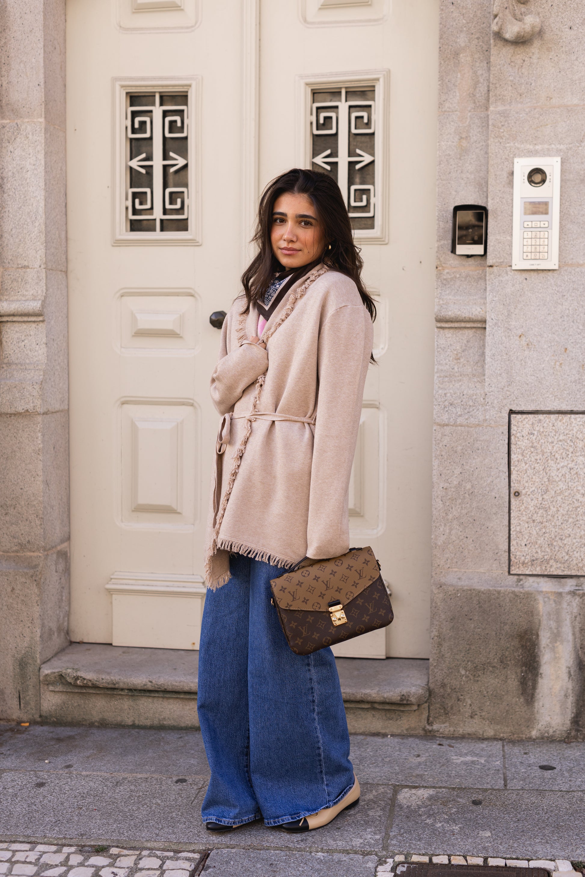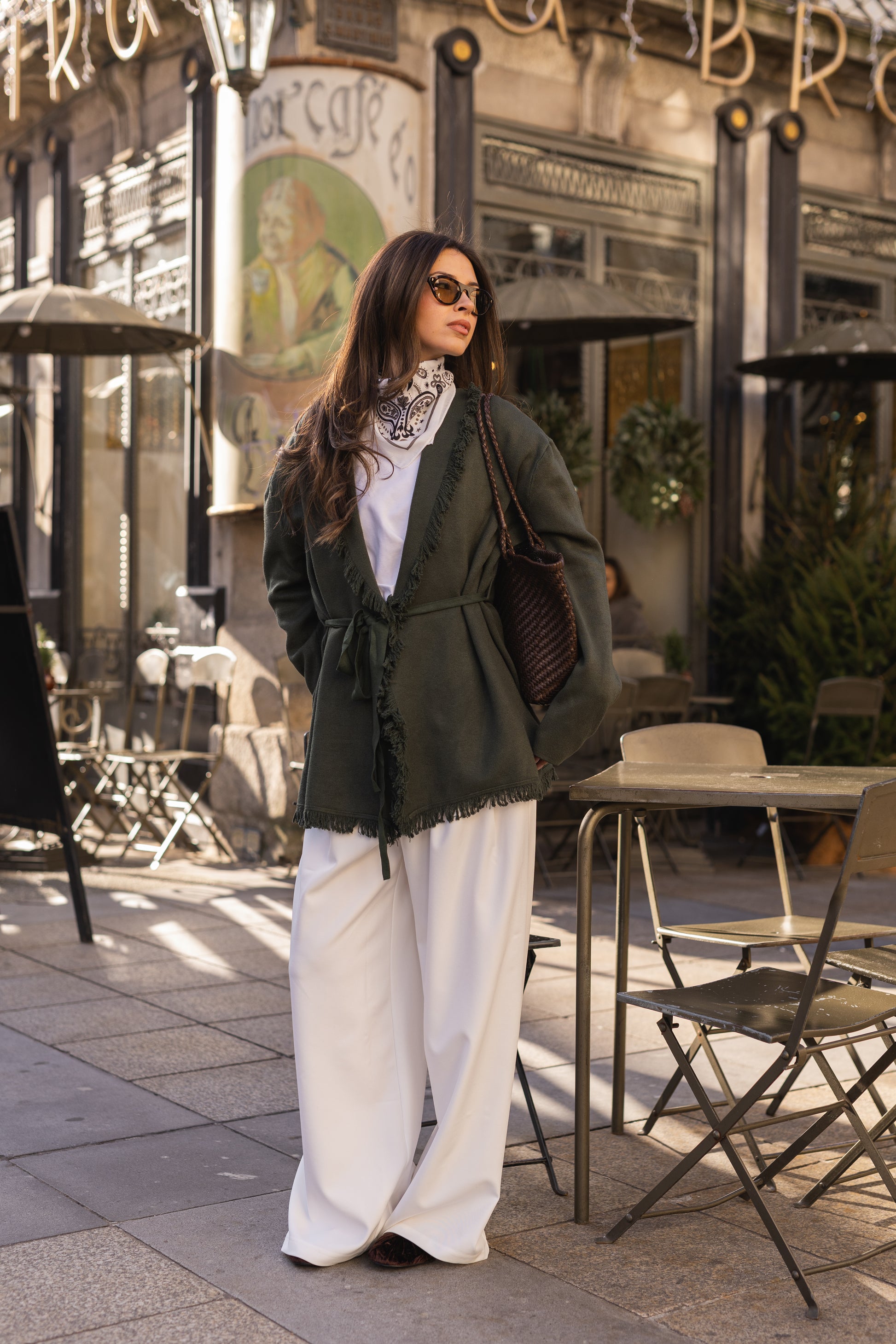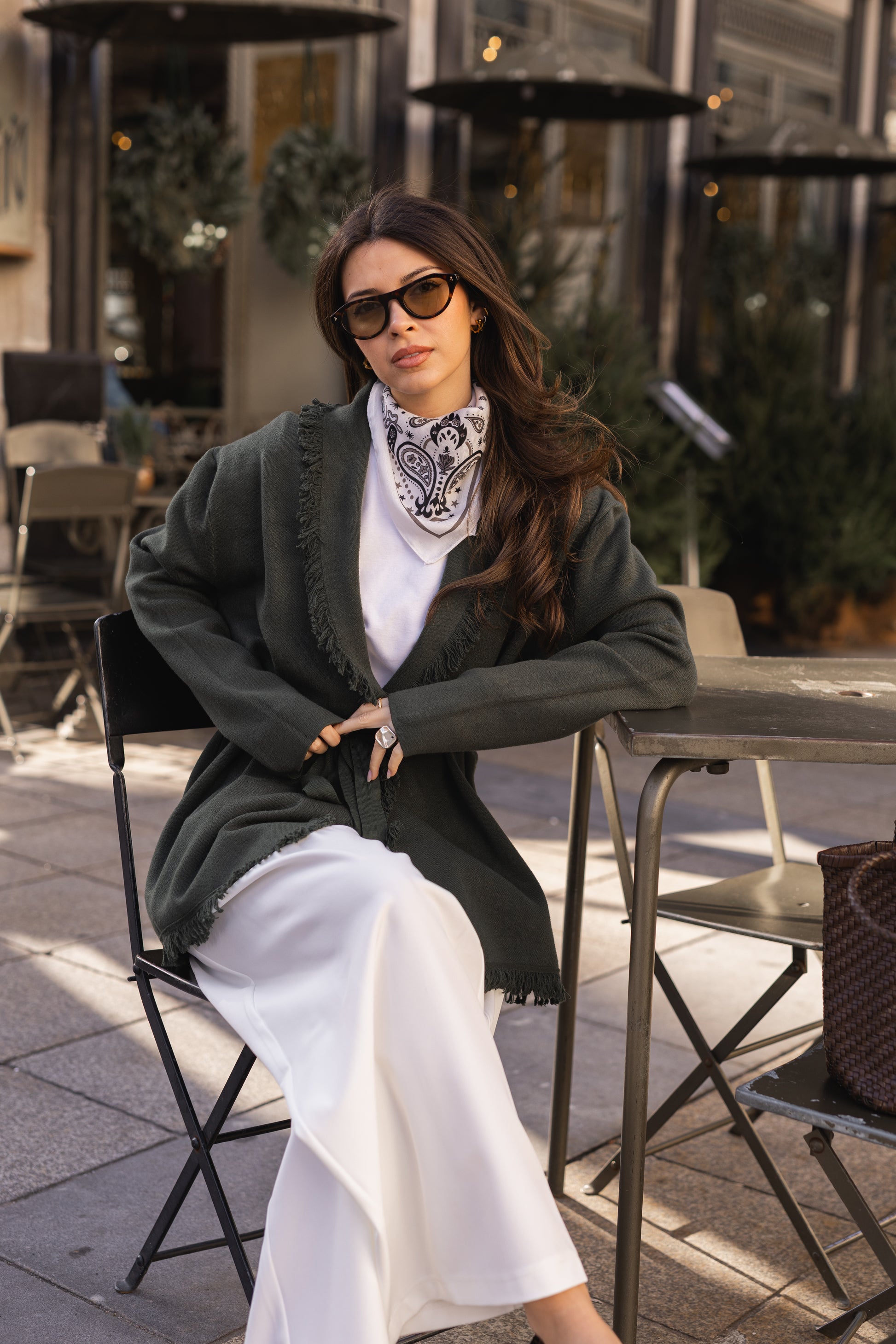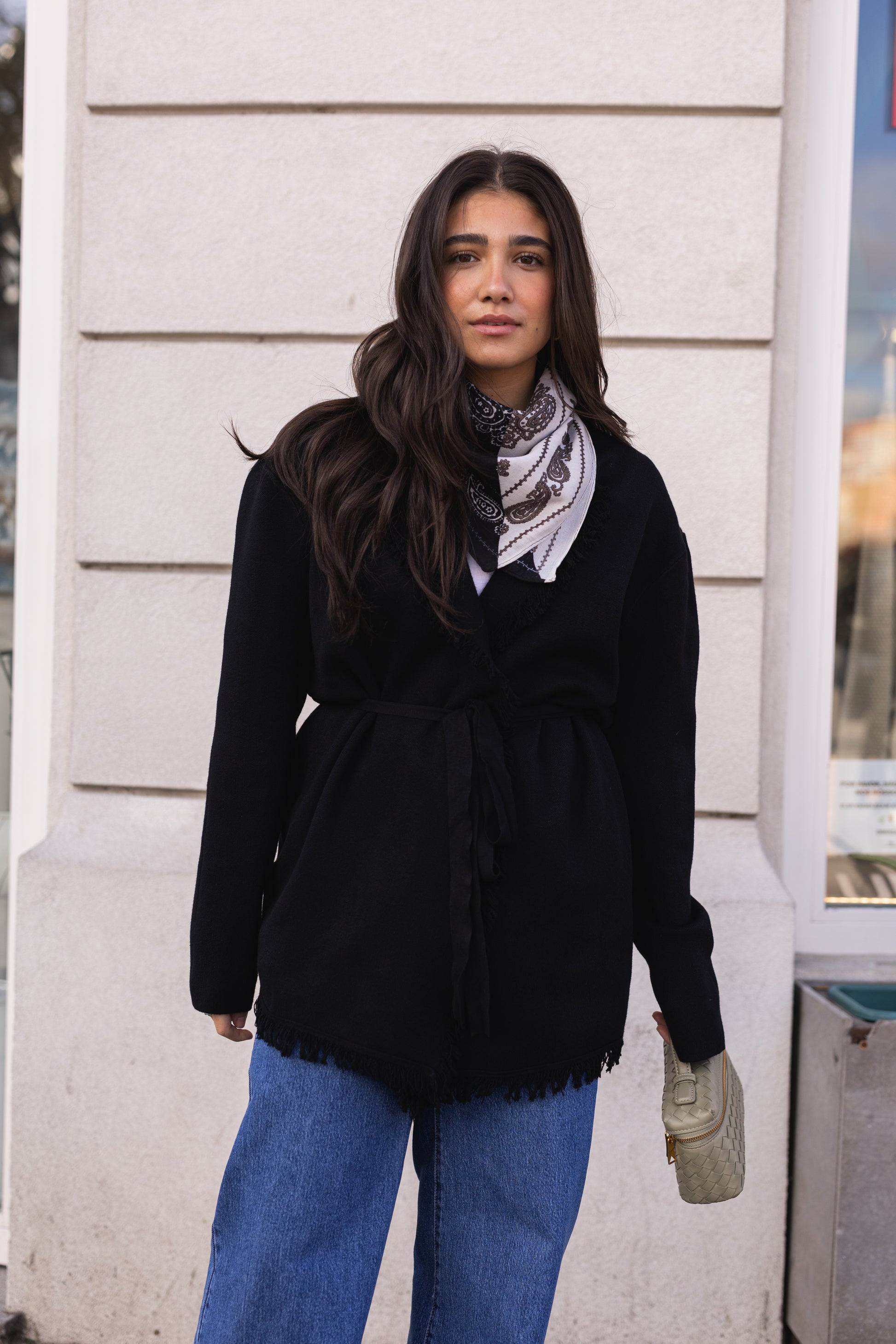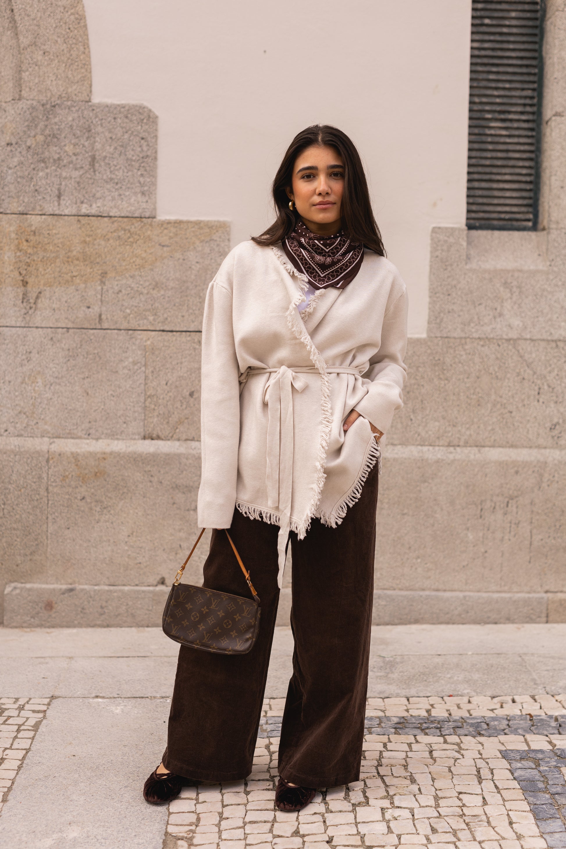 Casaco em malha de toque suave, com corte reto e comprimento médio. Modelo aberto com gola em V realçada por acabamento desfiado delicado, mangas compridas e cinto do mesmo material para ajuste na cintura.