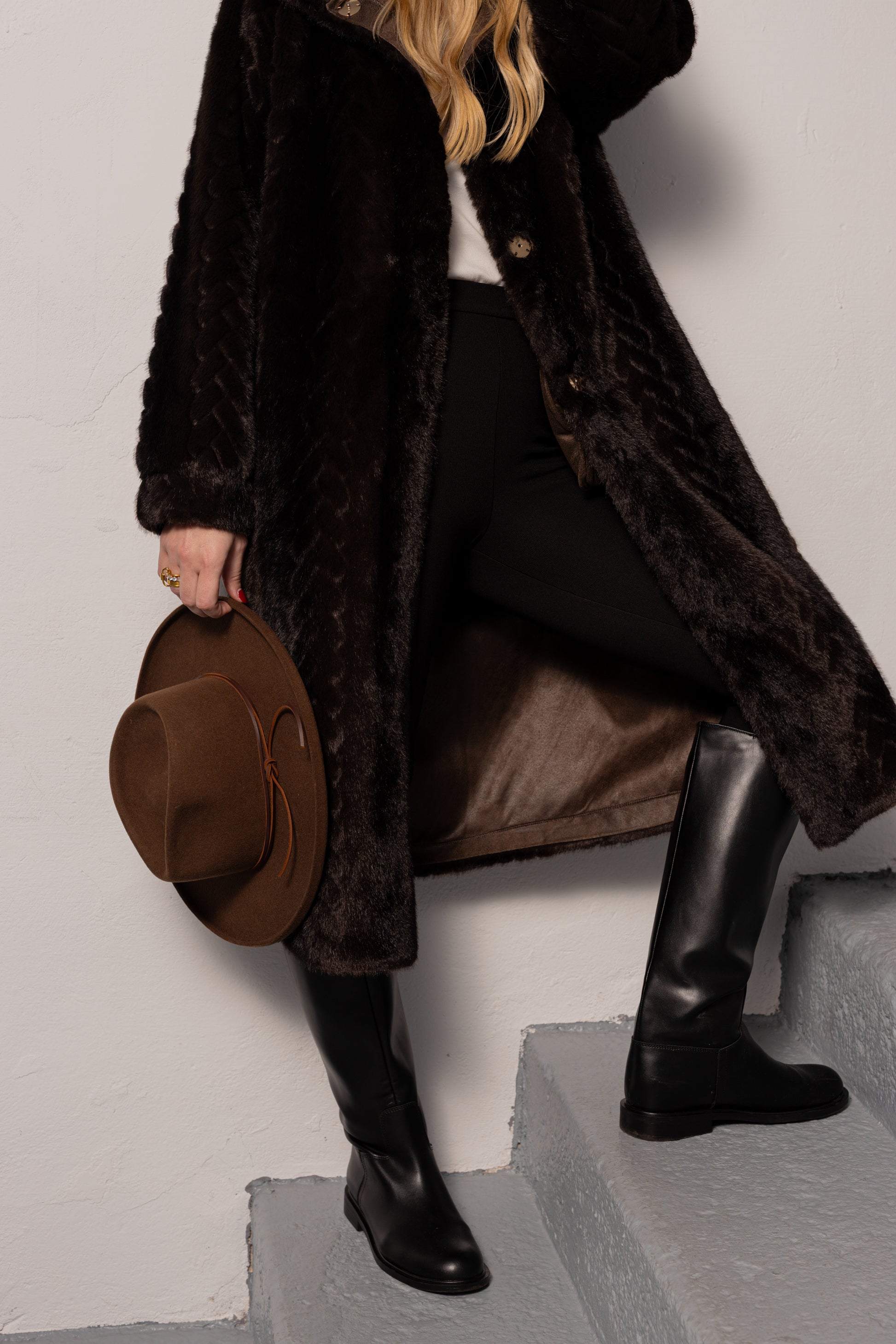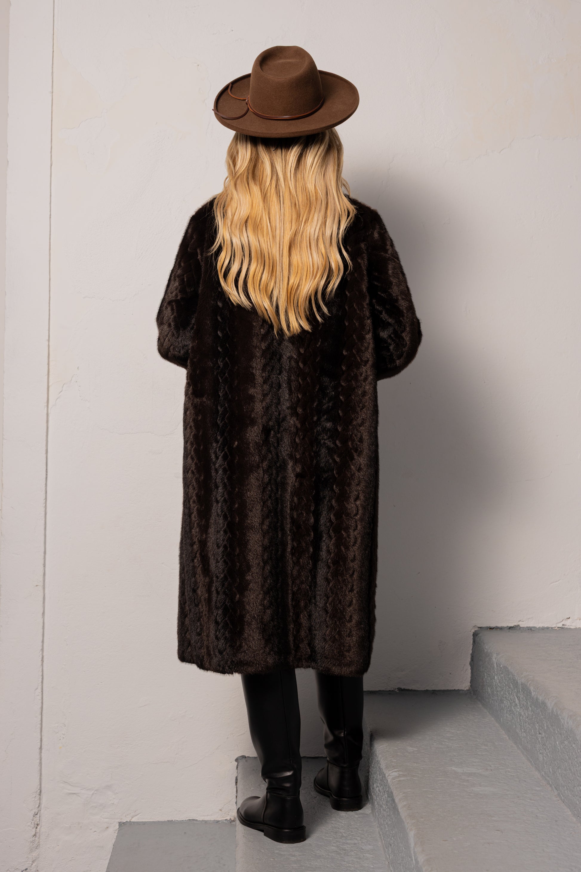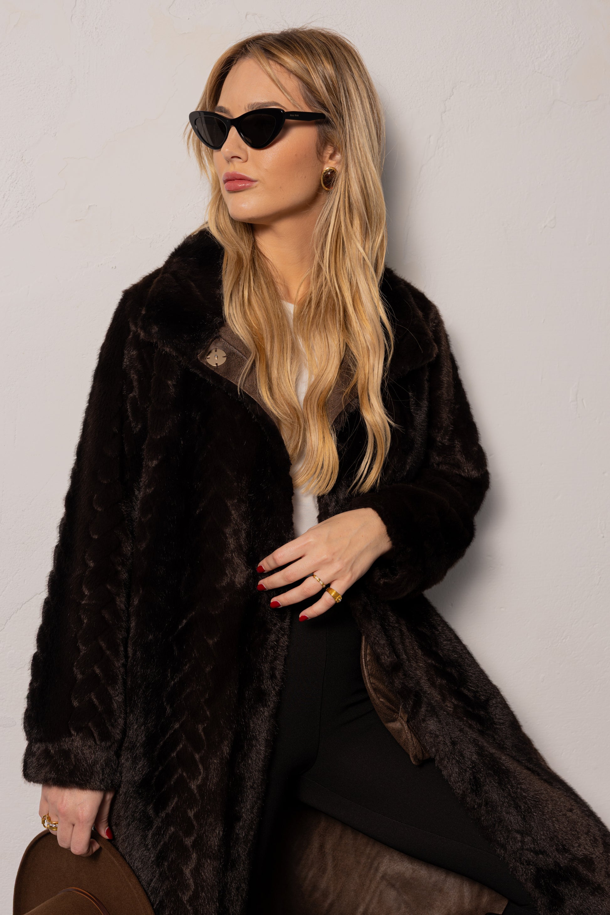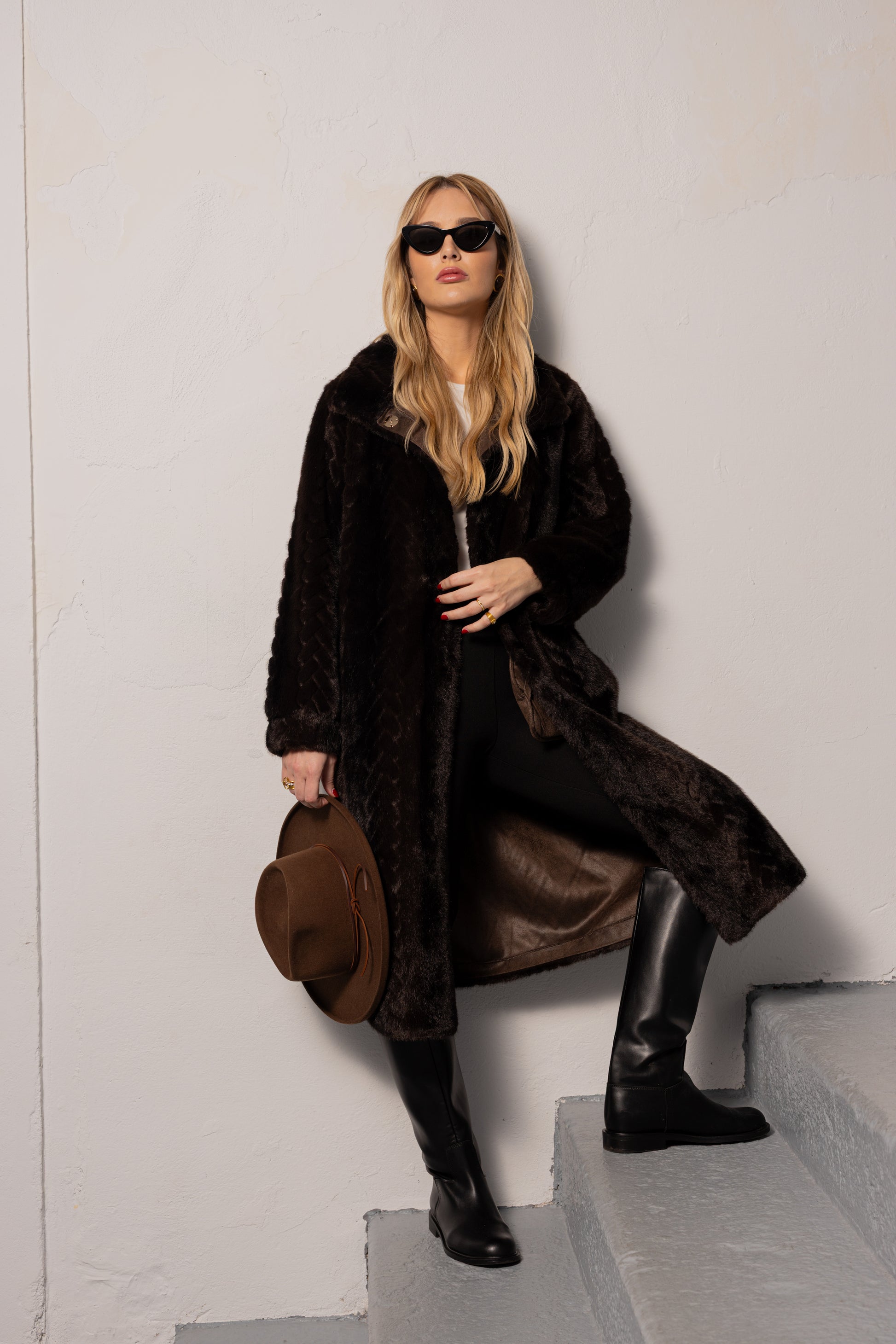 Casaco comprido em pelo sintético com textura trabalhada em padrão geométrico subtil. Corte reto com gola larga e botões frontais Forro contrastante em camurça.