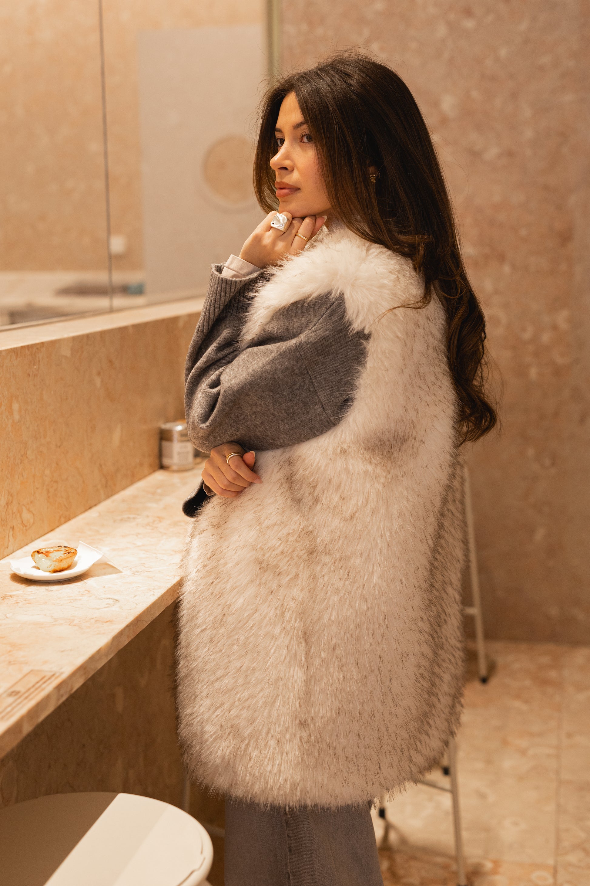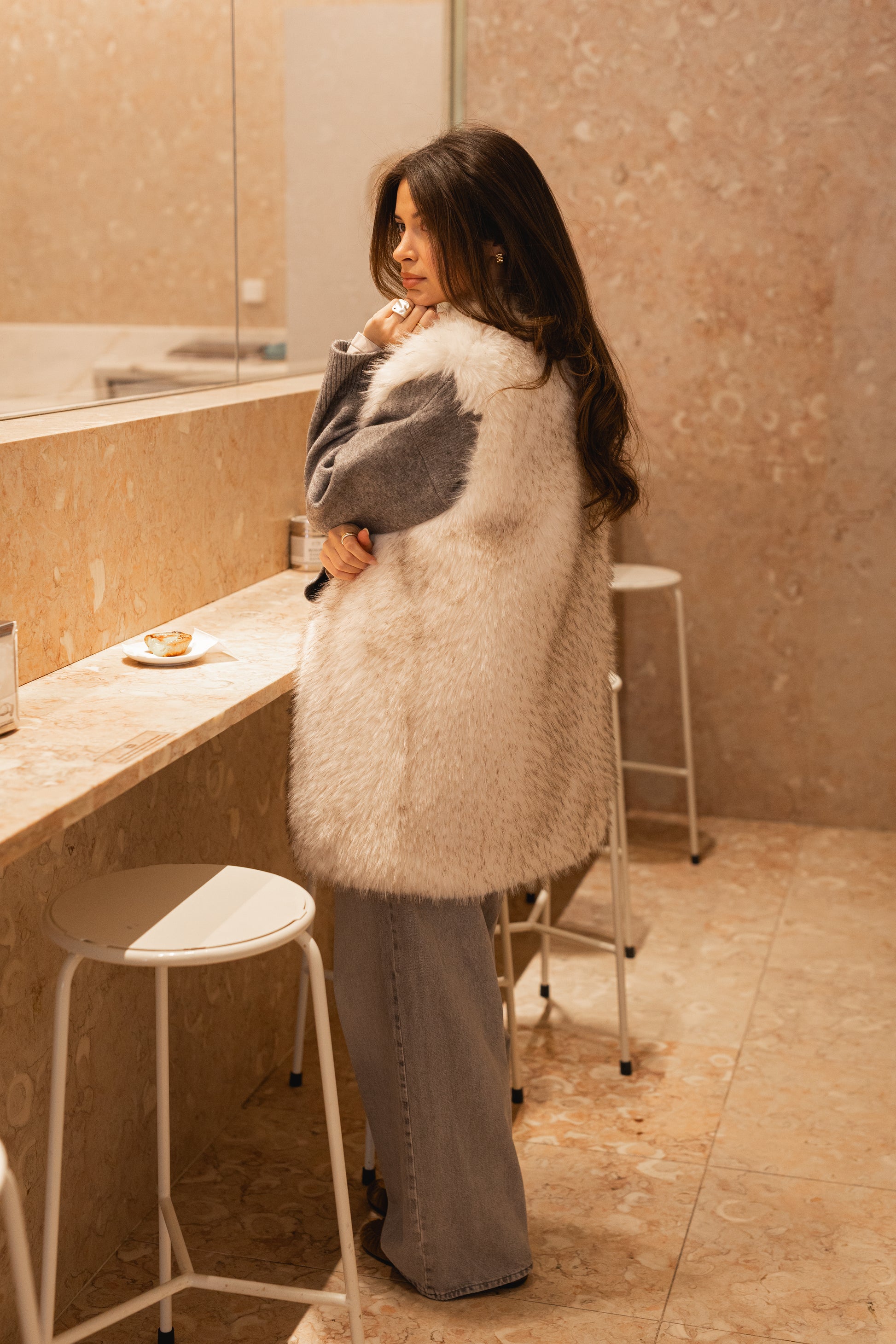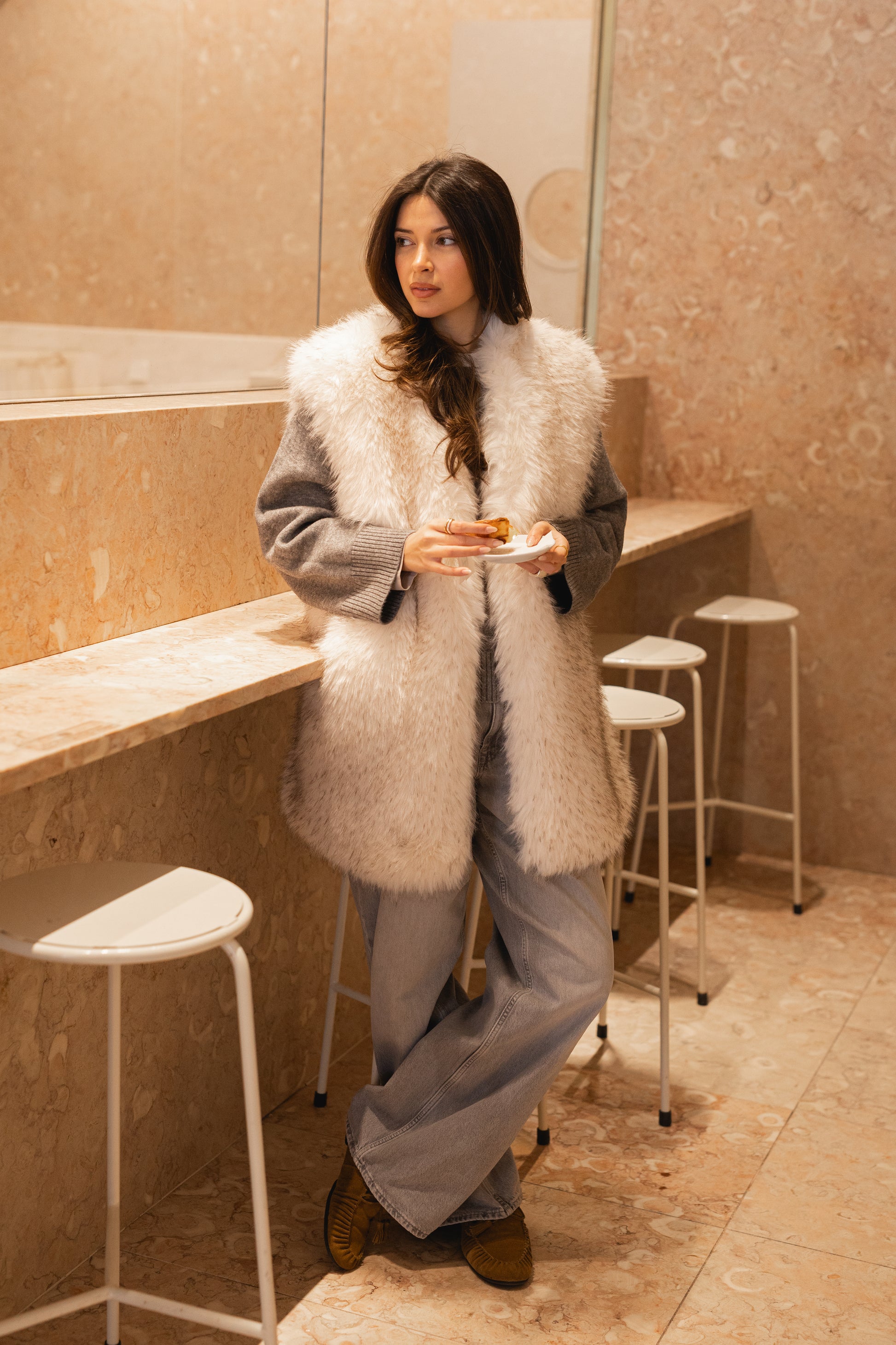 Colete em pelo sintético de tom cru com nuances suaves, de textura macia e comprimento médio. Modelo sem mangas, com gola ampla e design aberto.