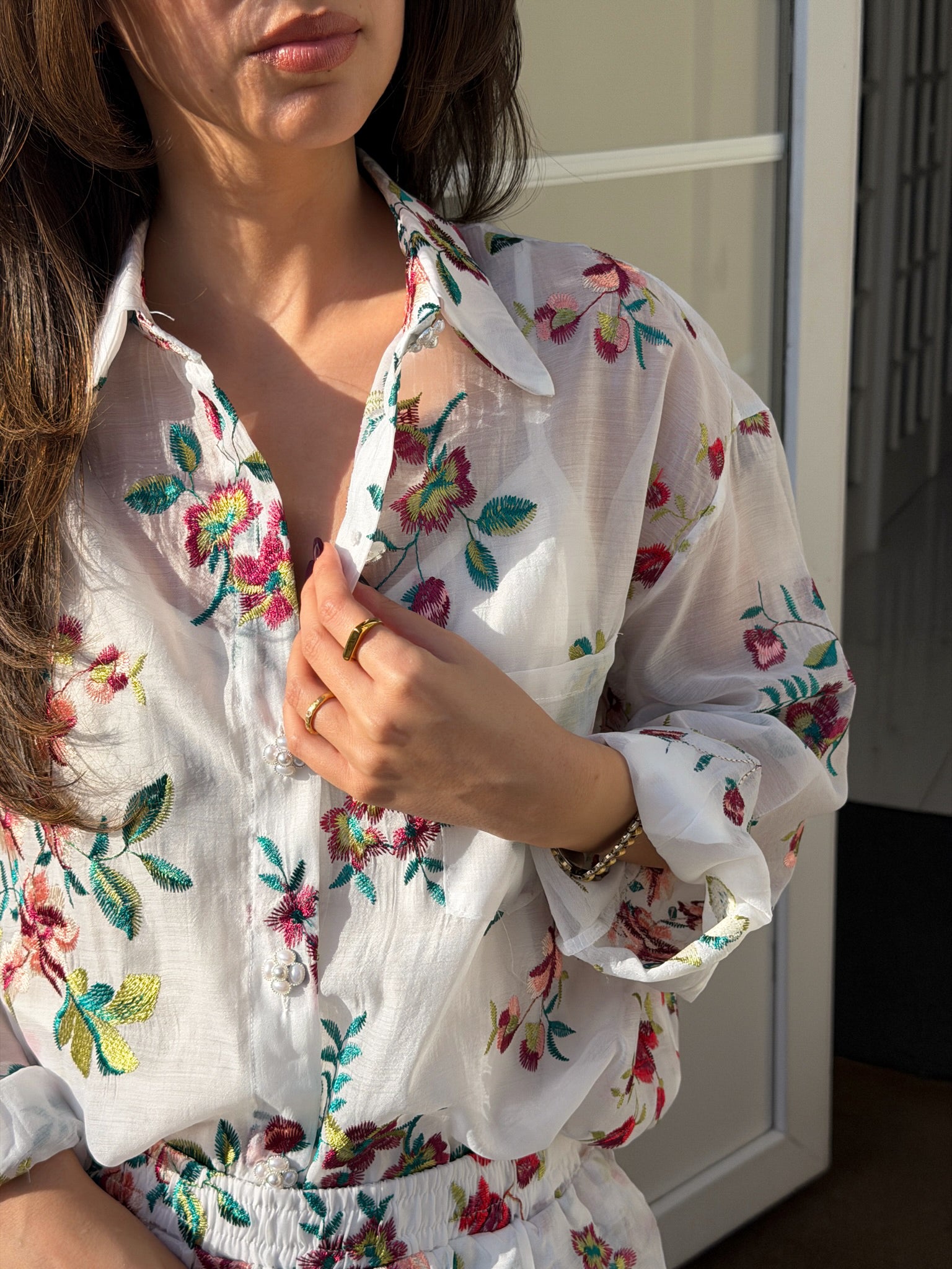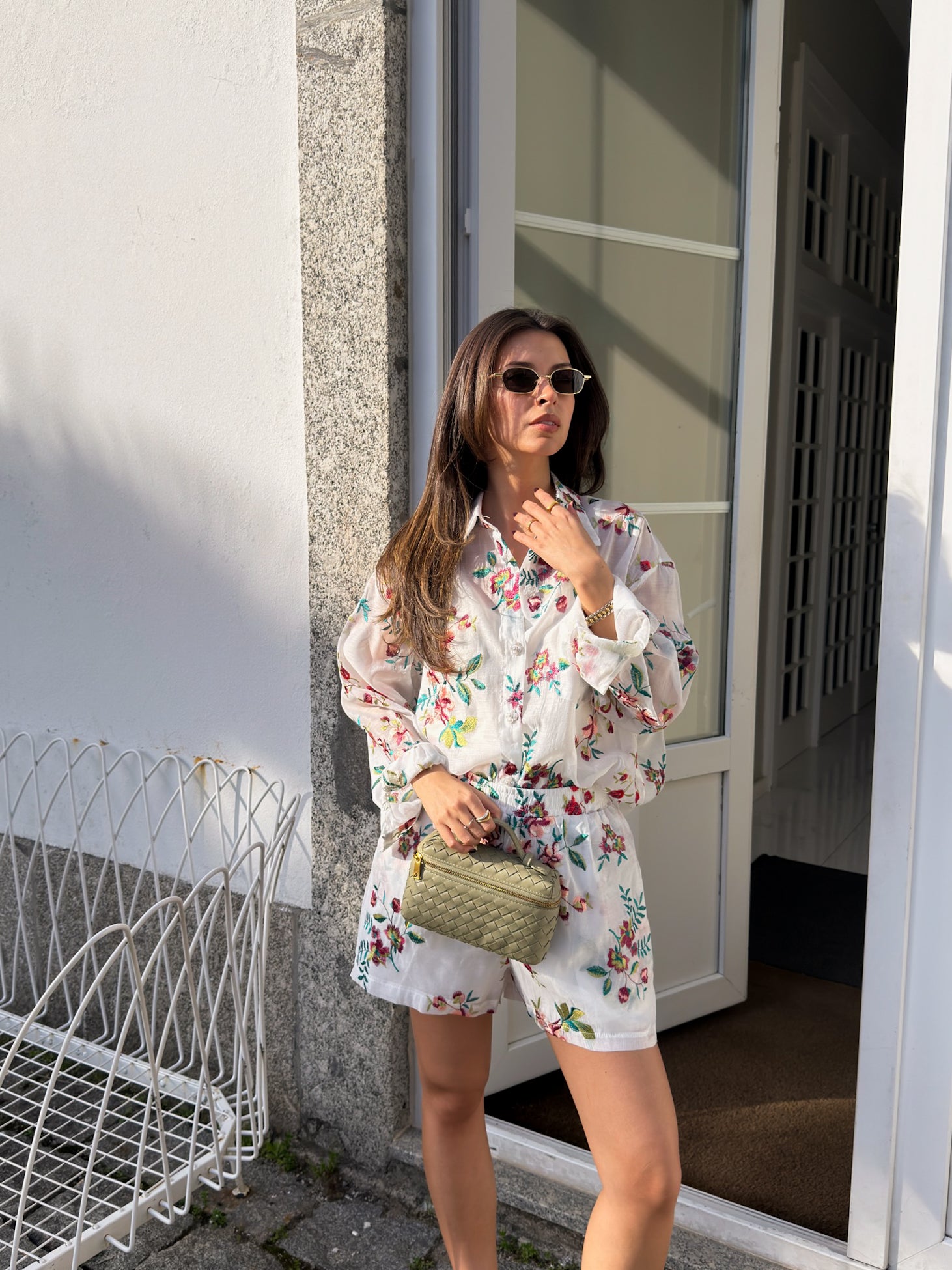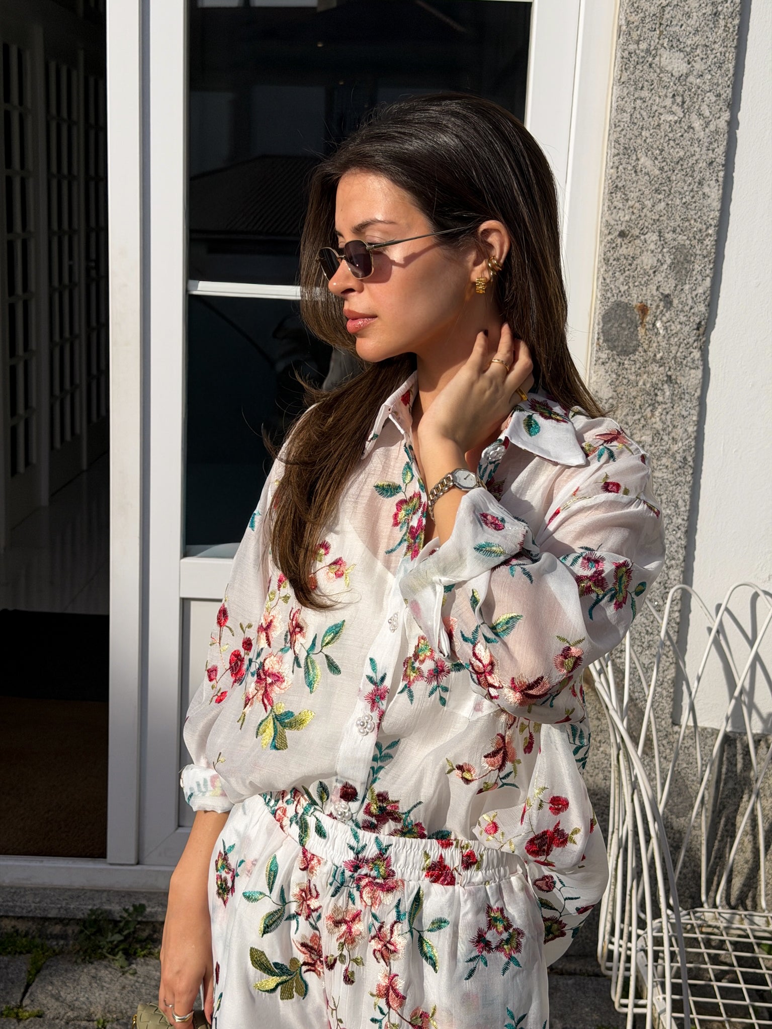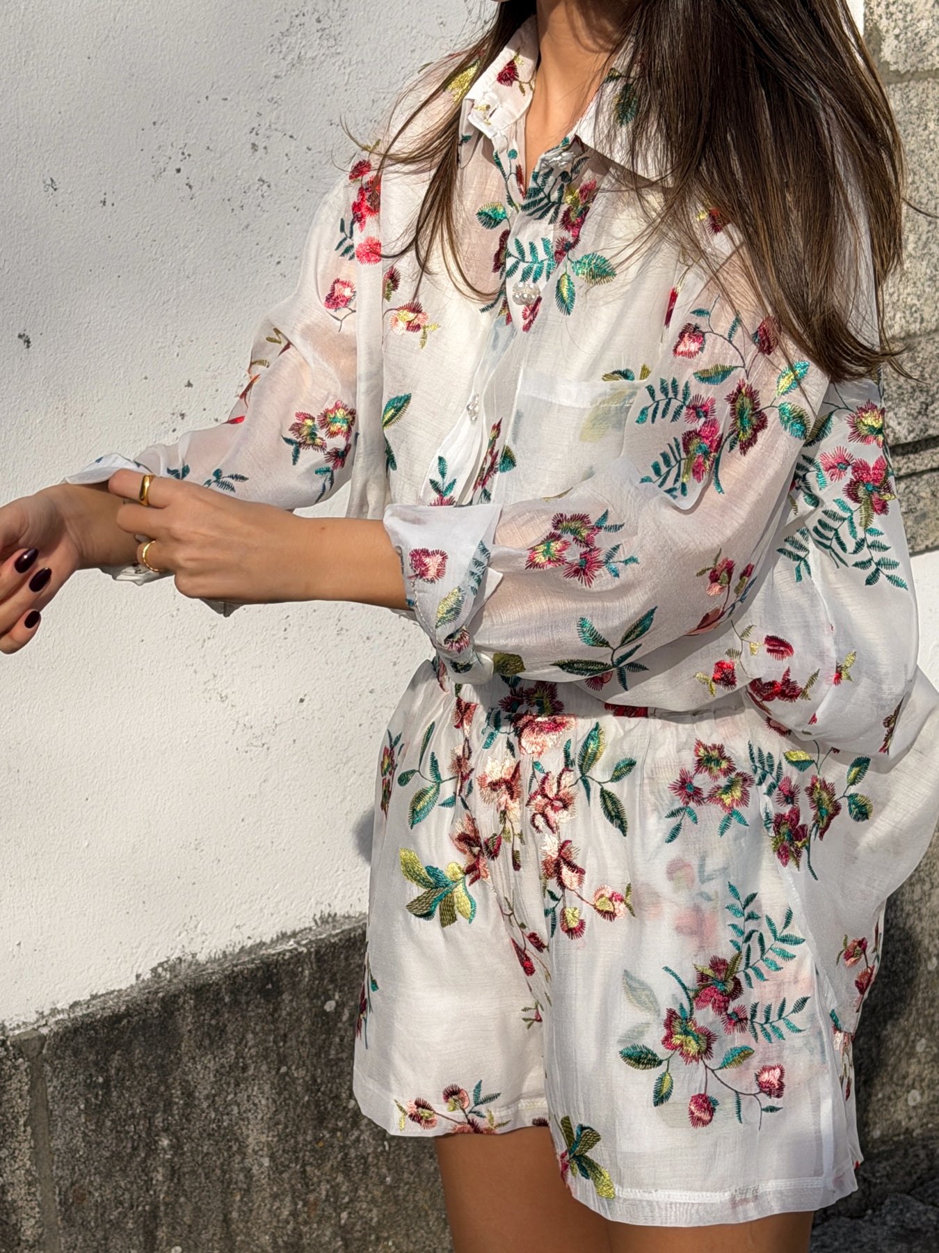 Conjunto leve e feminino composto por camisa e calções em tecido delicado com padrão floral bordado, que combina elegância e frescura. A camisa de corte fluido, com gola clássica e botões frontais, destaca-se pelas mangas amplas e ligeiramente transparentes, que acrescentam um toque romântico e sofisticado.