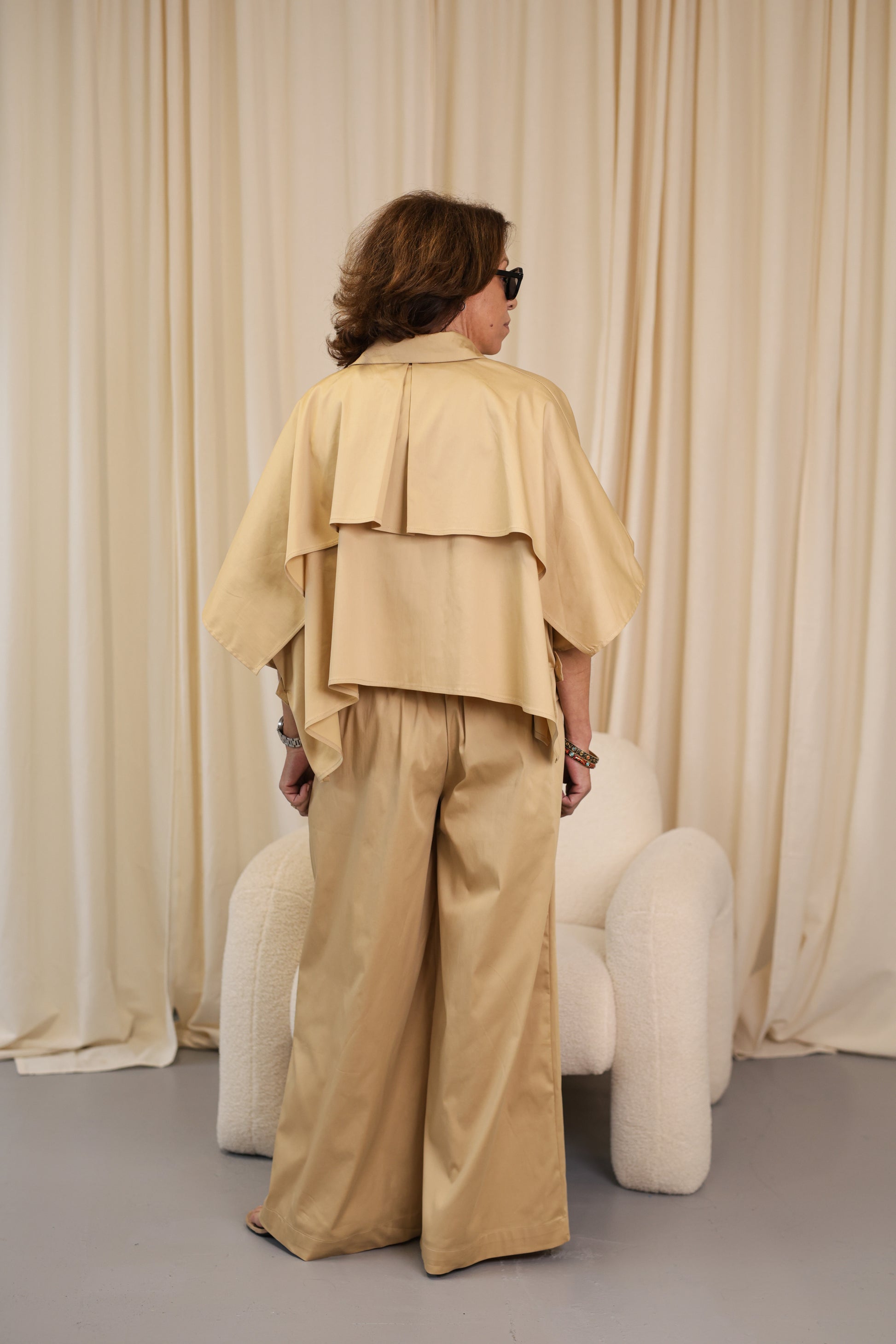 Conjunto bege coordenado que combina elegância e modernidade em uma proposta monocromática sofisticada. A camisa de design fluido harmoniza perfeitamente com a calça de corte amplo, criando uma silhueta leve e alongada. Ideal para ocasiões que pedem um look refinado sem abrir mão do conforto